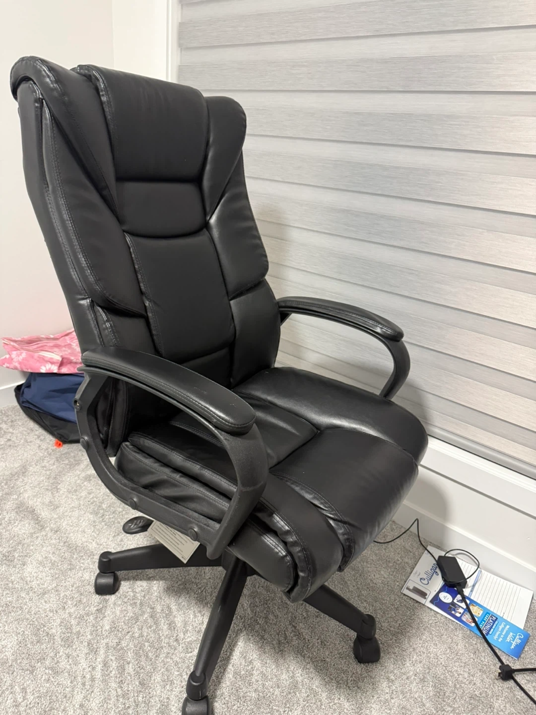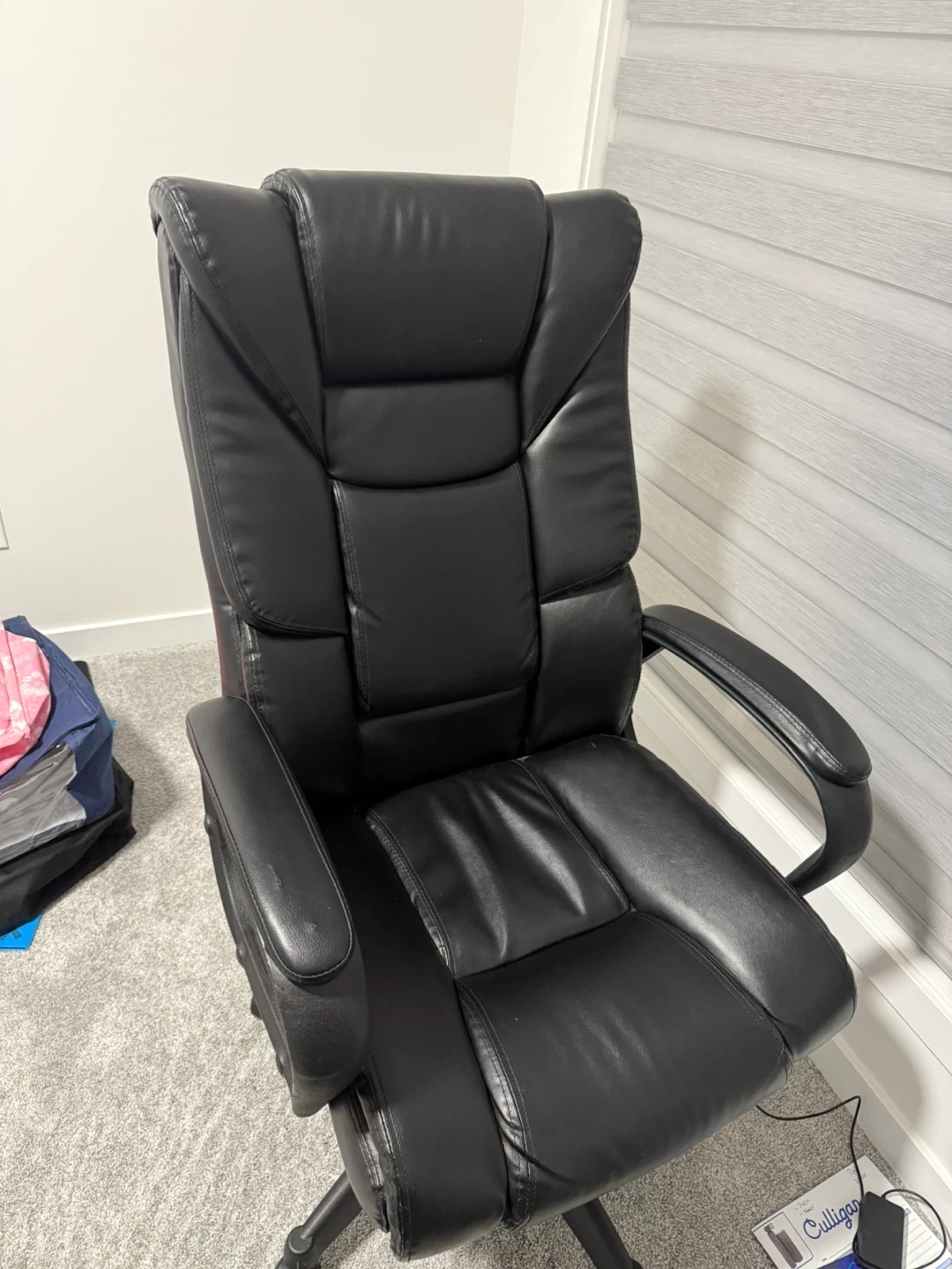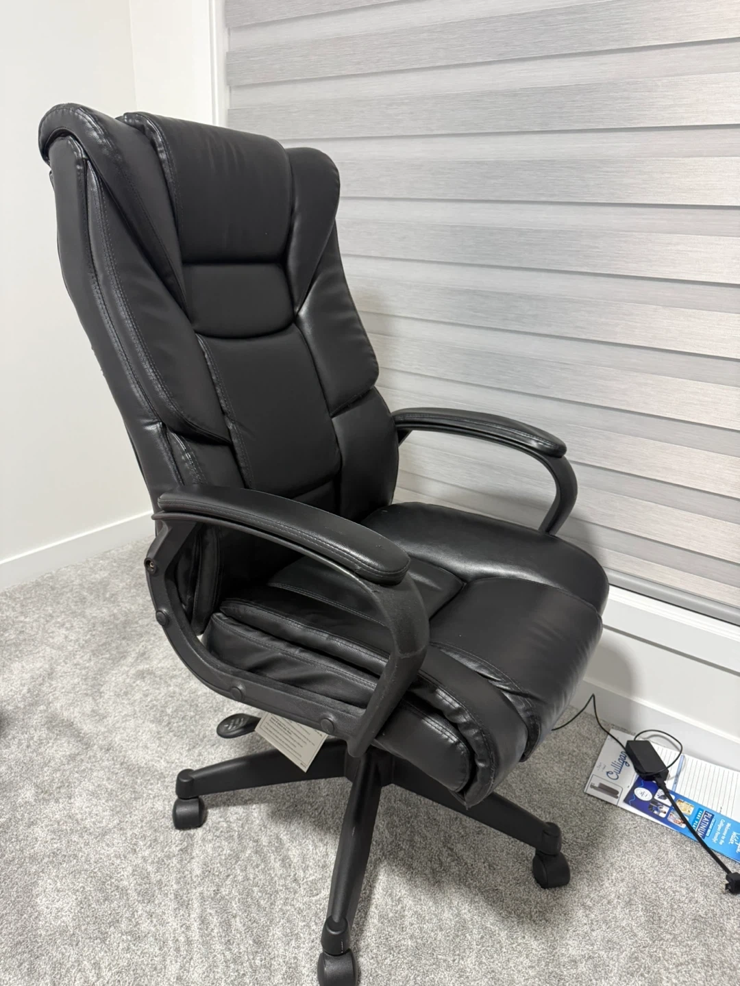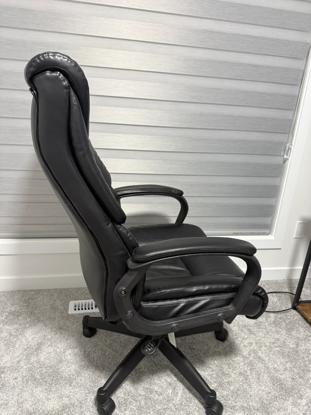 Looking to sell this comfortable black leather executive office chair. It's in good condition and perfect for working from home or in the office. The chair has a high back for great support and adjustable height to suit your needs. It's a great addition to any workspace!