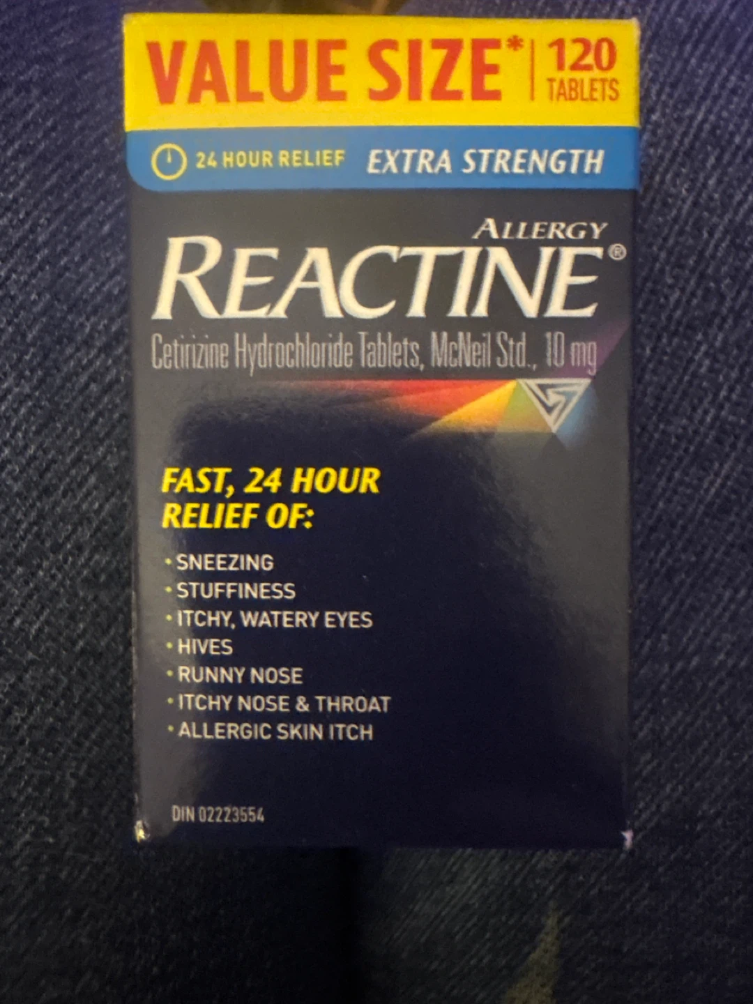 I'm selling a value size box of Reactine allergy tablets. This box contains 120 tablets of extra strength, 24-hour allergy relief. Reactine provides fast relief of sneezing, stuffiness, itchy, watery eyes, hives, runny nose, itchy nose and throat, and allergic skin itch
