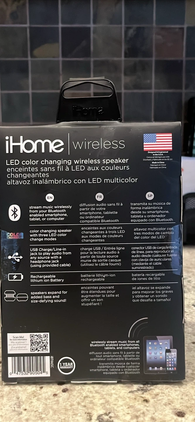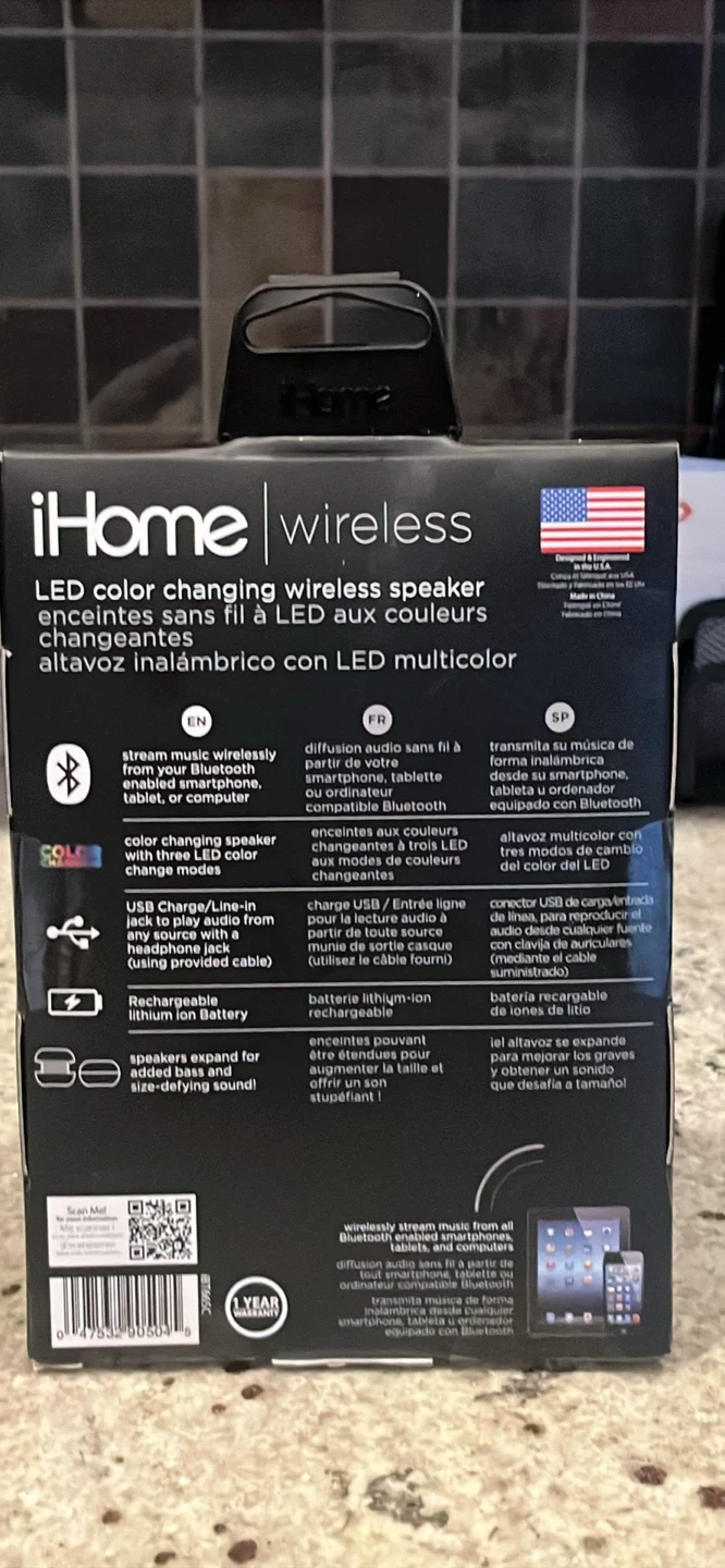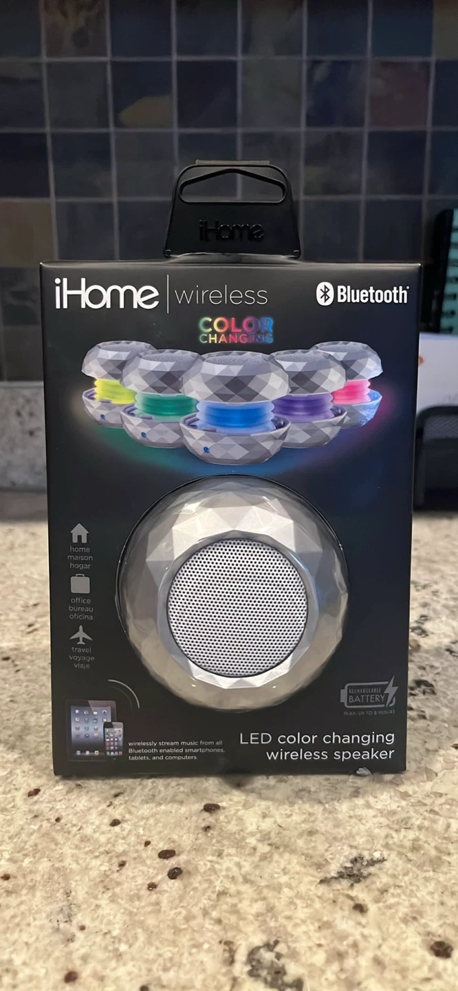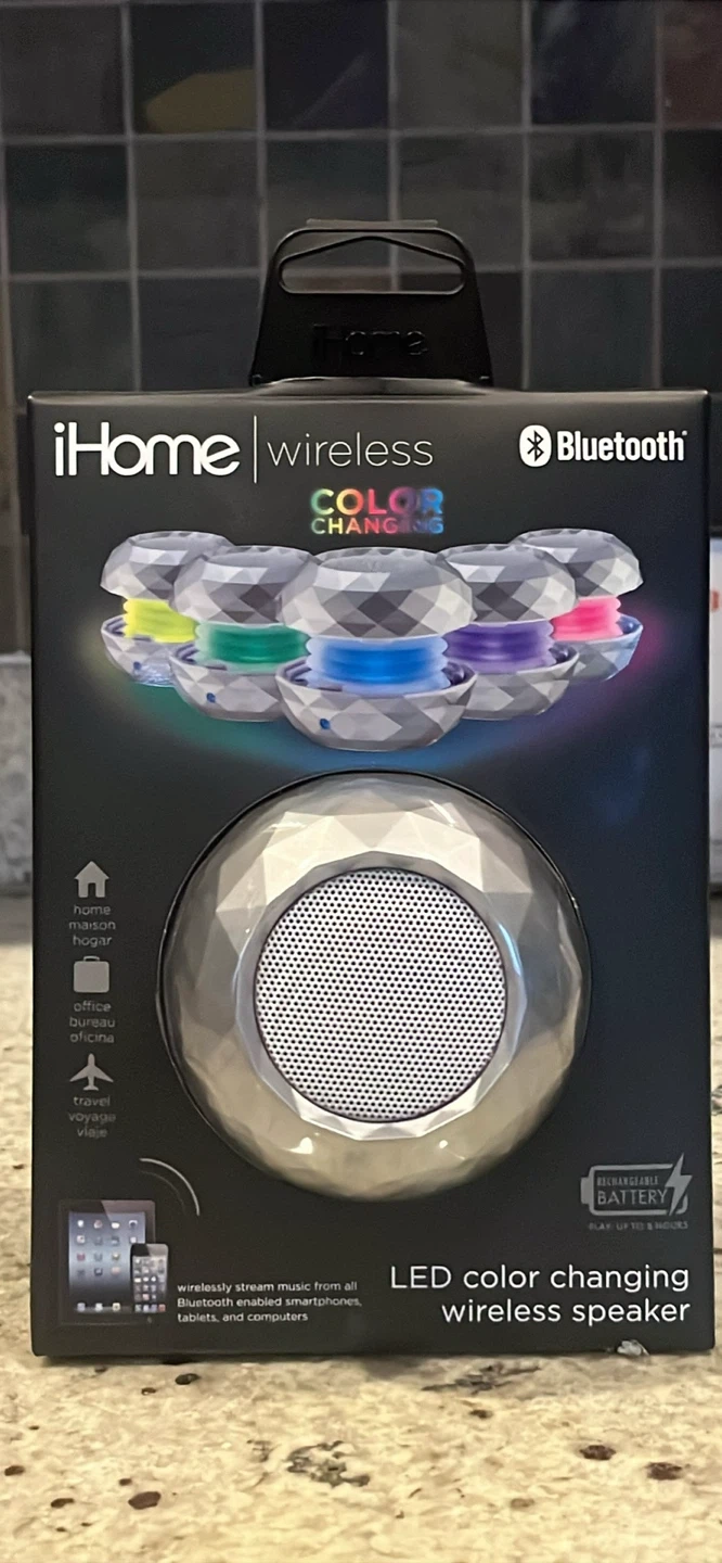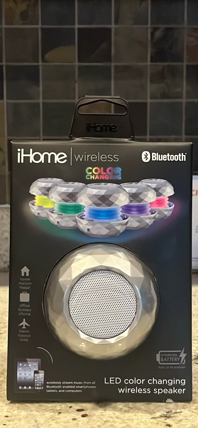 Selling a brand new iHome wireless speaker! It features LED color changing lights and can stream music wirelessly from Bluetooth enabled smartphones, tablets, and computers. The speakers expand for size-defying sound! Comes in the original box