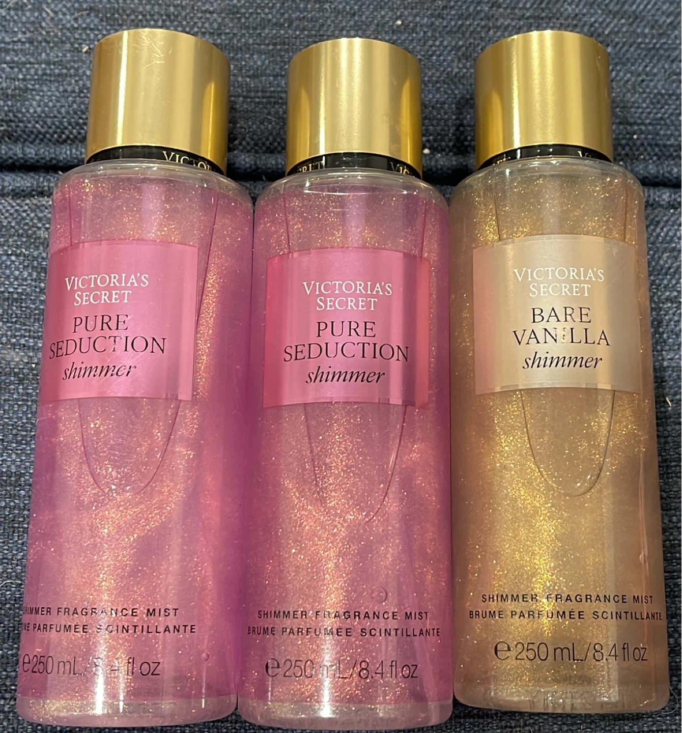 Selling Victoria's Secret Shimmer Fragrance Mist. Each bottle $11,00. contains 250 mL/8.4 fl oz. Available scents include Pure Seduction and Bare Vanilla. Perfect for adding a touch of shimmer and fragrance to your day