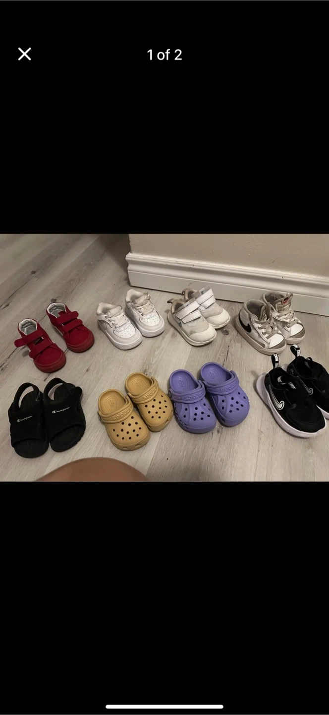 Selling a variety of baby and toddler shoes. Includes brands like Nike, Crocs, and Champion. Great for a growing little one!
