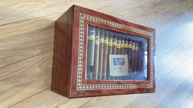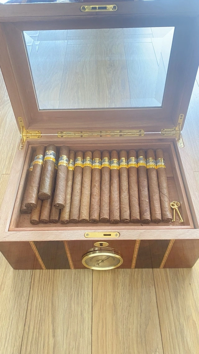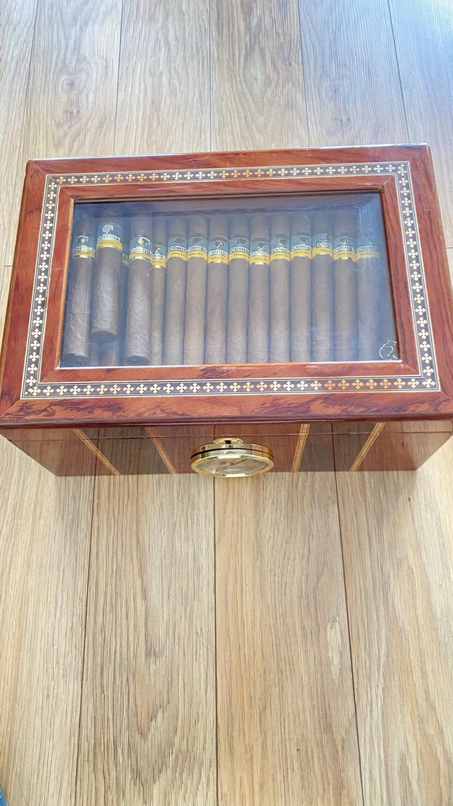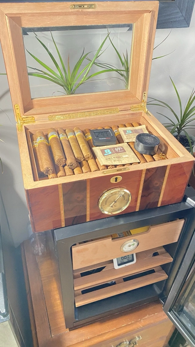 Selling my large desktop humidor. This is a 100-count box—plenty of room for a growing collection. I currently have 50 sticks in there and it’s only half full. It’s built with a high-gloss exterior and a glass display lid so you can see your collection without breaking the seal. The interior is fully lined with Spanish cedar and holds humidity perfectly. The layout is great for organization: it has a removable cedar tray and a dedicated central slot for the humidifiers to keep the airflow consistent throughout the box. The built-in analog hygrometer on the front is tested and works exactly as it should. Condition: Excellent. Well-maintained, holds a rock-solid seal, and has no scratches. I still have the original retail box for it as well. Includes: