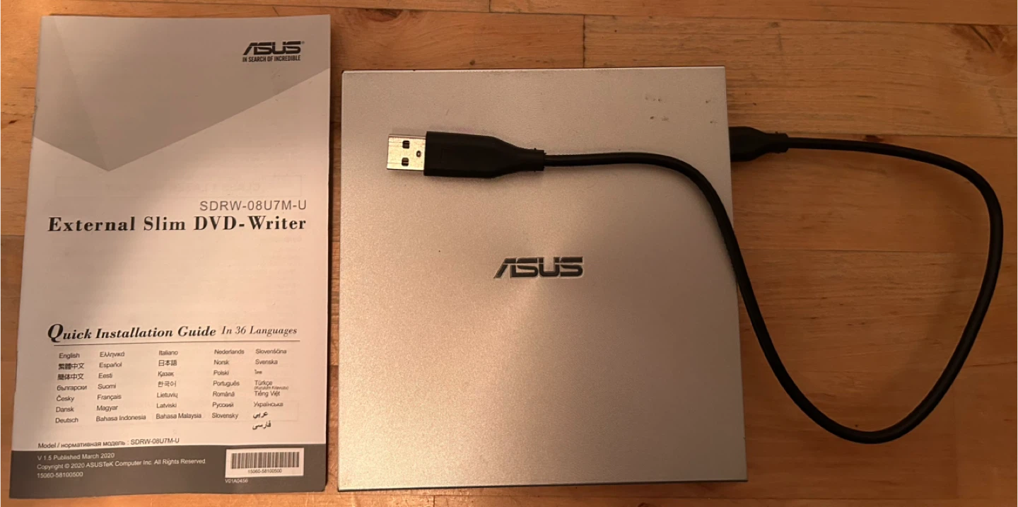Selling an ASUS SDRW-08U7M-U external slim DVD writer. It comes with the quick installation guide.