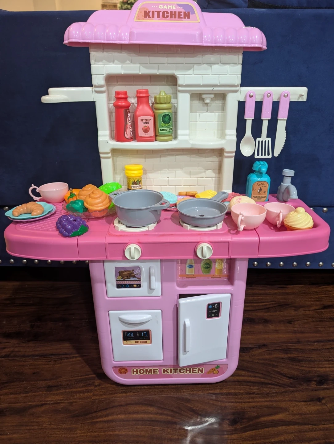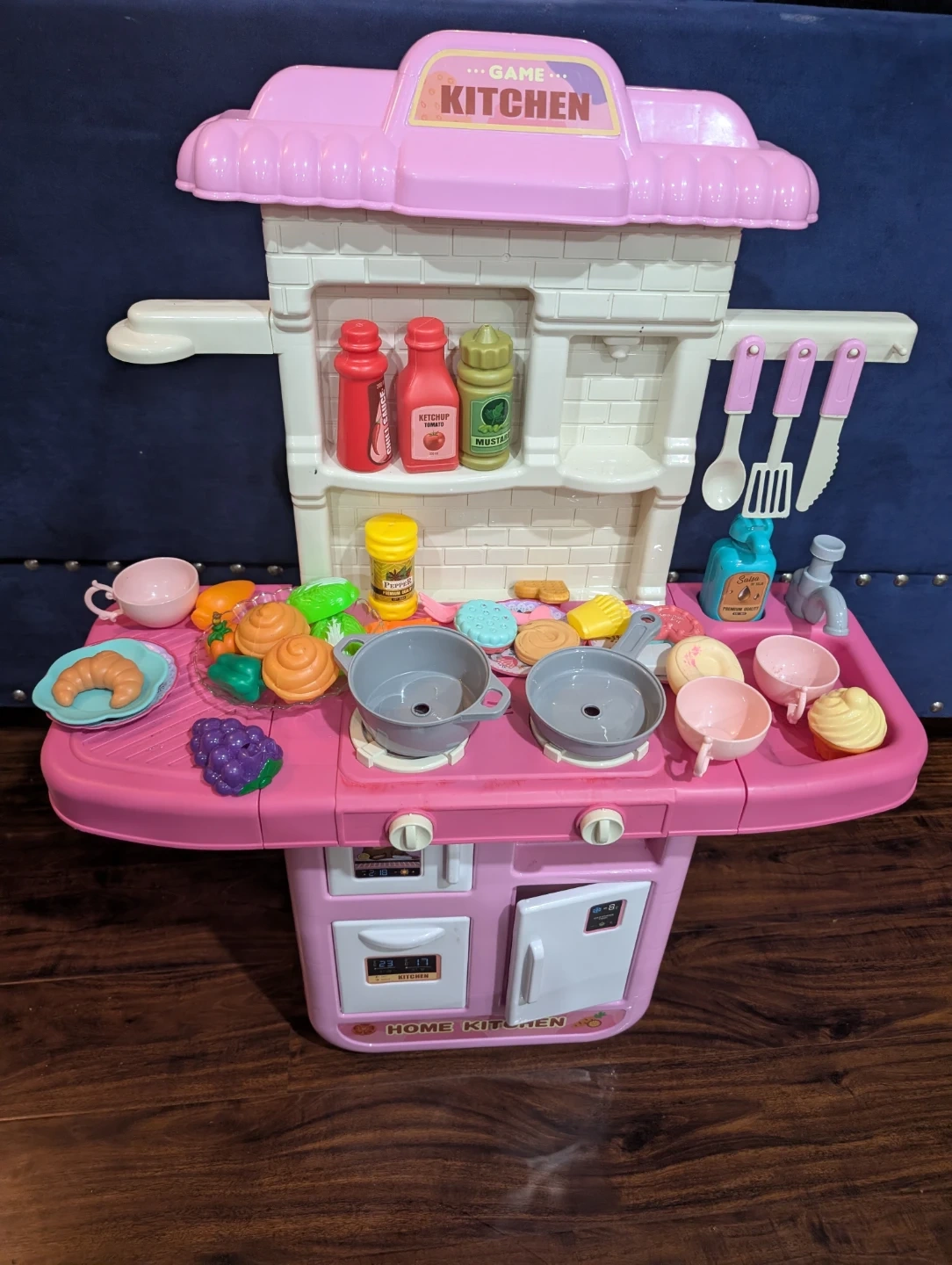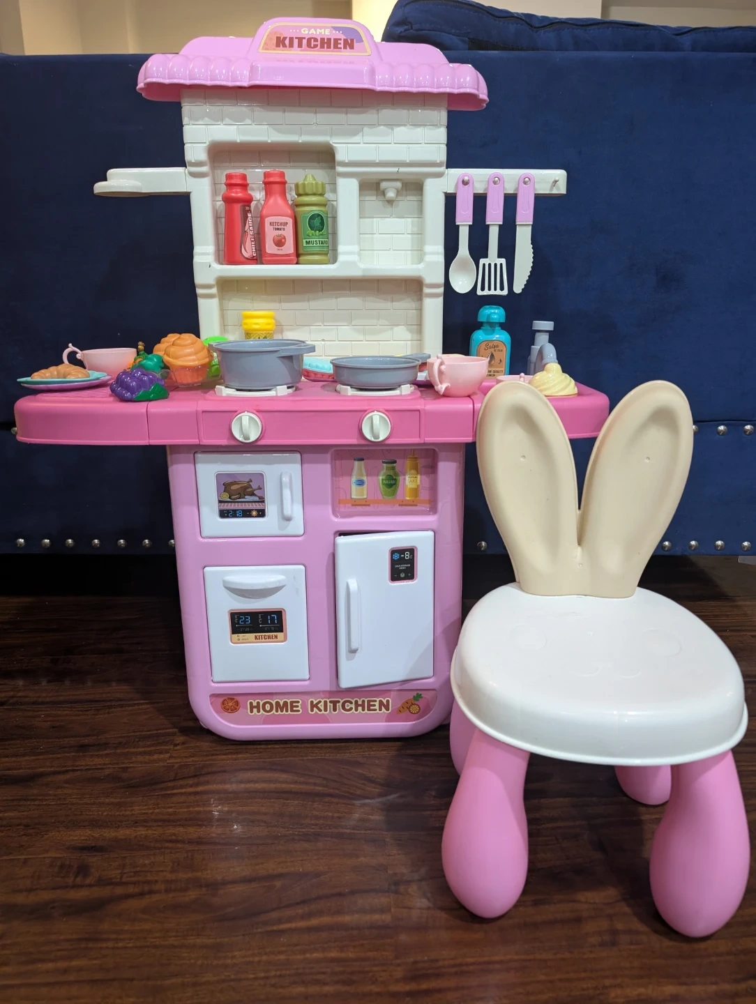 A cute pink toy kitchen set for your little one! It comes with various accessories, including pots, pans, condiments, and play food. Perfect for imaginative play and hours of fun! This set comes with a cute bunny chair.