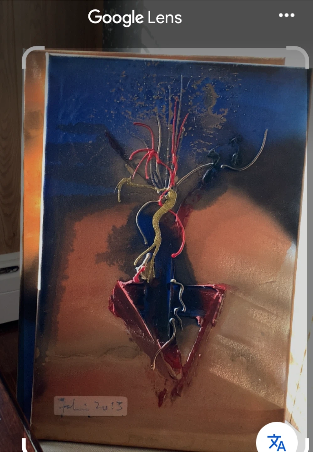Offering a unique abstract painting with a mix of blue, red, and gold accents. The artwork features a textured surface and a distinctive design. The painting is signed and dated 2013.