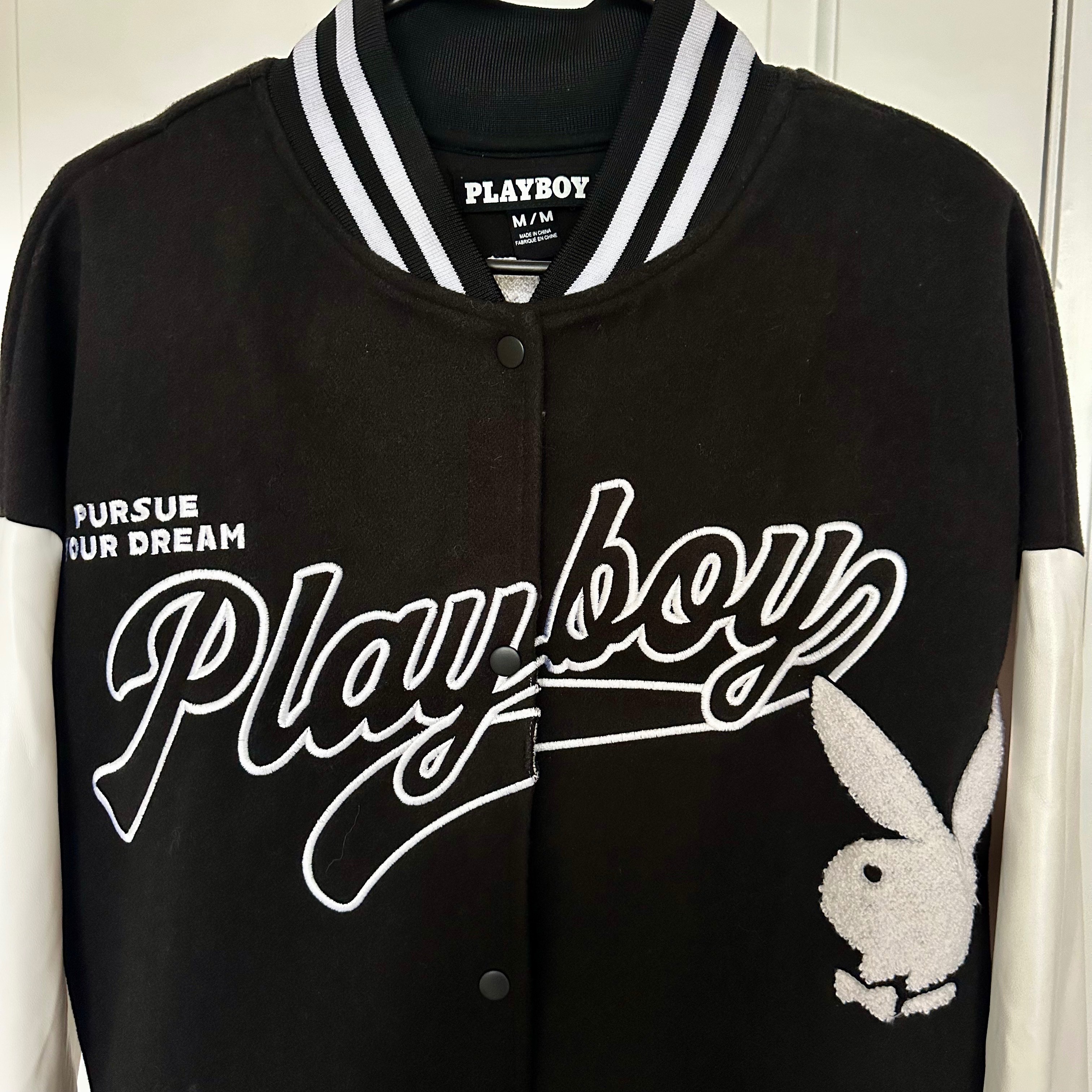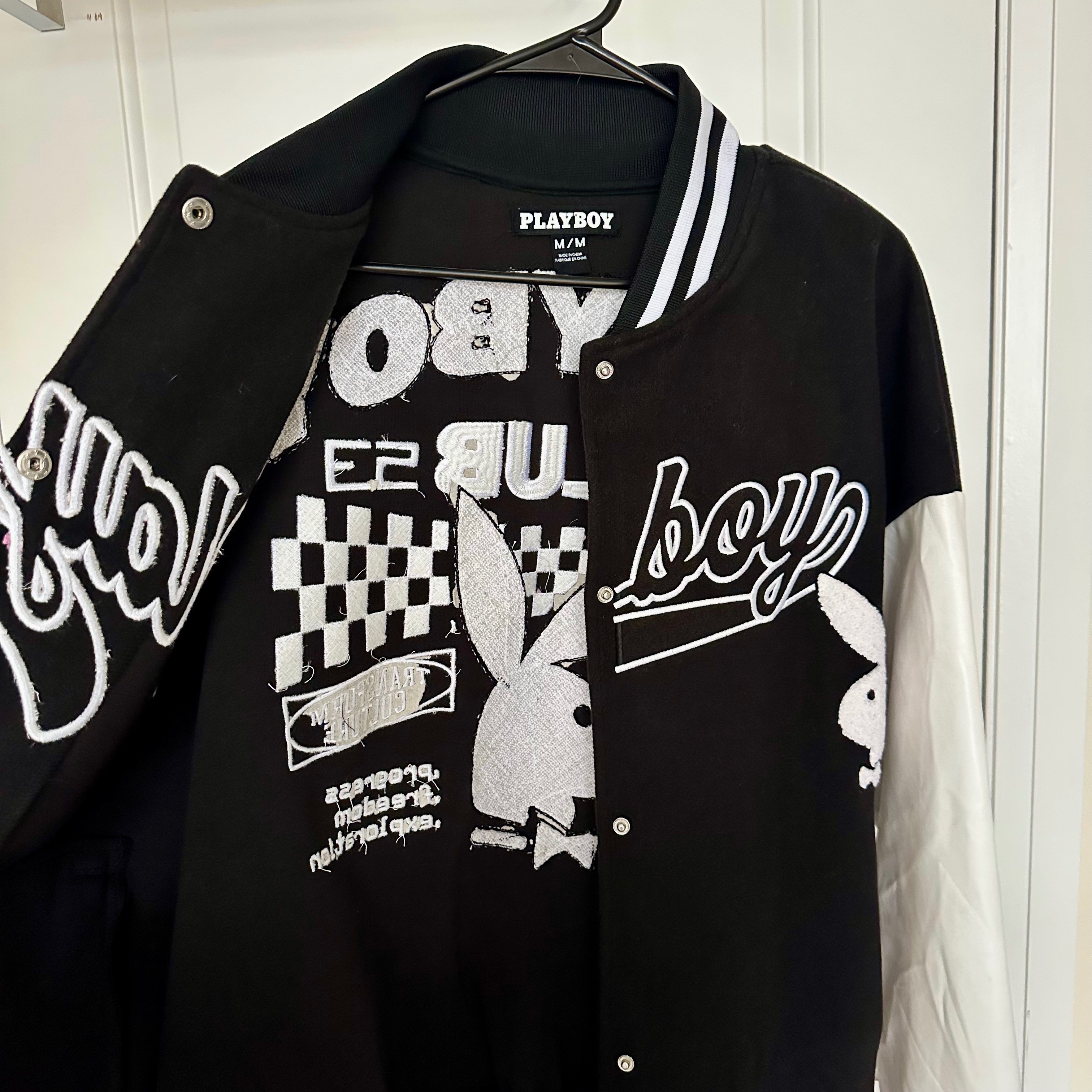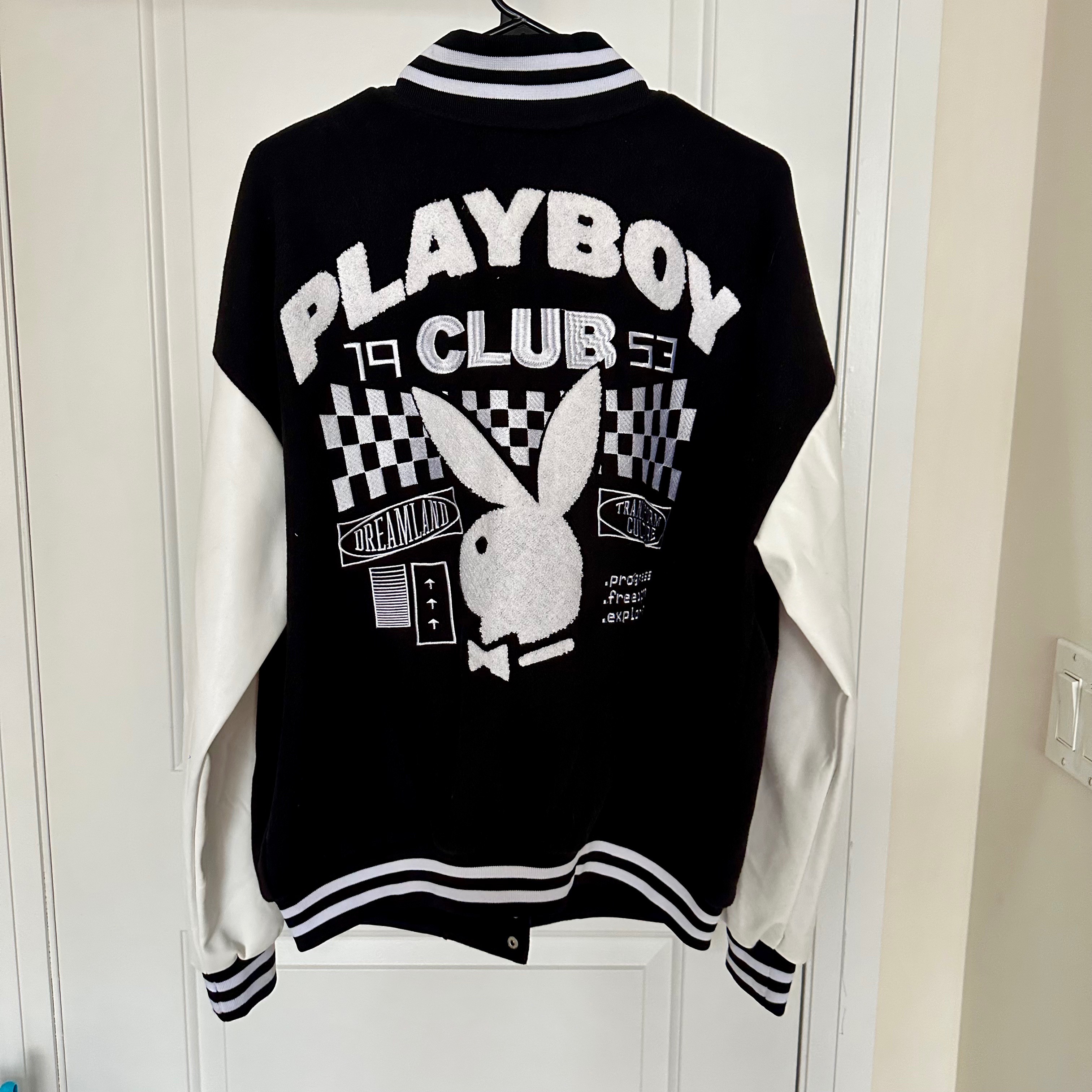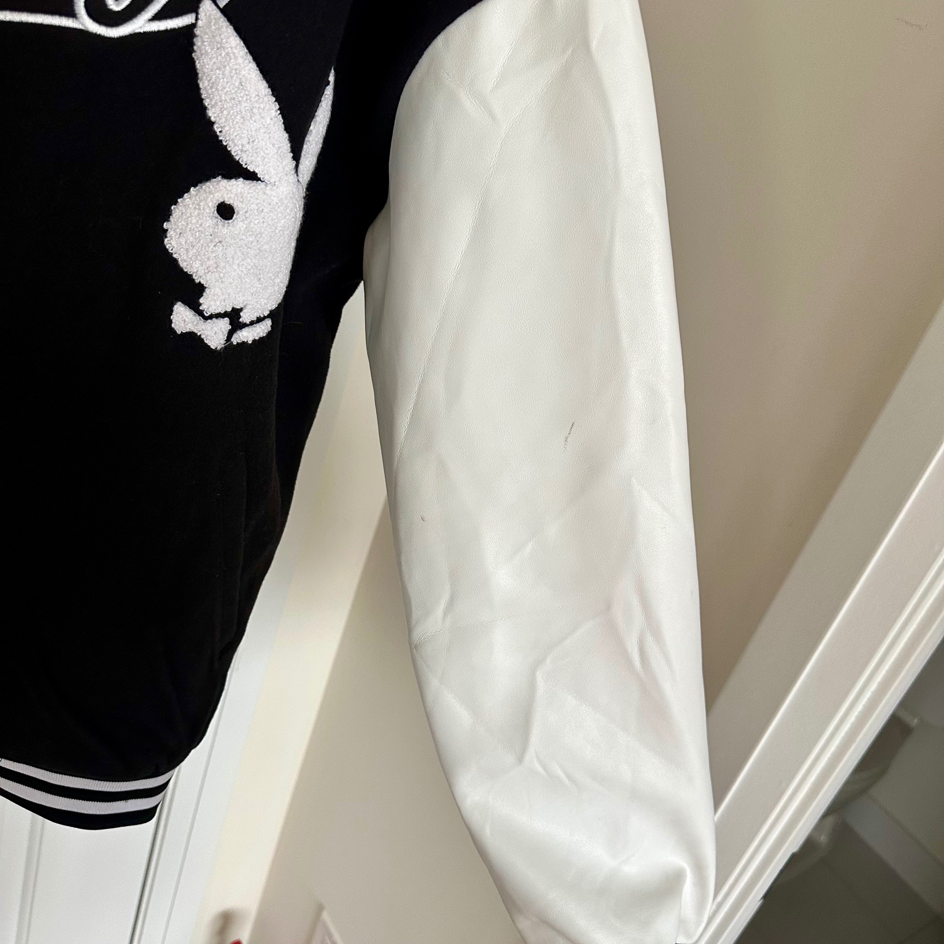 Retro inspired Playboy varsity jacket. Size medium (unisex). Black and white embroidered bunny logo and detailing. In excellent condition (only worn a couple times) and has been sitting in my closet, I just don't reach for it anymore.