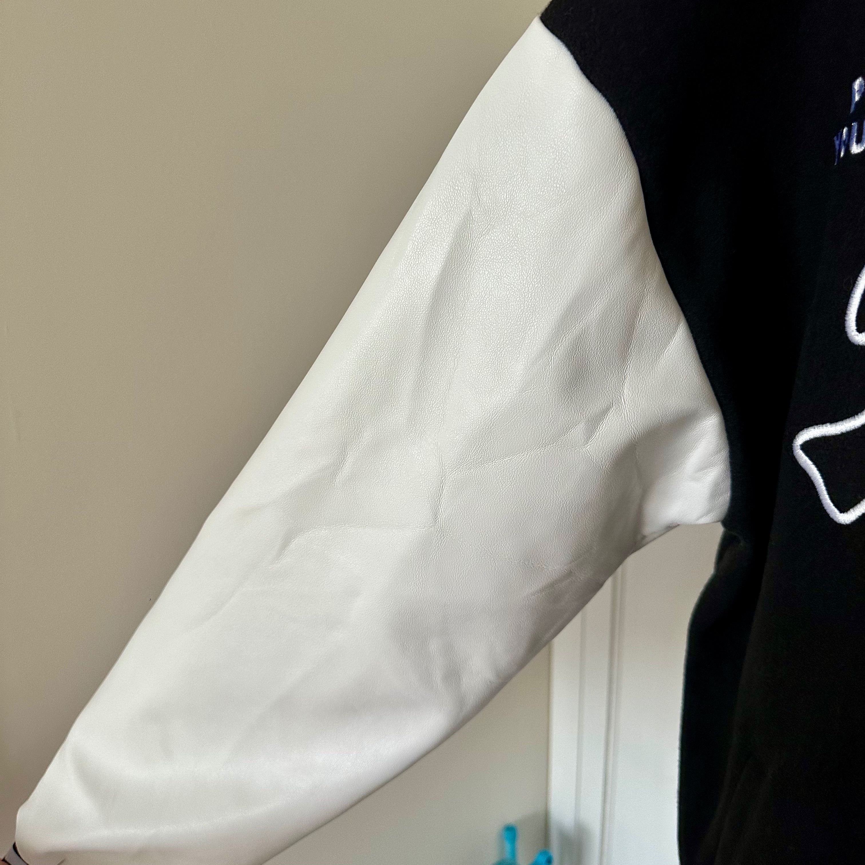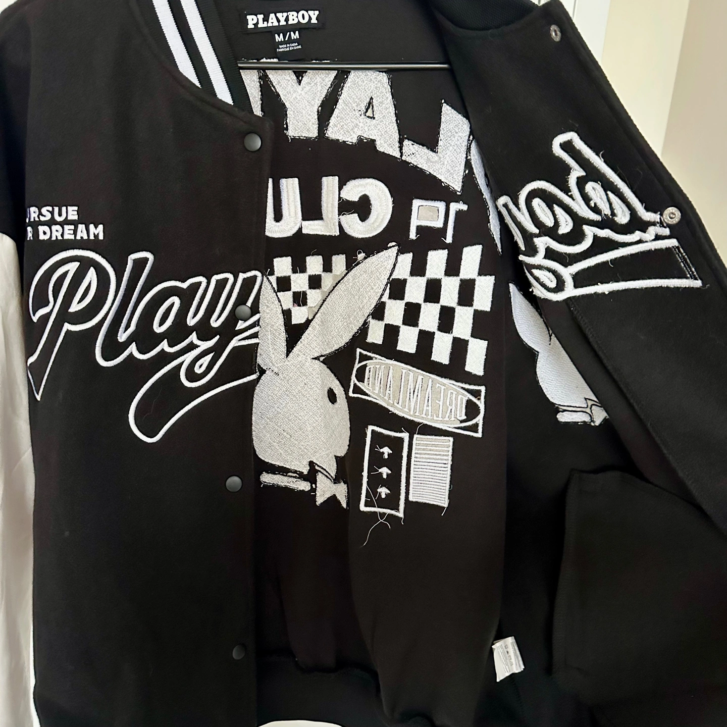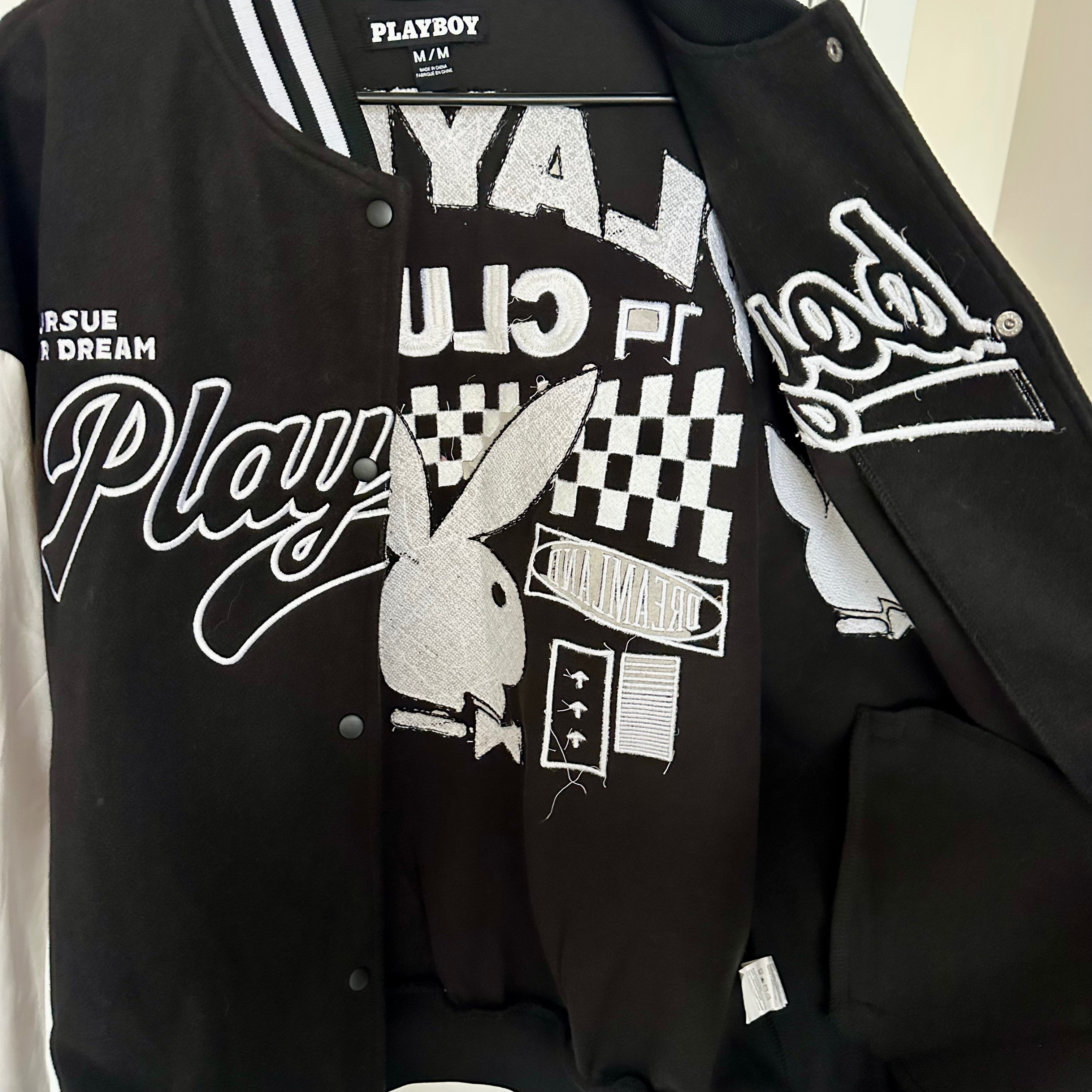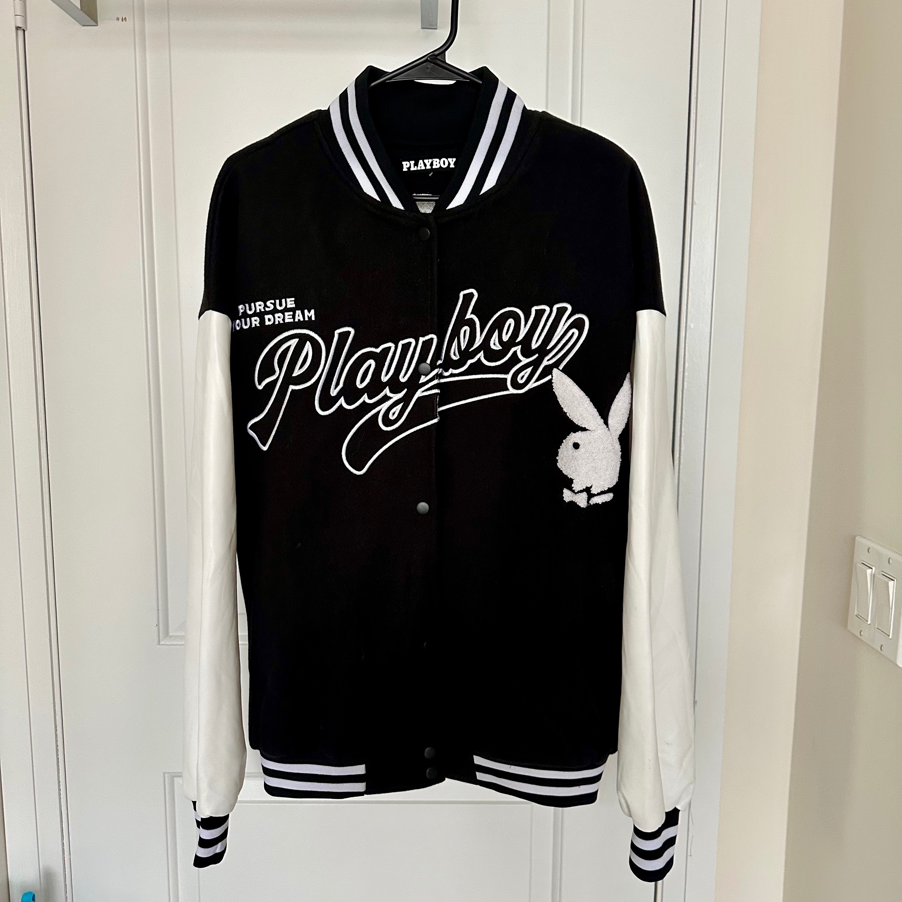 Retro inspired Playboy varsity jacket. Size medium (unisex). Black and white embroidered bunny logo and detailing. In excellent condition (only worn a couple times) and has been sitting in my closet, I just don't reach for it anymore.