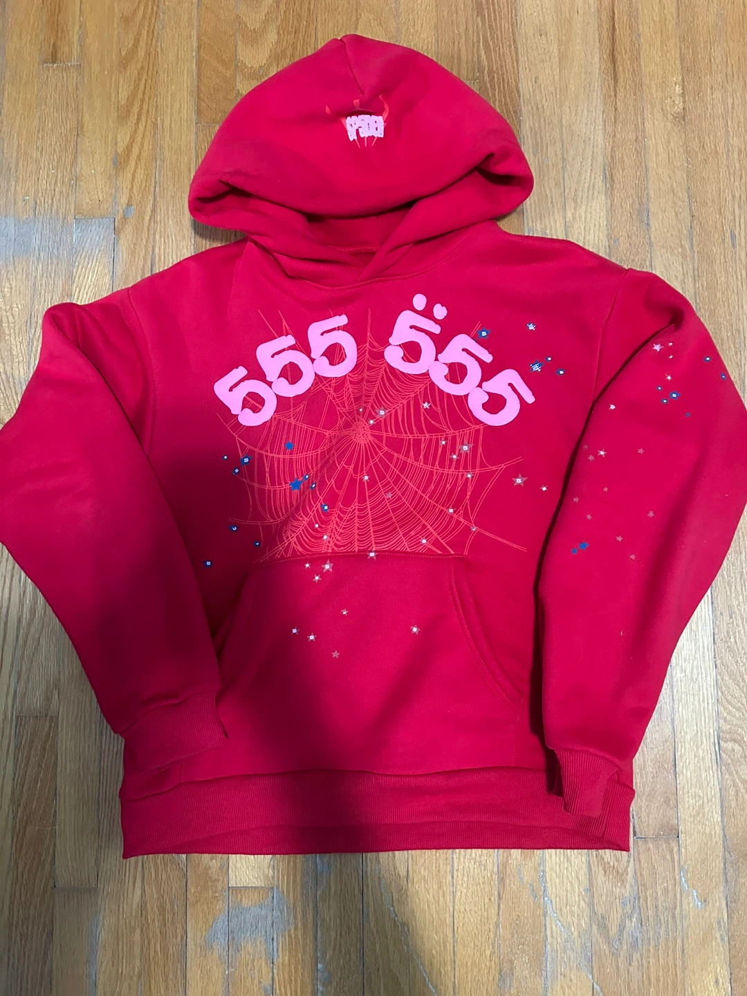 Selling a red SP5DER hoodie. It features a spiderweb design with the number 555. It's in great condition and ready for a new owner!