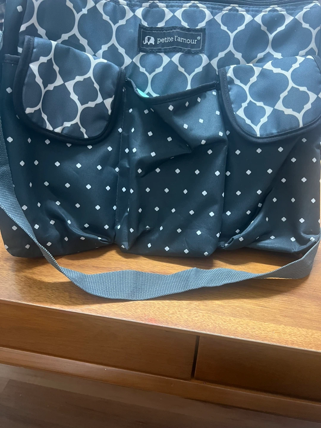 Selling a Petite L'amour diaper bag. It features a stylish navy blue and white pattern with multiple pockets for organization. It has a shoulder strap for easy carrying