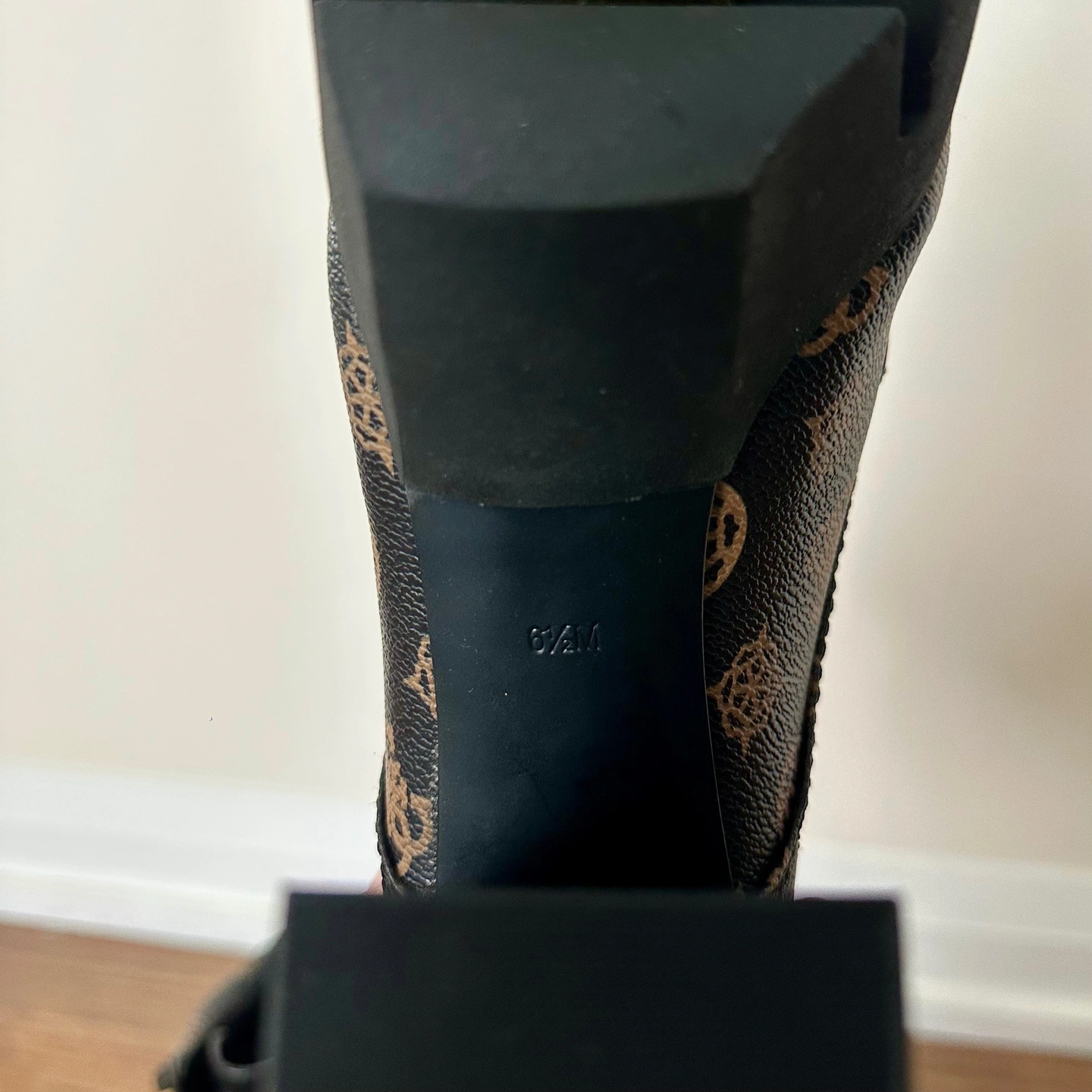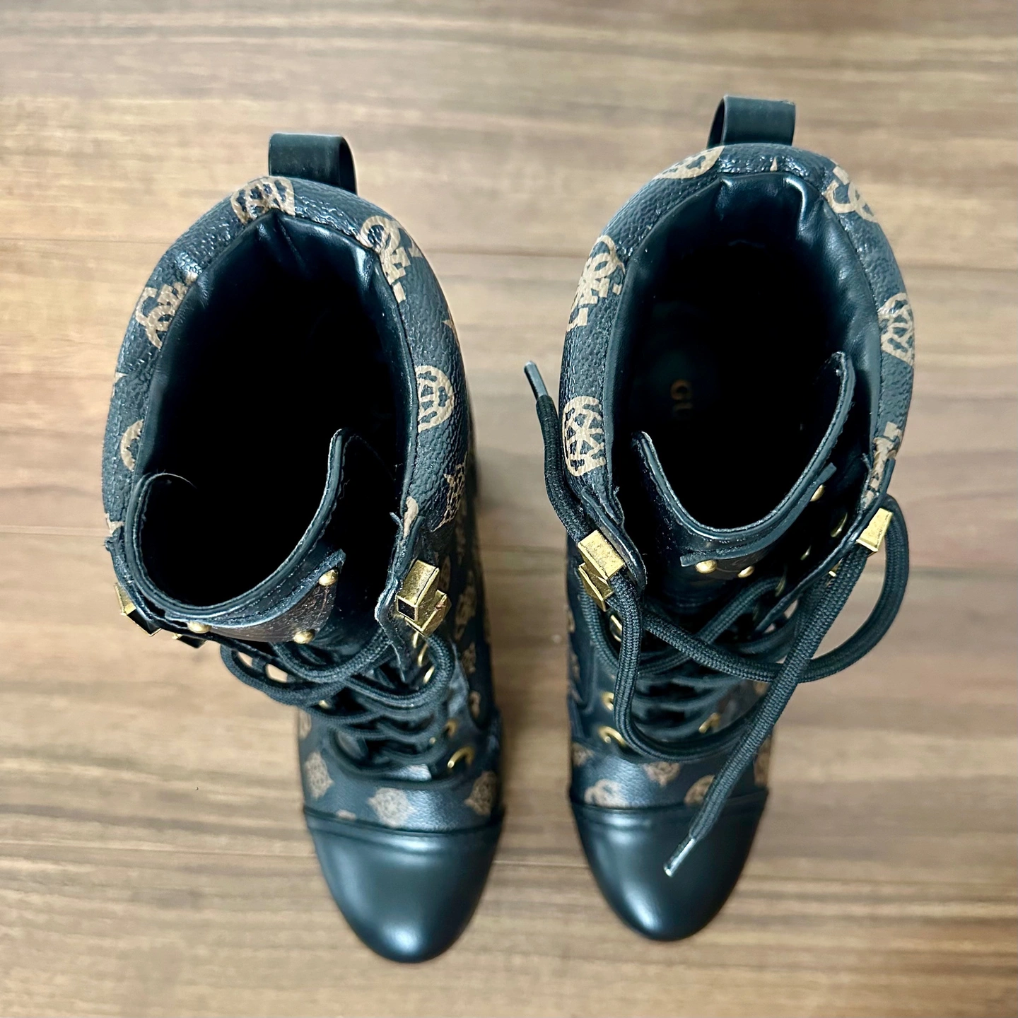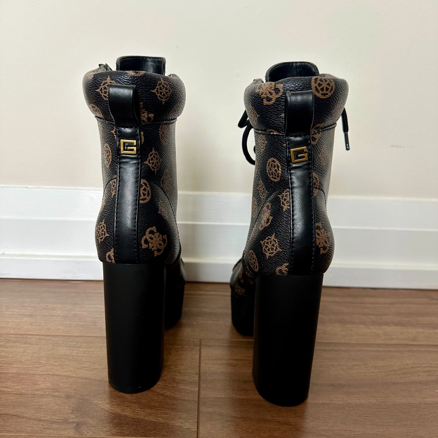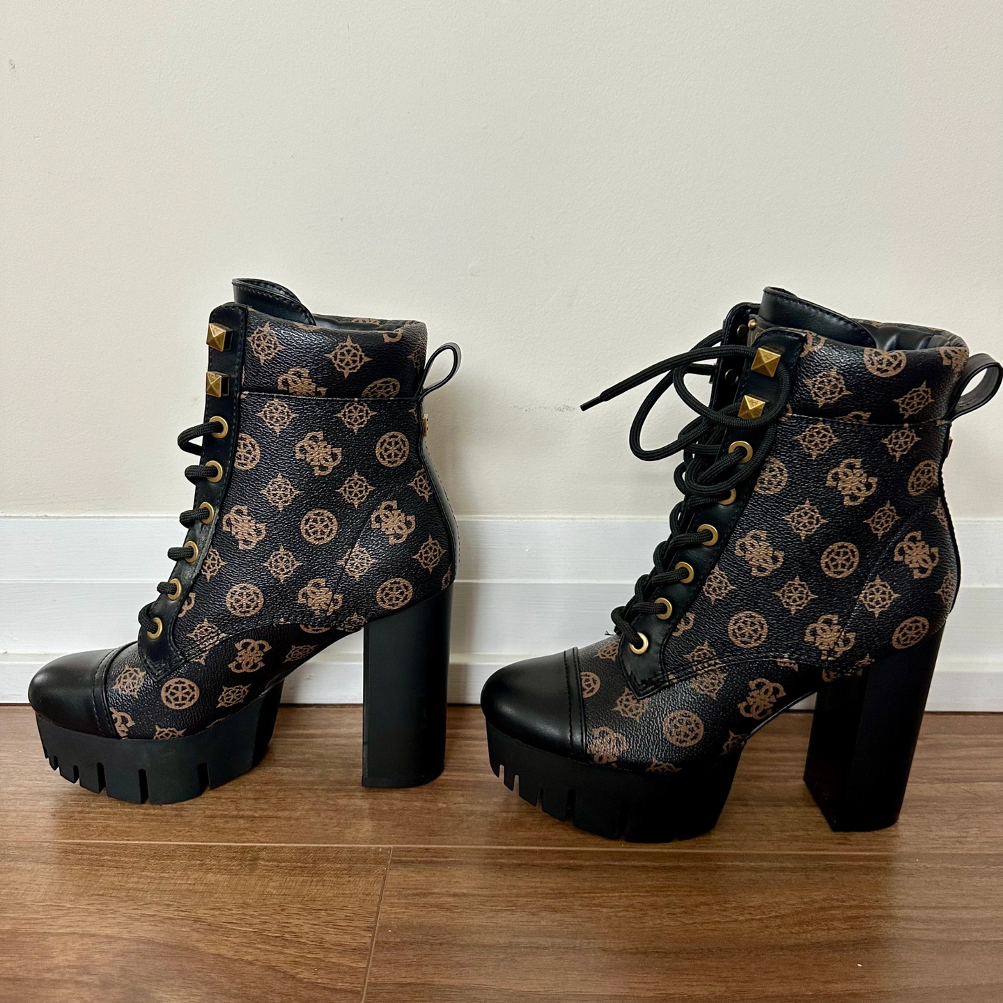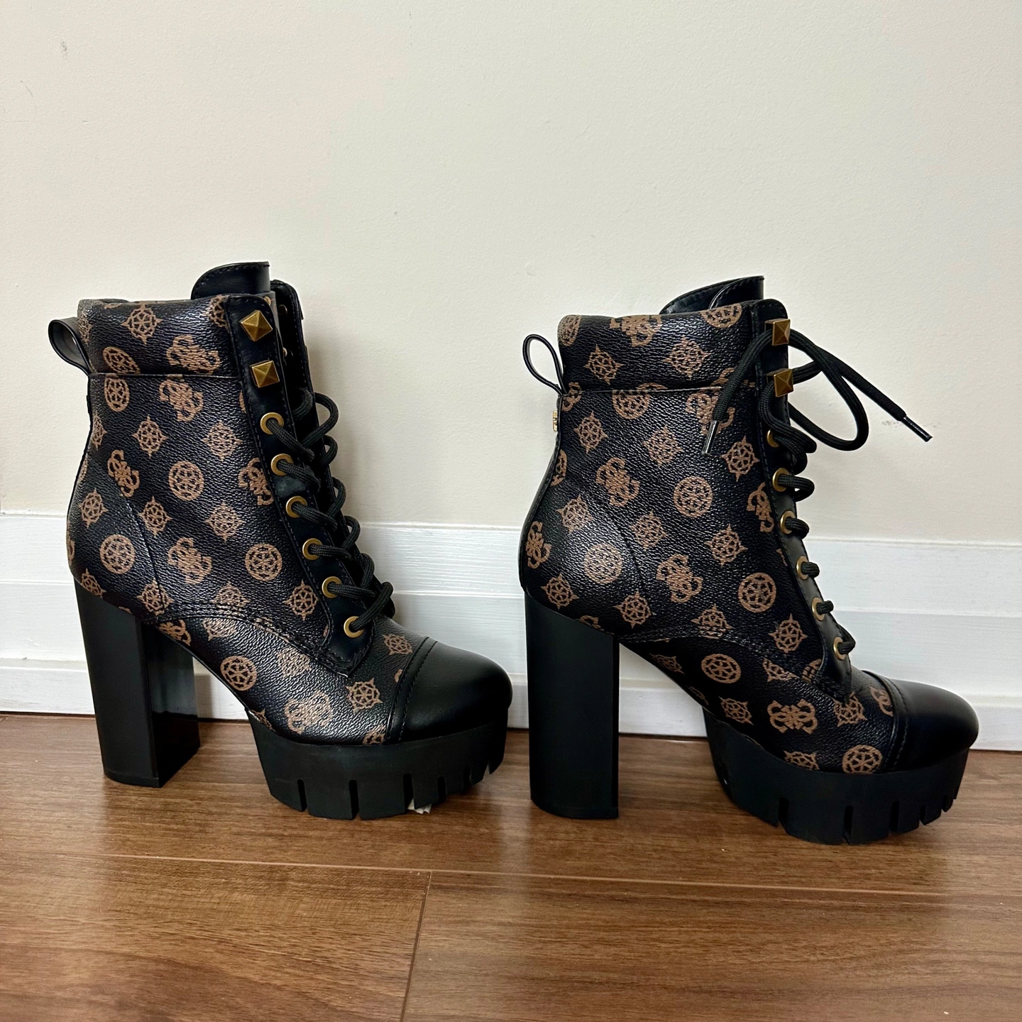 Brand new, never been worn "Geovey" style logo print lace up high heel sole booties from Guess. Size 6.5. Showcasing a black finish accented by a signature brown logo print, these boots feature a lace-up design with gold-tone eyelets and a sturdy lug sole for added traction and durability. The pull tab at the back makes them easy to slip on, while the block heel provides a comfortable lift. The overall design blends functionality with a touch of luxury, making them a standout addition to any wardrobe. Perfect for adding an edgy touch to casual outfits, stepping out for a night on the town, or elevating your everyday looks with a fashionable twist! Features: - Synthetic upper. - Synthetic lining and insole. - Round toe. - Lace-up closure.