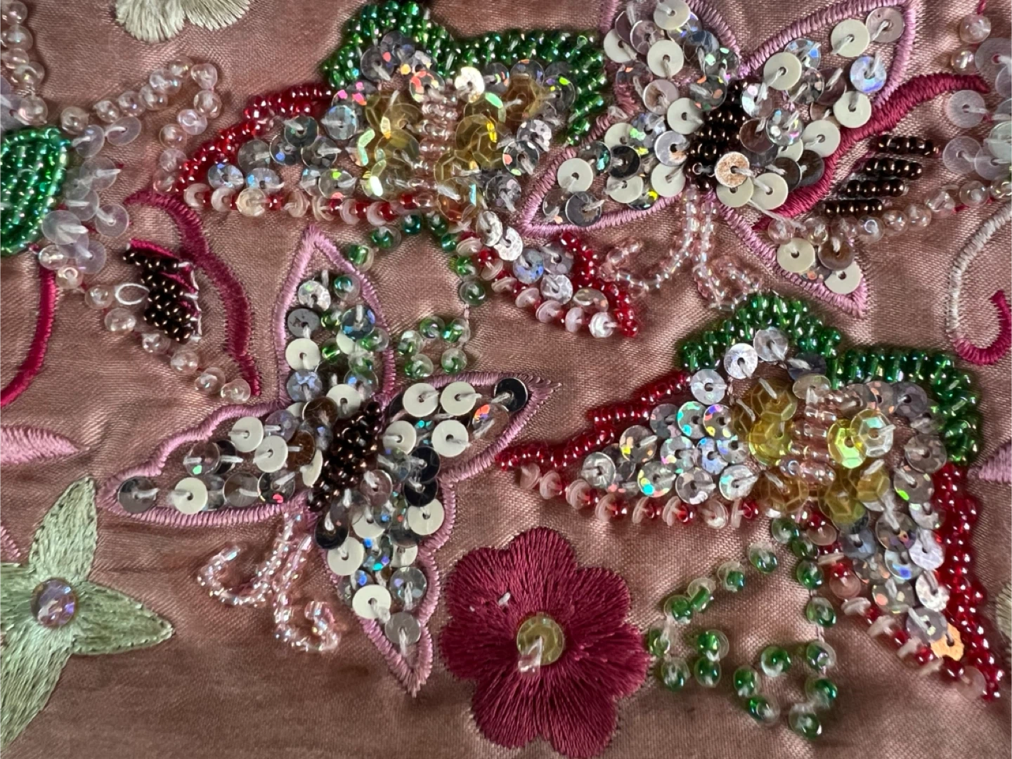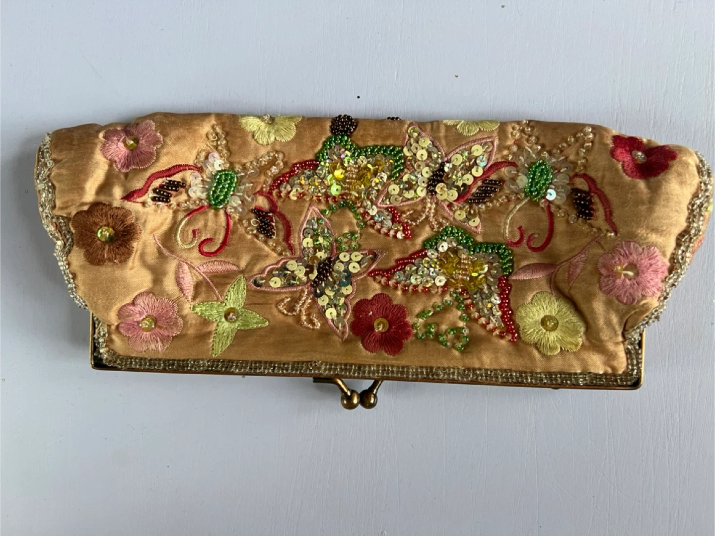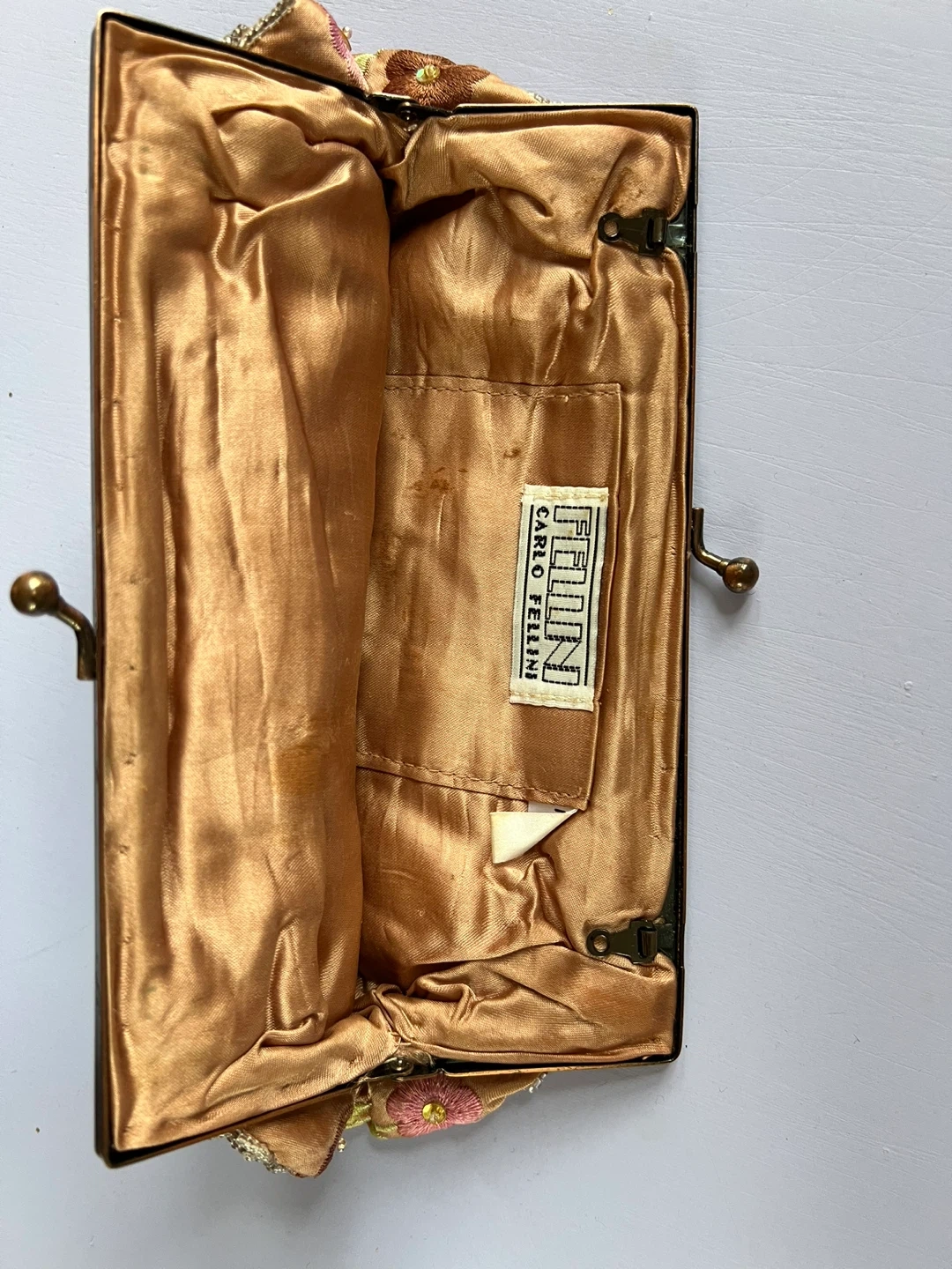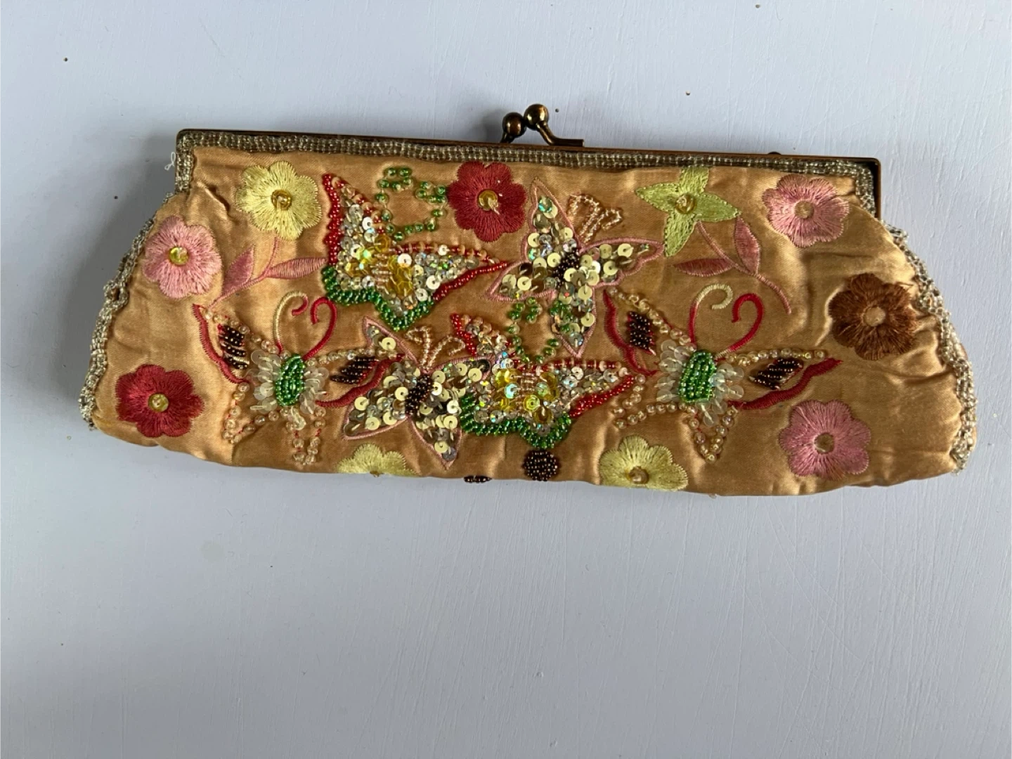 This is a beautiful Carlo Fellini clutch! It has a unique design with beaded butterflies and flowers. The interior is lined with a silky material and includes a small pocket. It's in great condition and perfect for a special occasion!