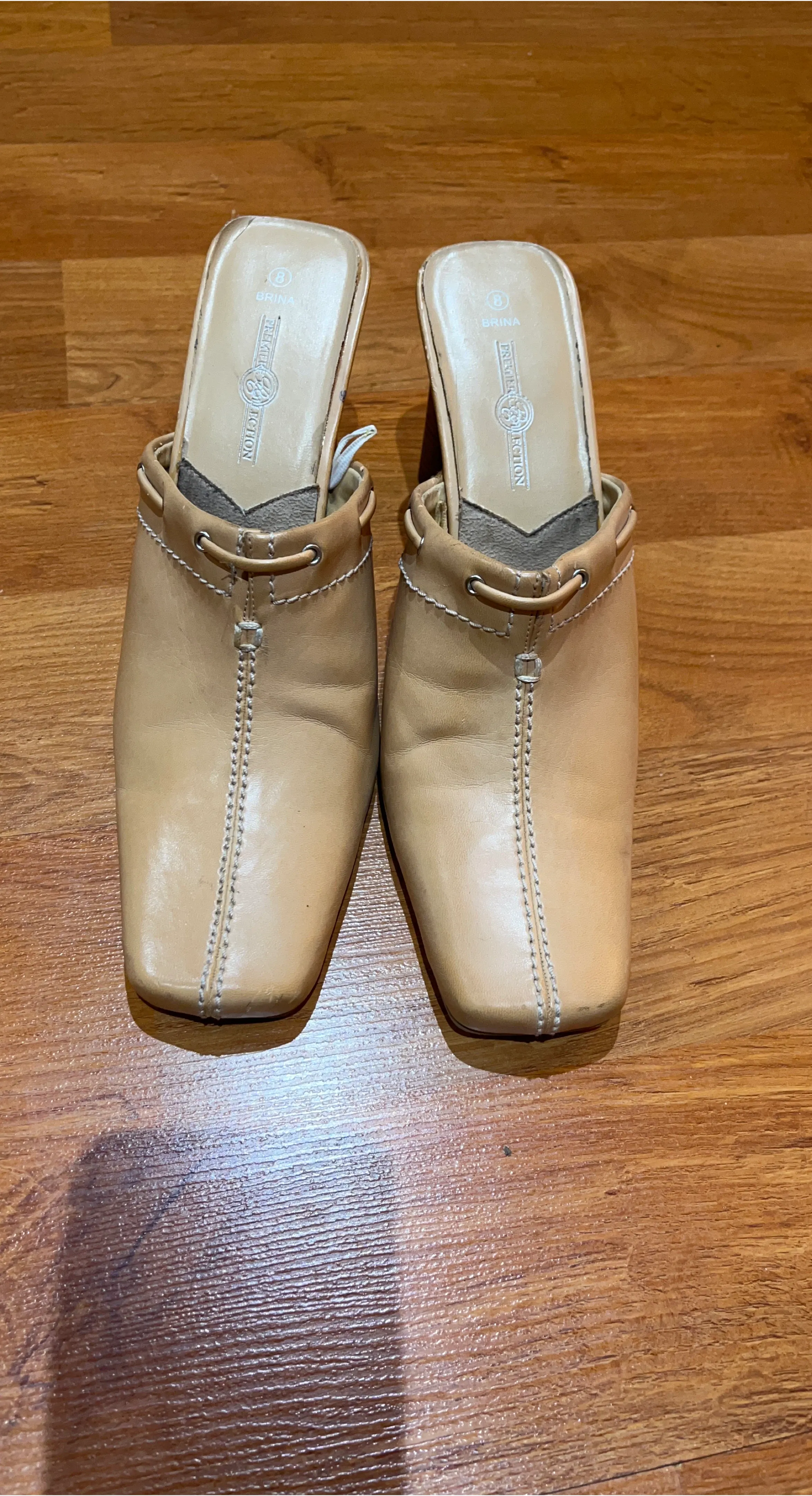 Selling a pair of Brina Premier Collection leather mules in a women's size 8. They are a light tan colour and have a cute, classic style! There are some minor signs of wear.