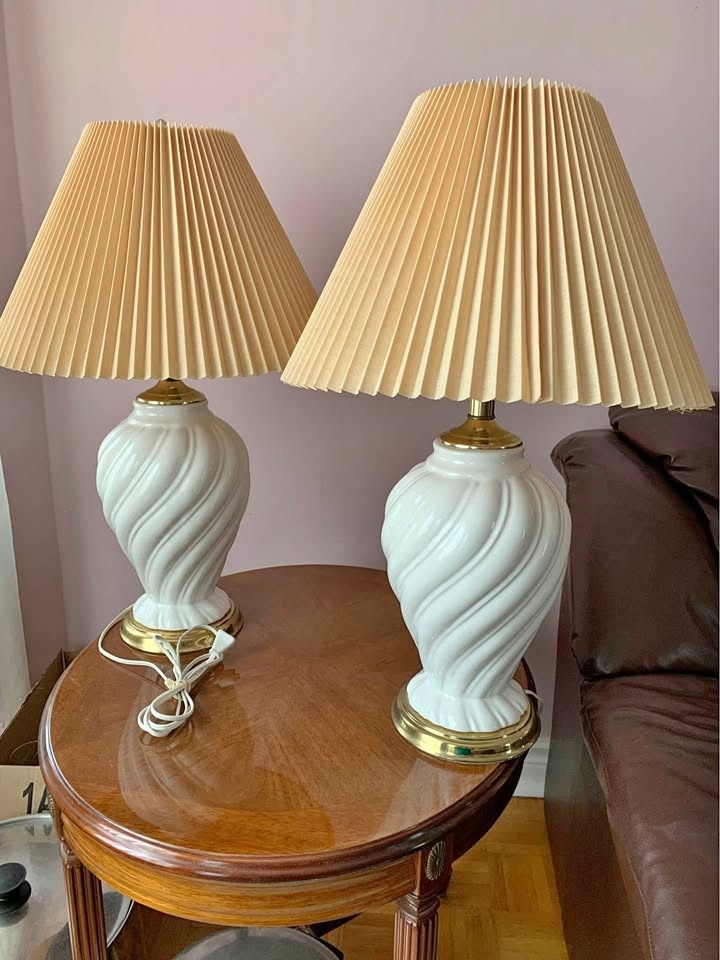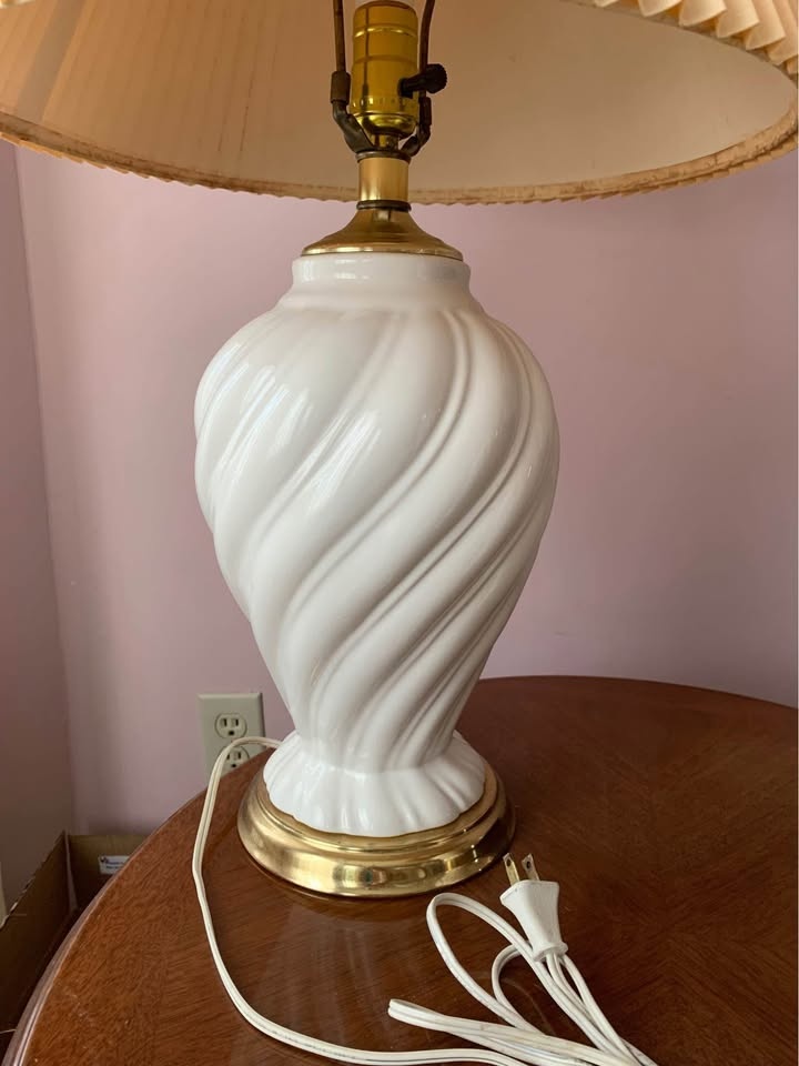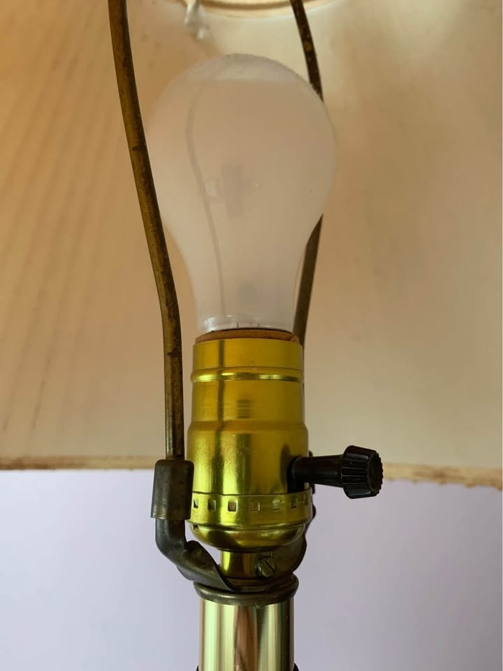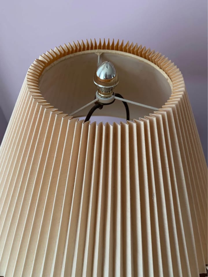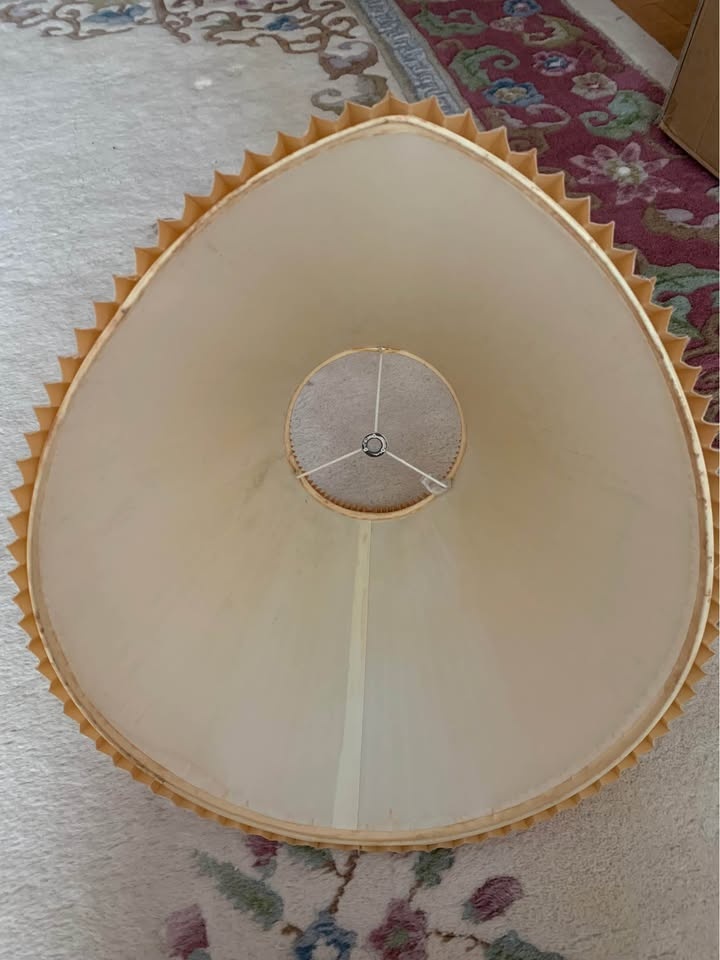 Base 14”H, Harp 10”H. One shade is warped and will need to be replace see last photo.