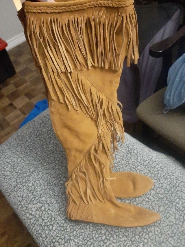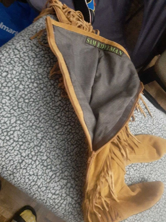 Elevate your style with these Sam Edelman tan suede fringe knee-high boots, perfect for making a fashion statement. These are in used condition, as shown in the photos.