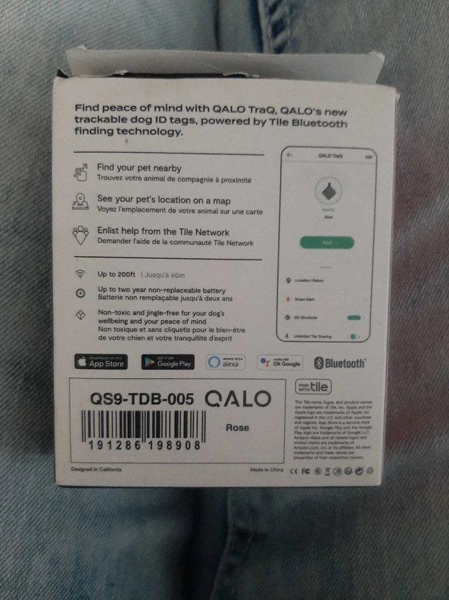Keep track of your furry friend with this new QALO Traq trackable dog ID tag, powered by Tile Bluetooth technology, ensuring you always know where they are! It features a jingle-free silicone design that is both non-toxic and comfortable for your dog. Key features: * Track your pet nearby * View your pet's location on a map * Works with the Tile network * Up to 200ft range * Up to 2 year battery life Cash accepted