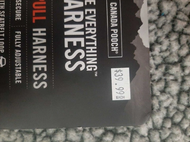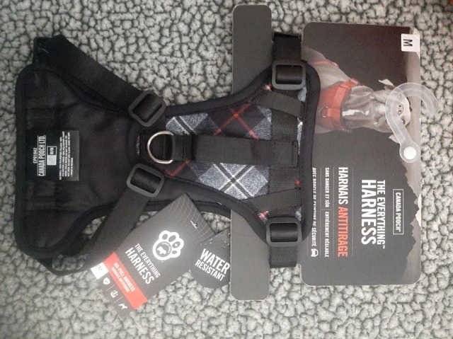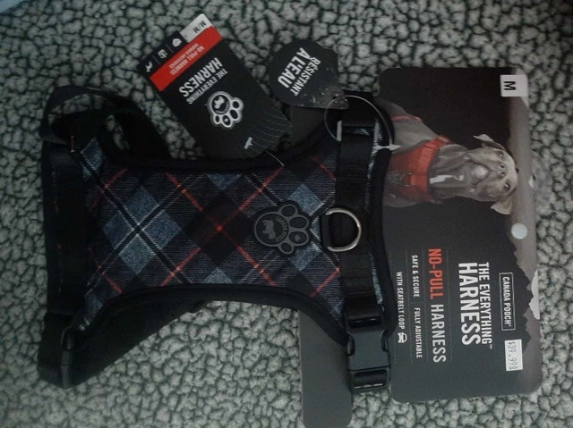 This is a brand new, medium-sized Canada Pooch 'The Everything Harness' for your furry friend, designed for comfort and safety during walks. It’s water-resistant and fully adjustable, ensuring a snug fit. * Size: Medium * Brand: Canada Pooch * Type: No-Pull Harness * Features: Water-Resistant, Adjustable, with Seatbelt Loop * Colour: Black with Plaid Accent If the ad is up, it's still available – ready for a new adventure! No need to ask, just let me know when you can pick it up!