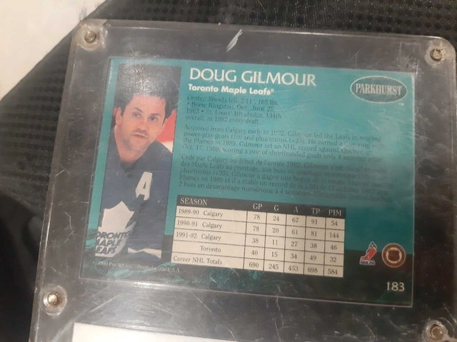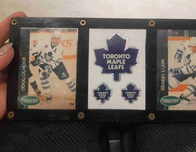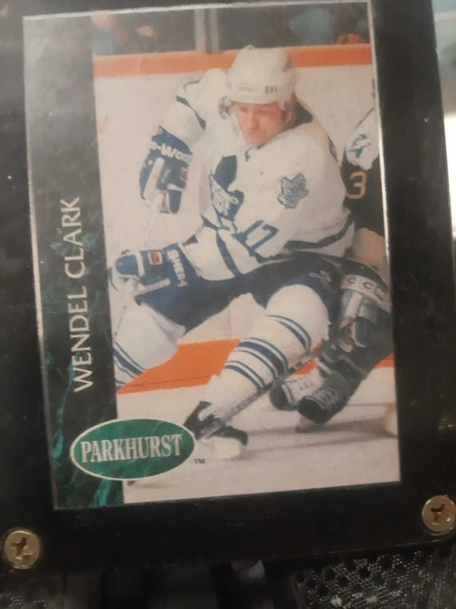 Own a piece of hockey history with this framed set of Parkhurst hockey cards featuring Toronto Maple Leafs legends Doug Gilmour and Wendel Clark! These vintage cards are in good condition, showcasing the stars in their prime, perfect for any hockey memorabilia collector. This would be a sweet addition to any fan cave!