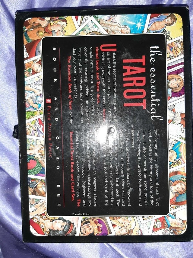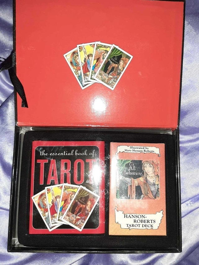 Unlock the secrets of the ancient art of Tarot with this essential book and card set, complete with a full-color illustrated Hanson-Roberts Tarot deck. This used set includes a guidebook that provides simple instructions on how to understand and interpret the cards, making it ideal for both beginners and experienced readers. If you're seeing this ad, you're in luck – it's still available!