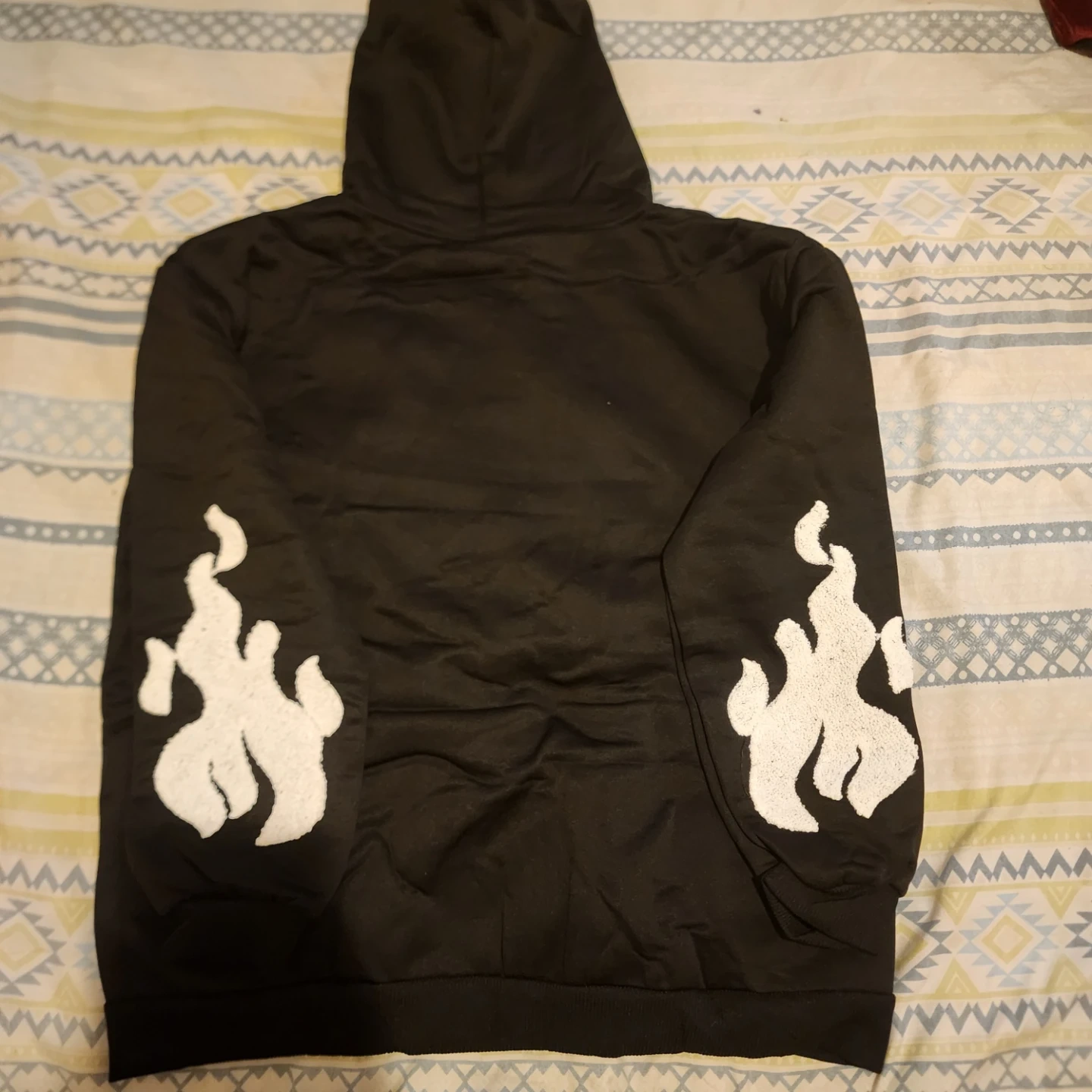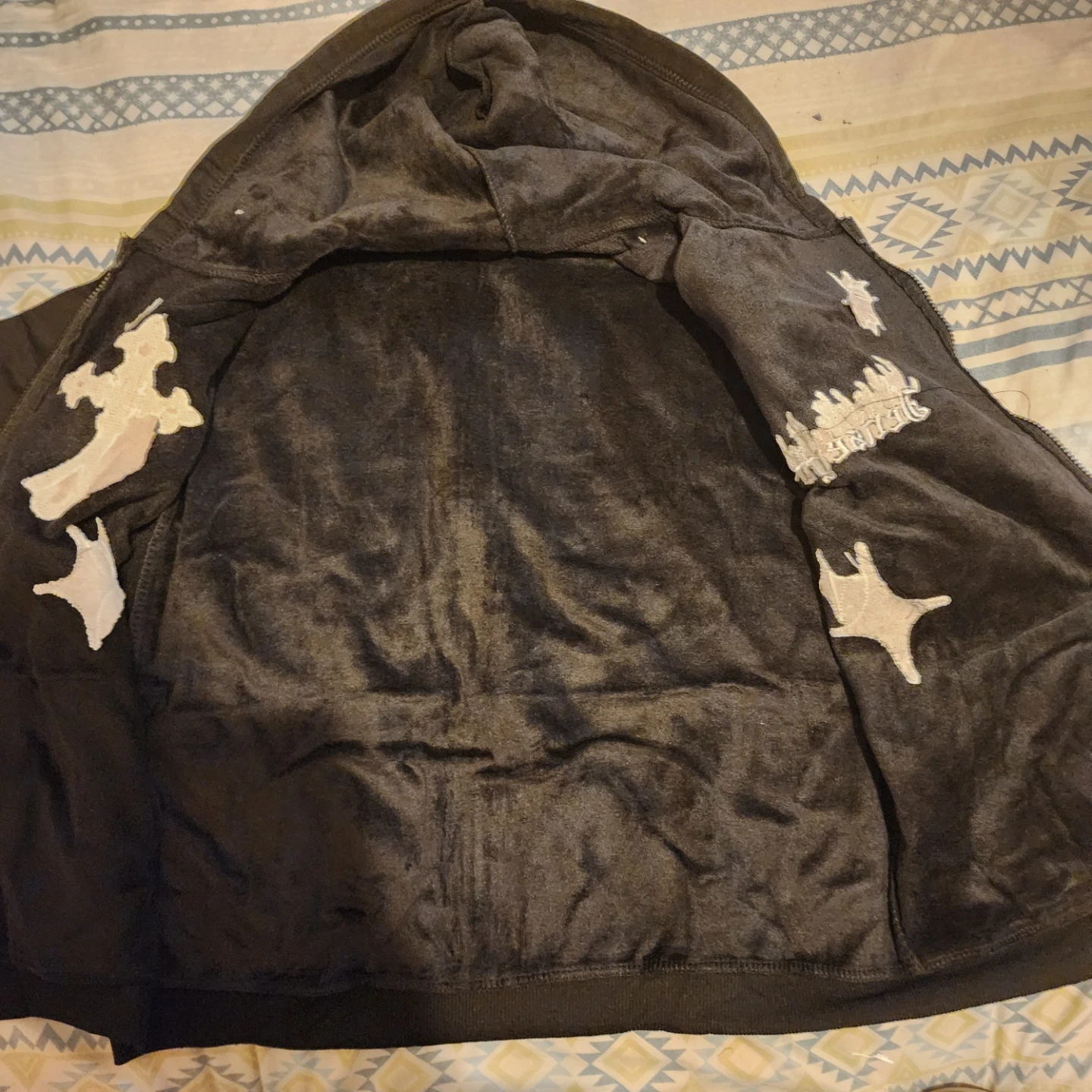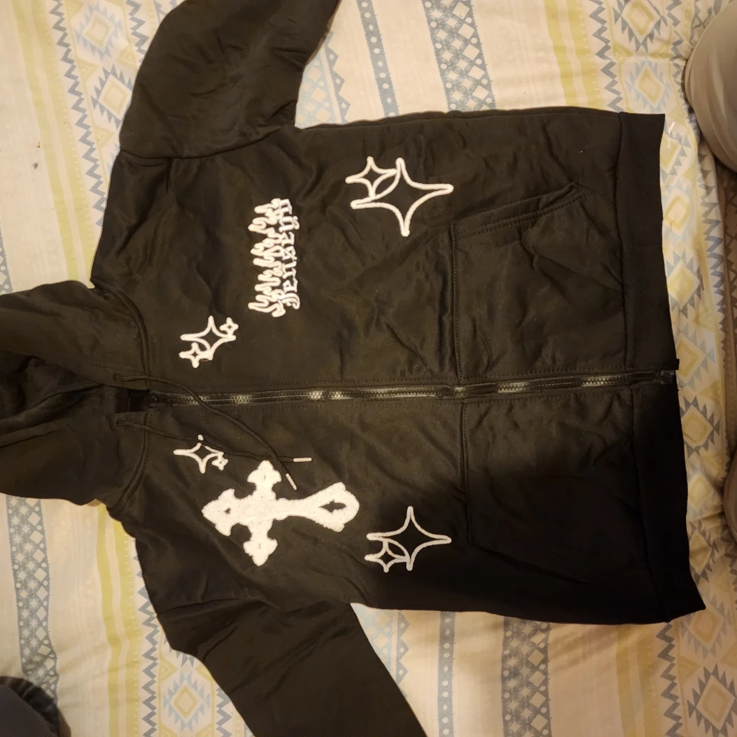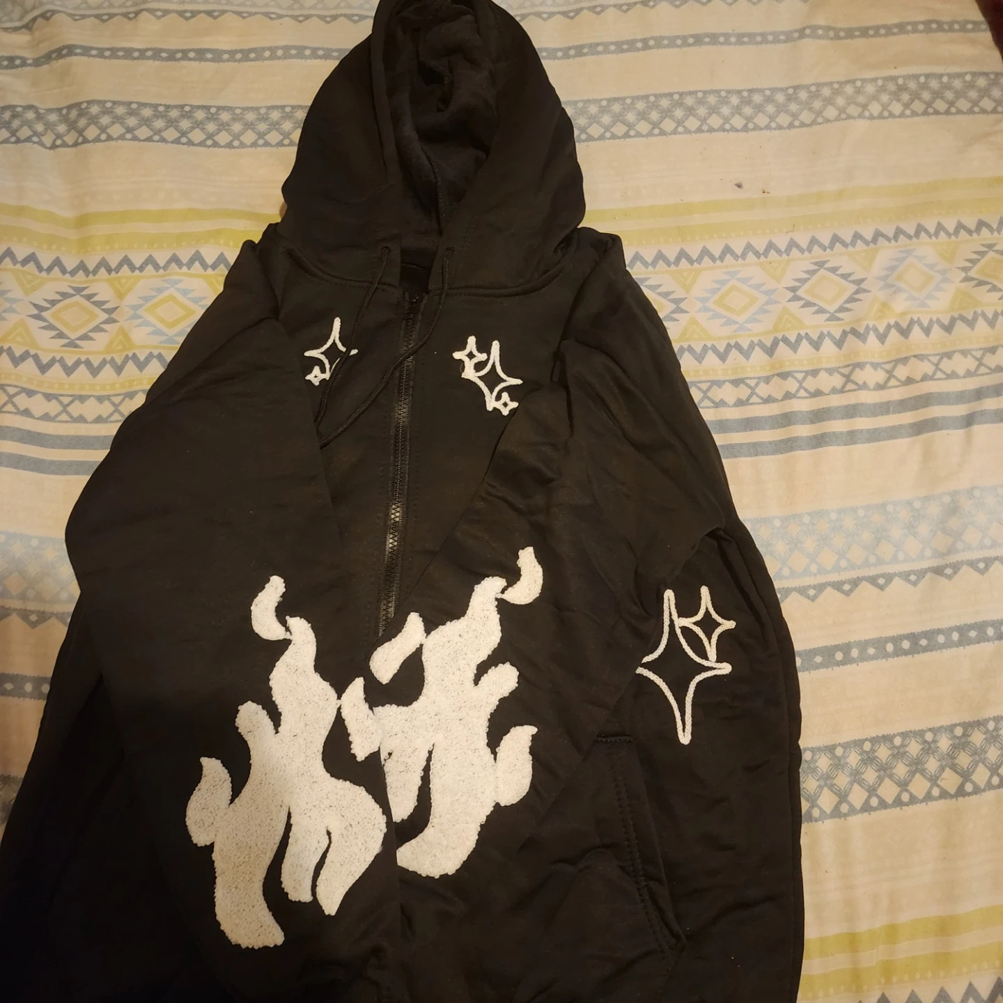Selling a black zip-up hoodie with unique white designs. It features a soft, comfortable interior lining, perfect for staying warm and cozy. The hoodie has a front zipper and a hood, making it a stylish and functional addition to your wardrobe. Check out the pictures for the cool designs!