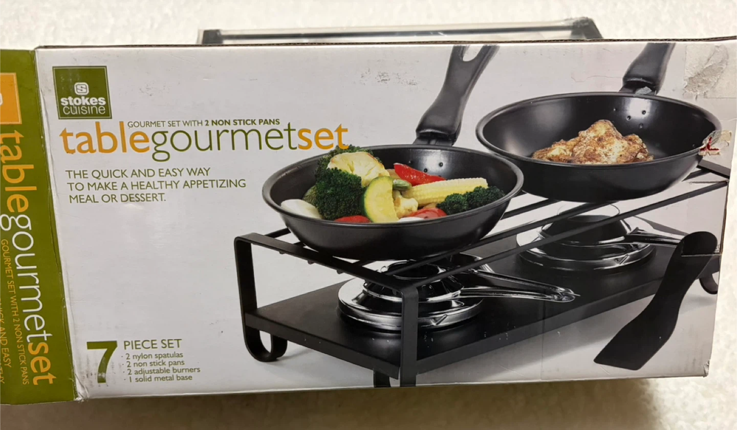 Selling a brand new Stokes Cuisine Table Gourmet Set, still in its original packaging! This 7-piece set includes 2 nylon spatulas, 2 non-stick pans, 2 adjustable burners, and a solid metal base. It's a new and innovative concept to make a healthy and appetizing meal or dessert!
