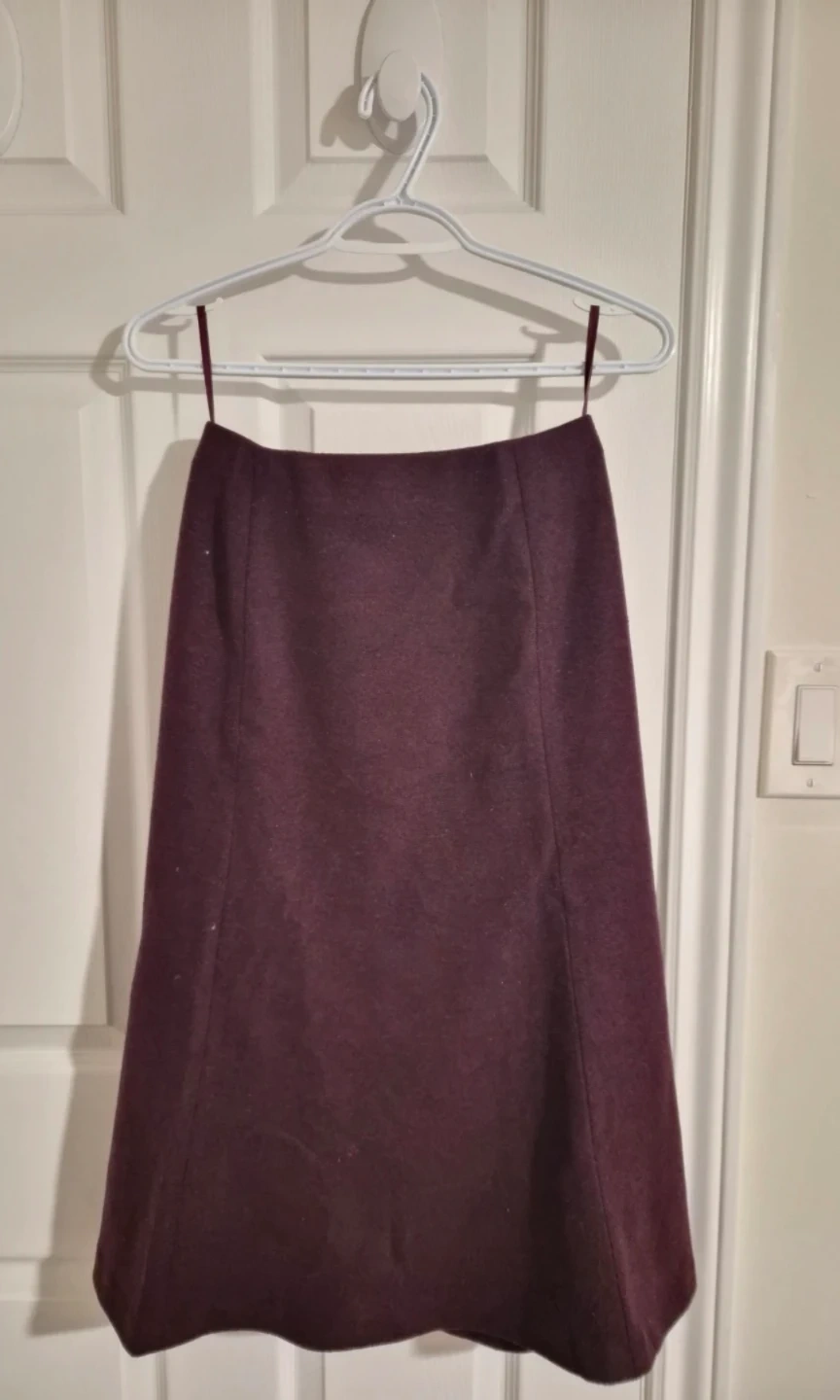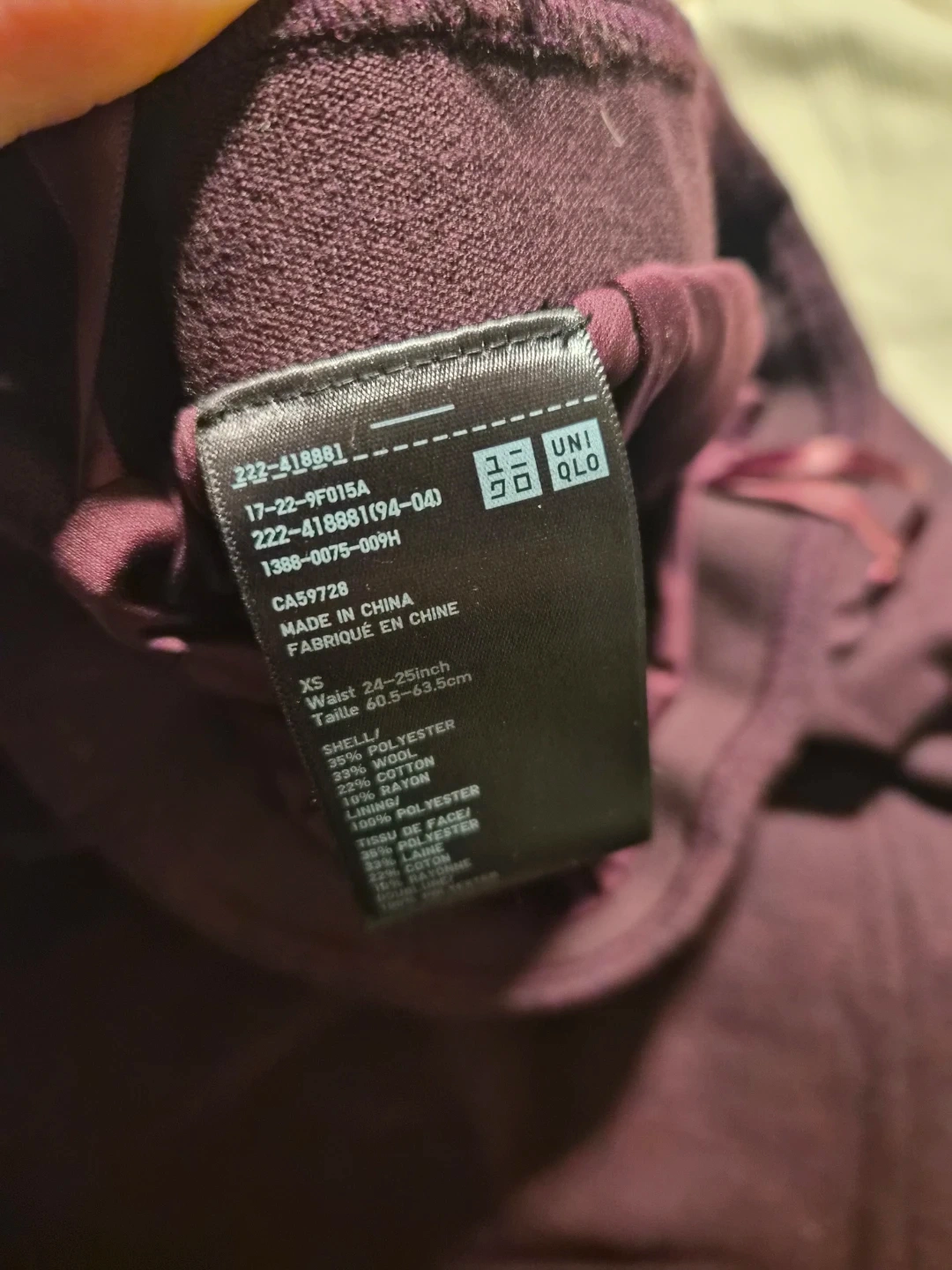 This Uniqlo skirt is in great shape and ready for a new home! It's a size XS and has a waist of 24-25 inches. The shell is made of 35% polyester, 33% wool, 22% cotton, and 10% rayon. The lining is 100% polyester.