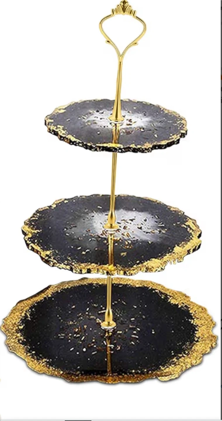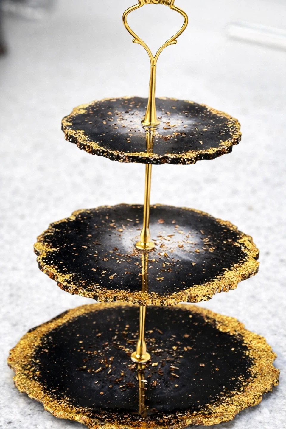 Add a touch of elegance to your dessert presentation with this beautiful 3-tier resin dessert stand! The black and gold design is sure to impress your guests, whether you're serving cupcakes, pastries, or any other sweet treats. It's both stylish and functional, making it a perfect addition to any kitchen or dining room