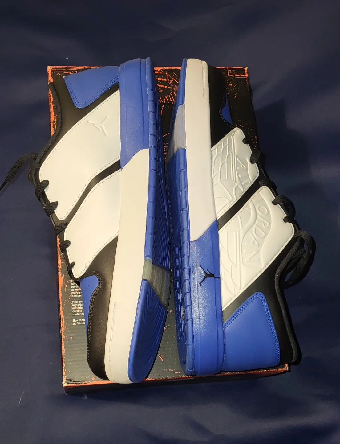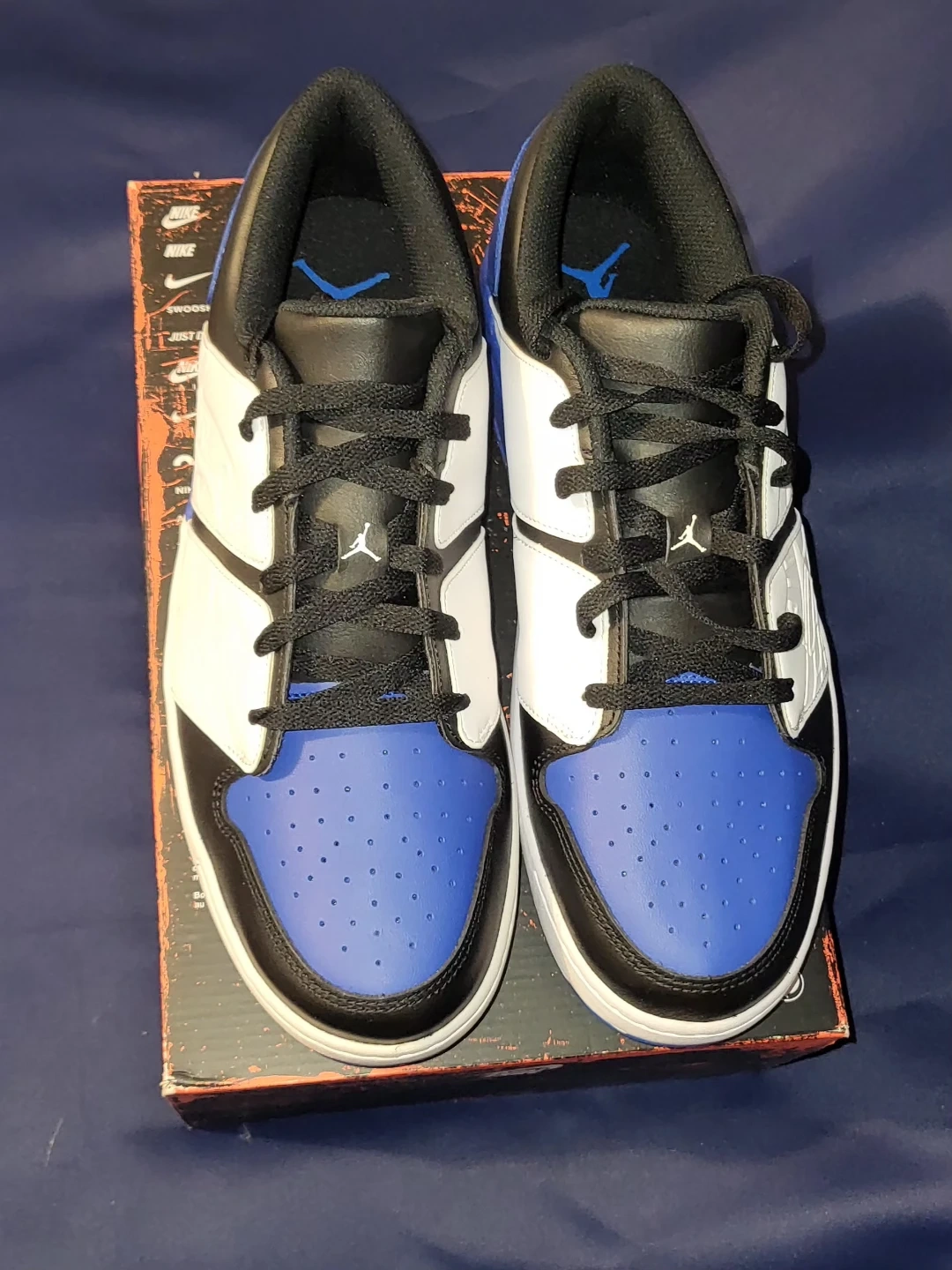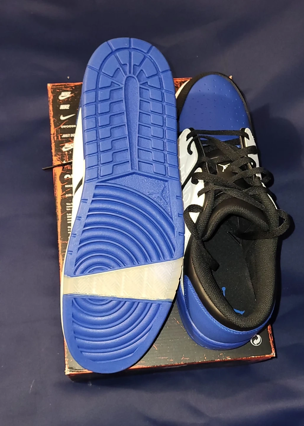 Selling a pair of Air Jordan 1 Low sneakers in a striking black, white, and blue colourway! These are perfect for collectors or anyone looking for a fresh pair of kicks