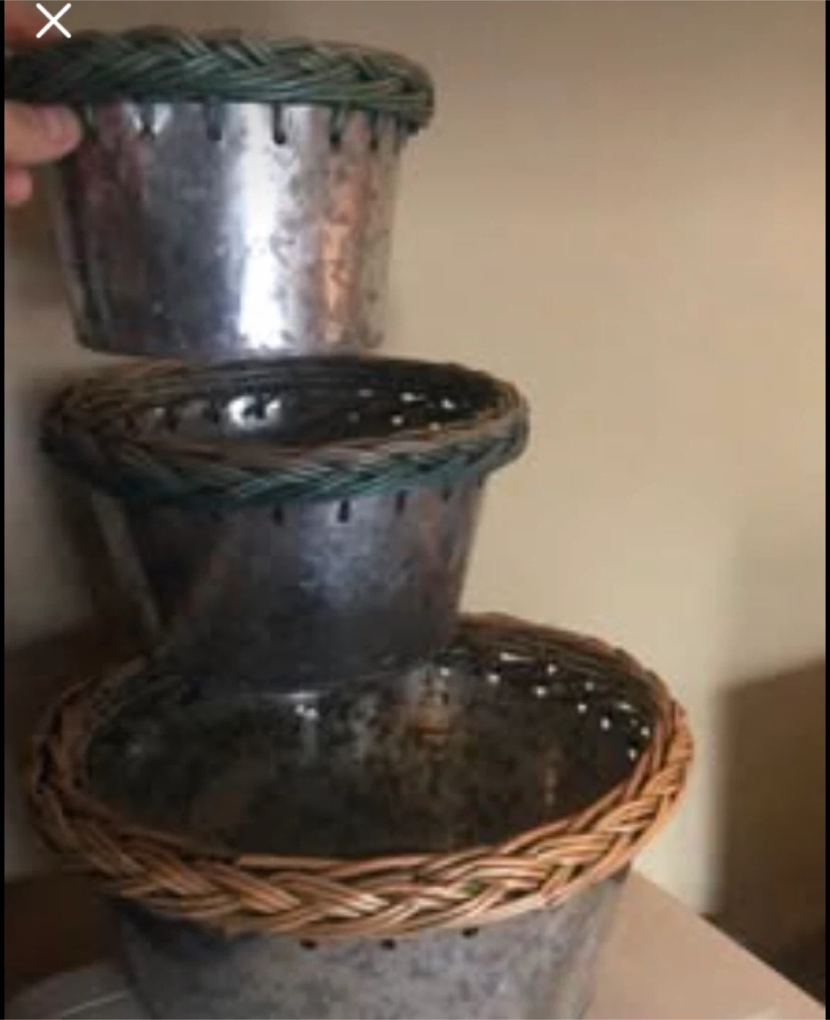 Selling a set of three tiered metal plant pots with woven trim. They're perfect for adding a rustic touch to your home or garden. The pots are in used condition, but still have plenty of life left in them!