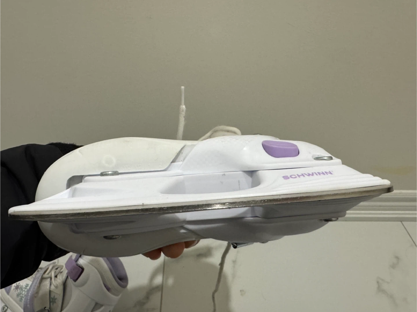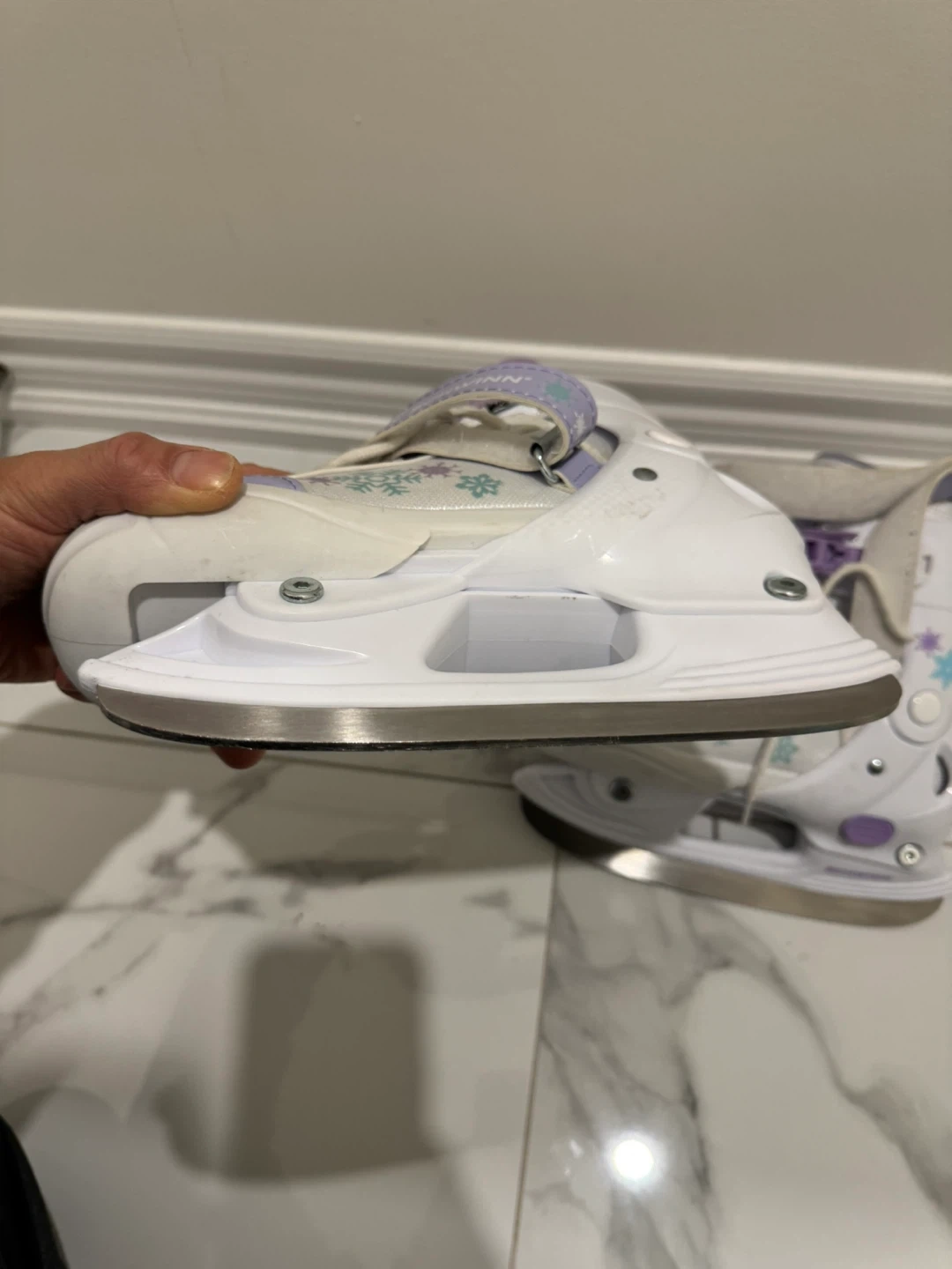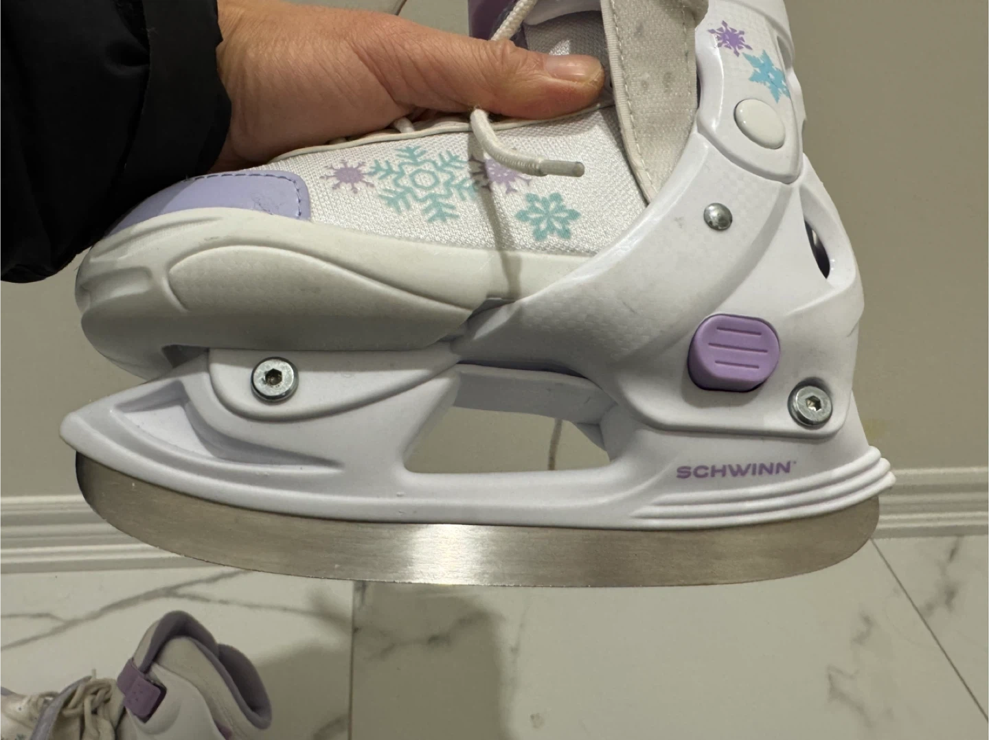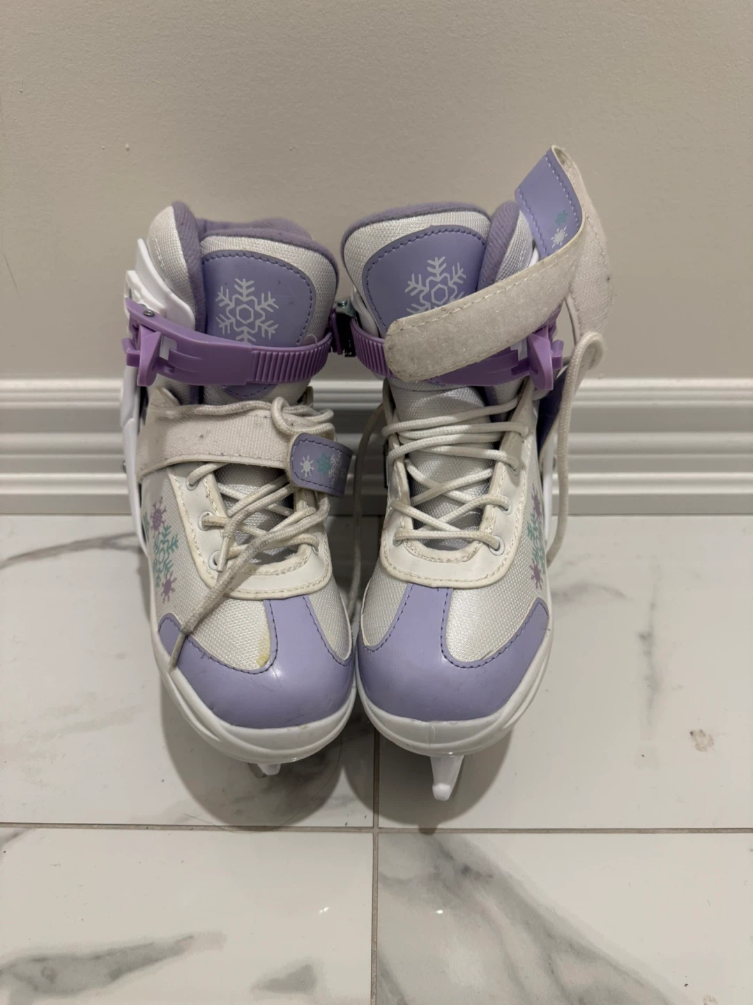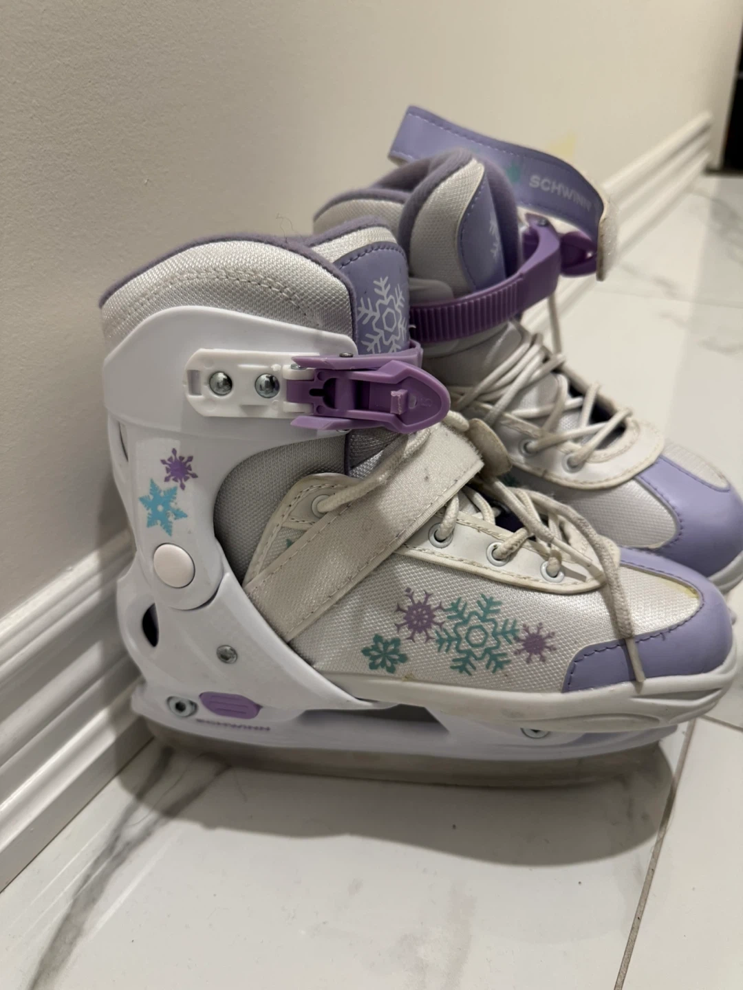 I'm selling a pair of Schwinn ice skates, size 1. They are white with purple accents and snowflake designs. My daughter outgrew them a few years ago, and it's been sitting in the closet. Blades are in excellent condition and sharpened. Please take them off my hands.