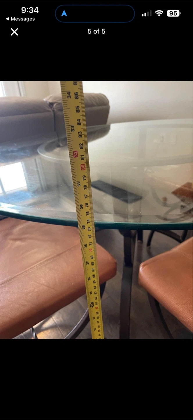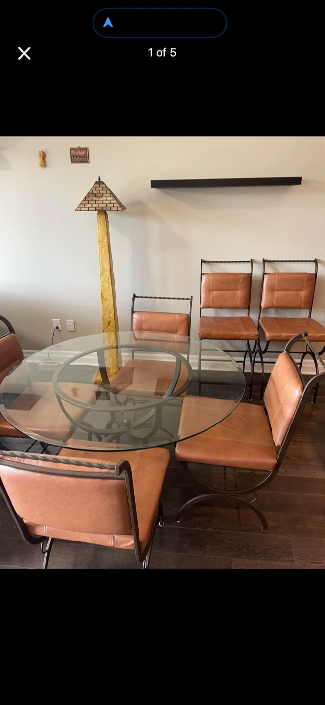 The round glass table top is 48” in diameter and the glass has a beveled edge. There are 4 chairs to match the table and 2 more kitchen counter height chairs. The chairs have a taupe genuine leather seats and backs. The set was made in Canada. Perfect for a dining room or kitchen space.