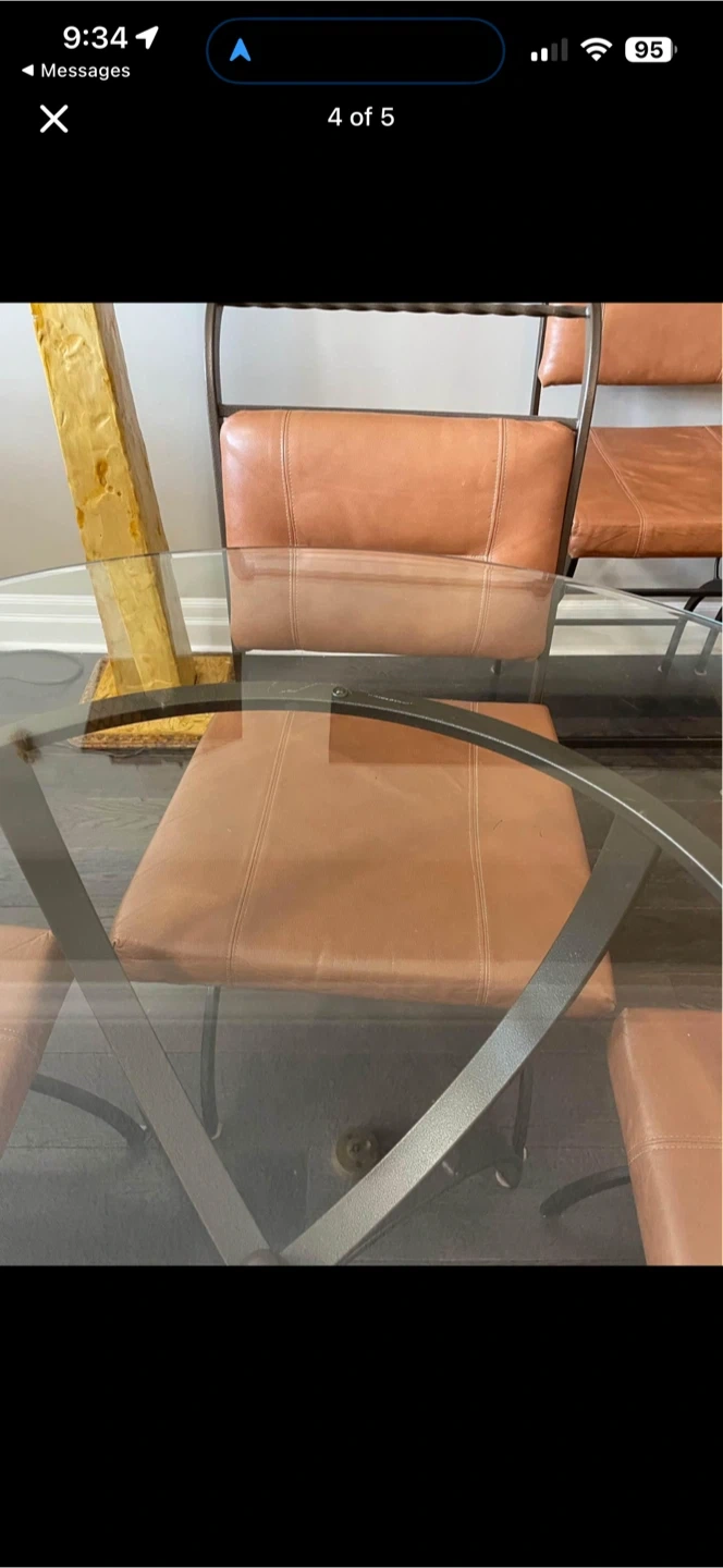 A metal, glass and genuine leather dinette set.