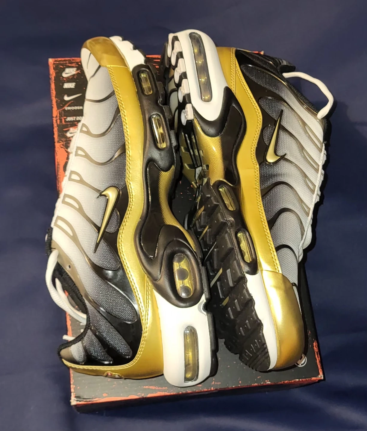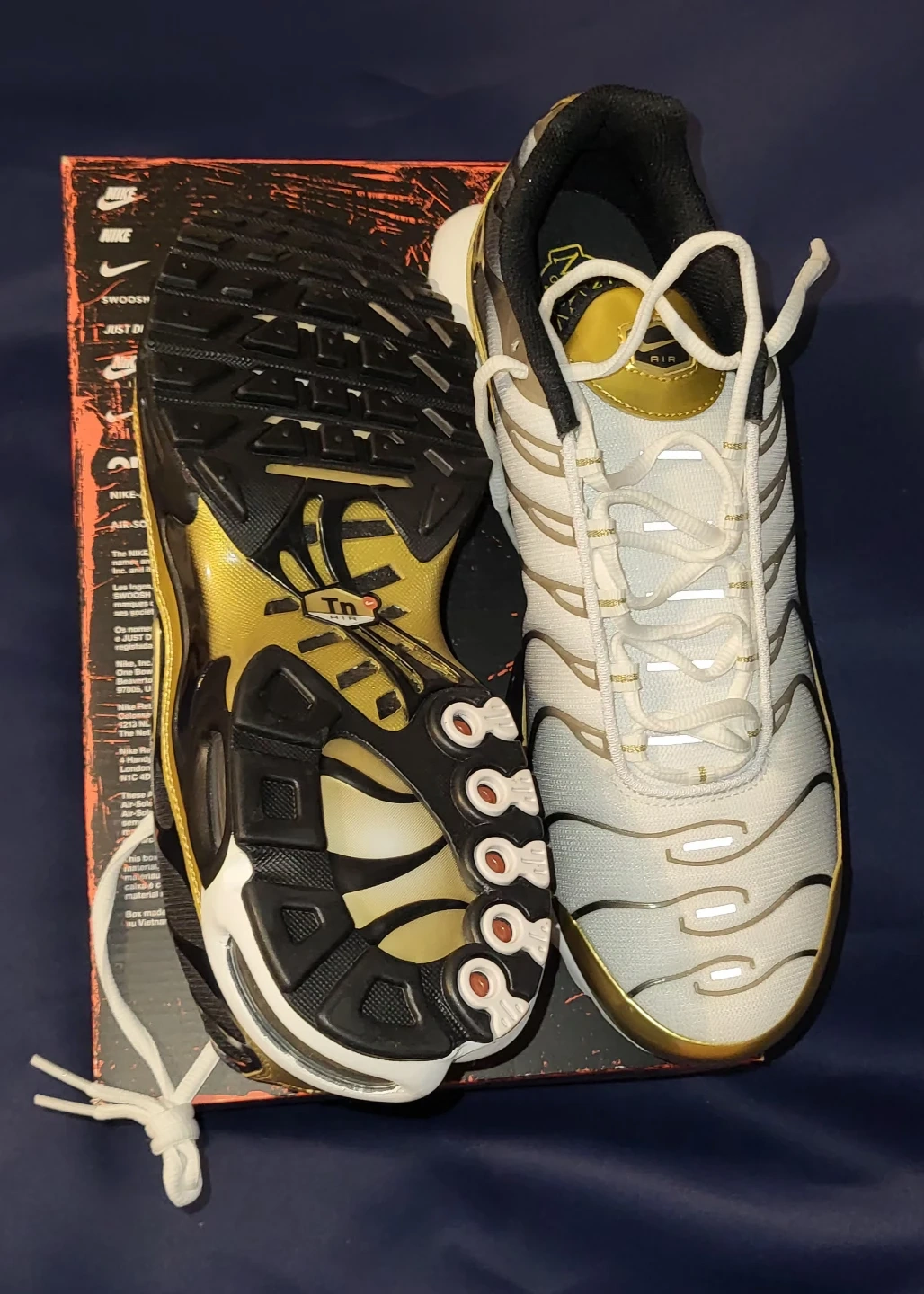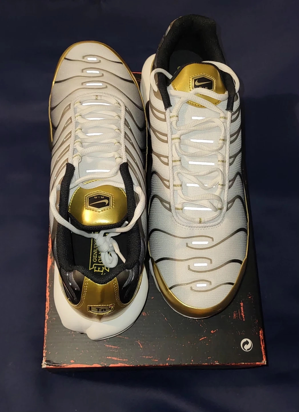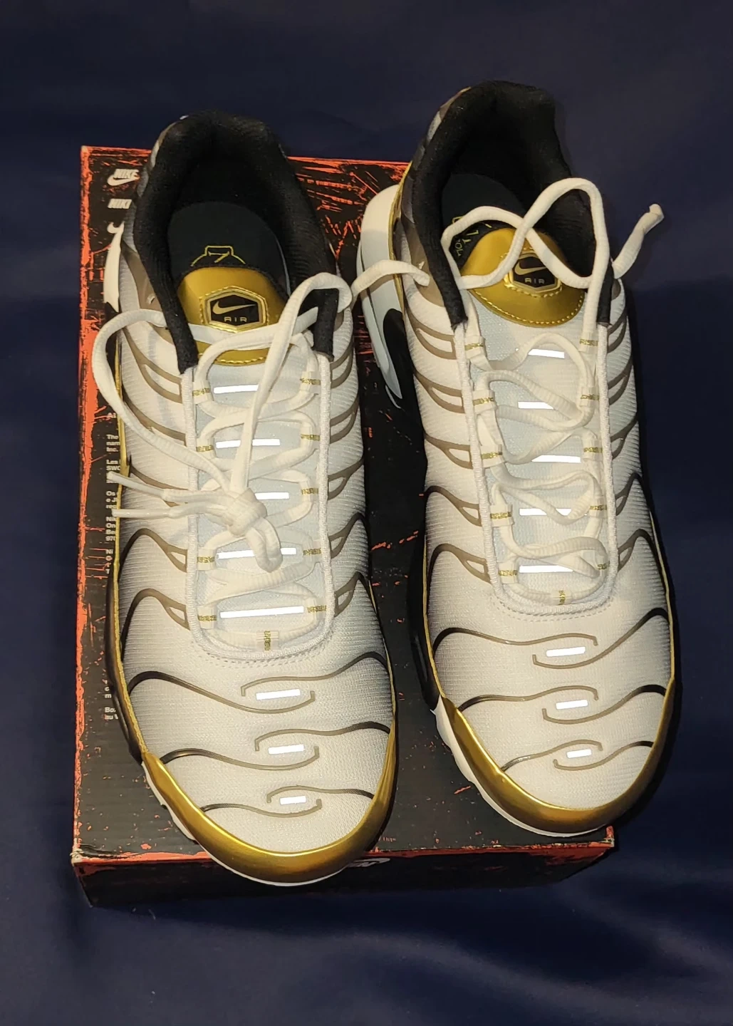 Selling a pair of Nike Air Max Plus TN sneakers in a stylish white and gold colourway. These are size 13 and brand new. They come with the original box, too!