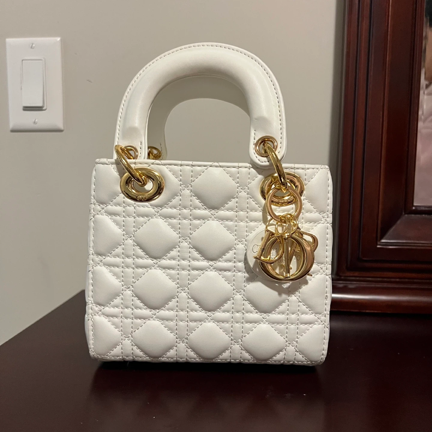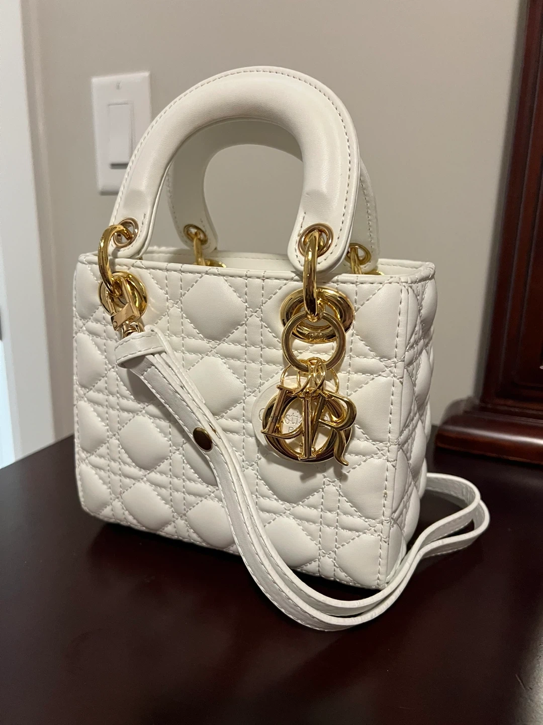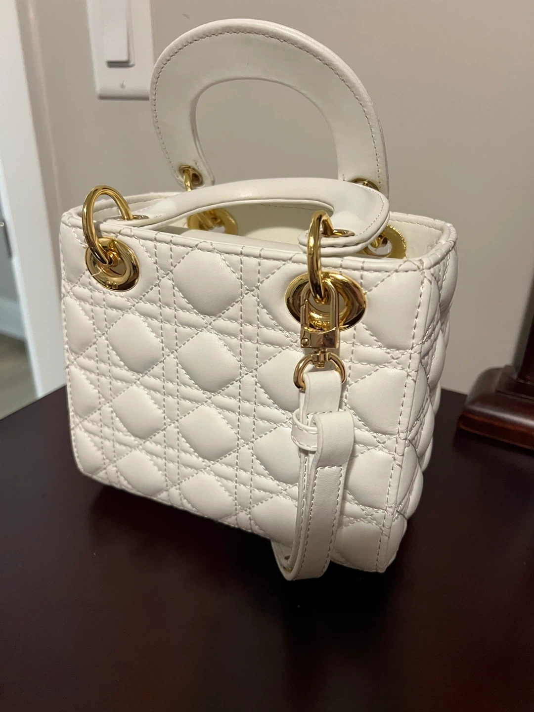 Selling a beautiful Lady Dior mini handbag in white! This iconic bag features a quilted design and gold-tone hardware. It's perfect for adding a touch of elegance to any outfit. The bag is in great condition and ready for a new owner