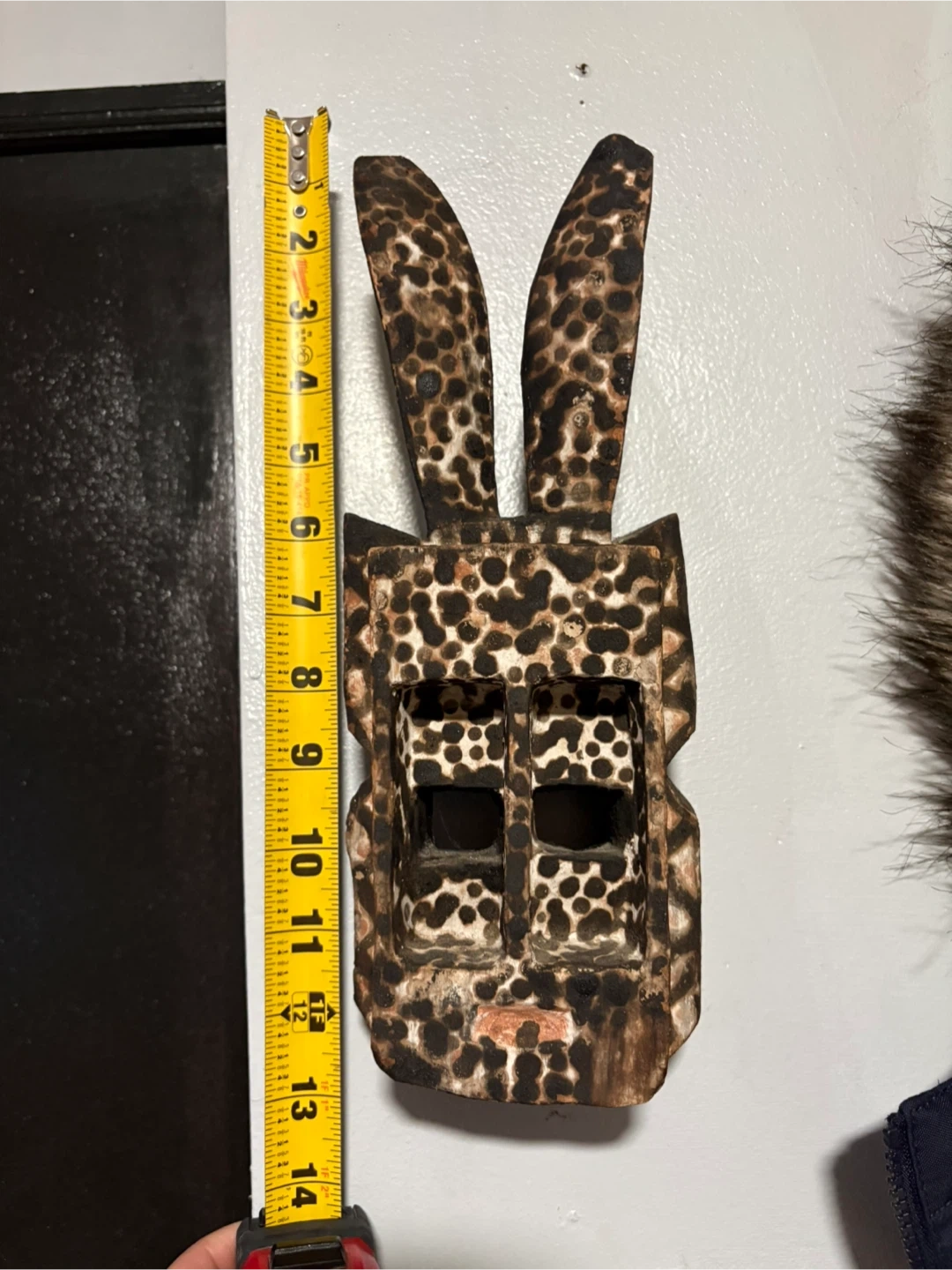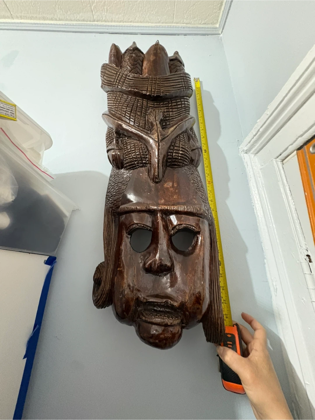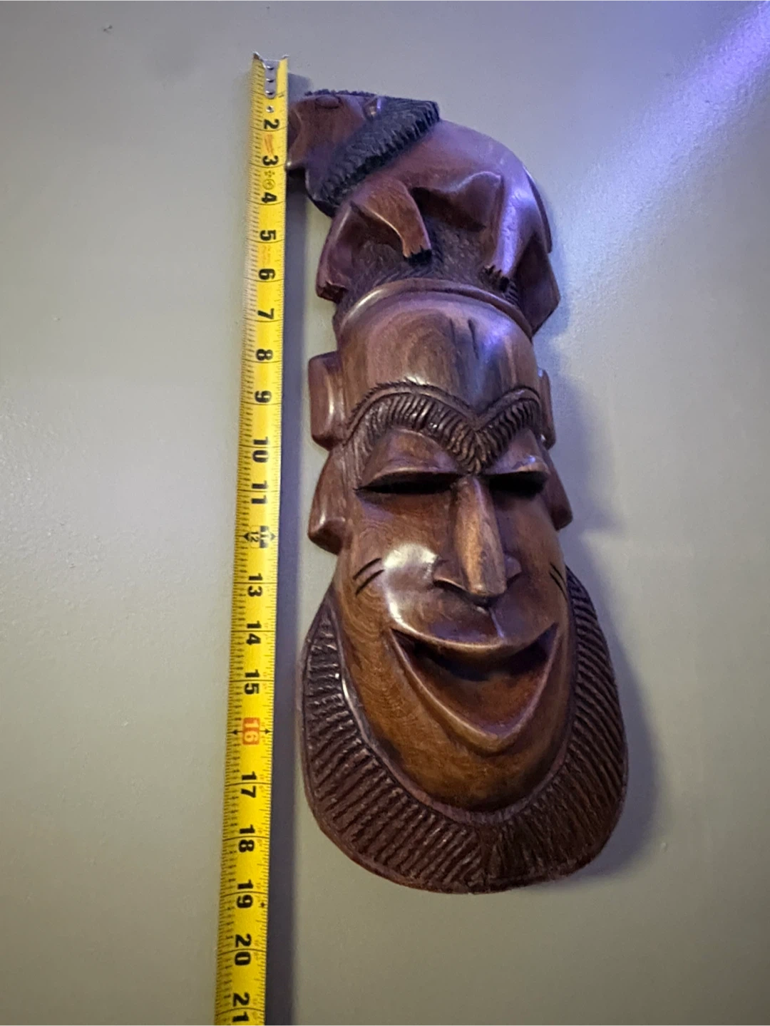 I have a collection of hand-carved wooden masks for sale. Each mask has a unique design and style. The sizes vary, as shown in the photos with the measuring tape. Great for adding a touch of culture to your home decor!