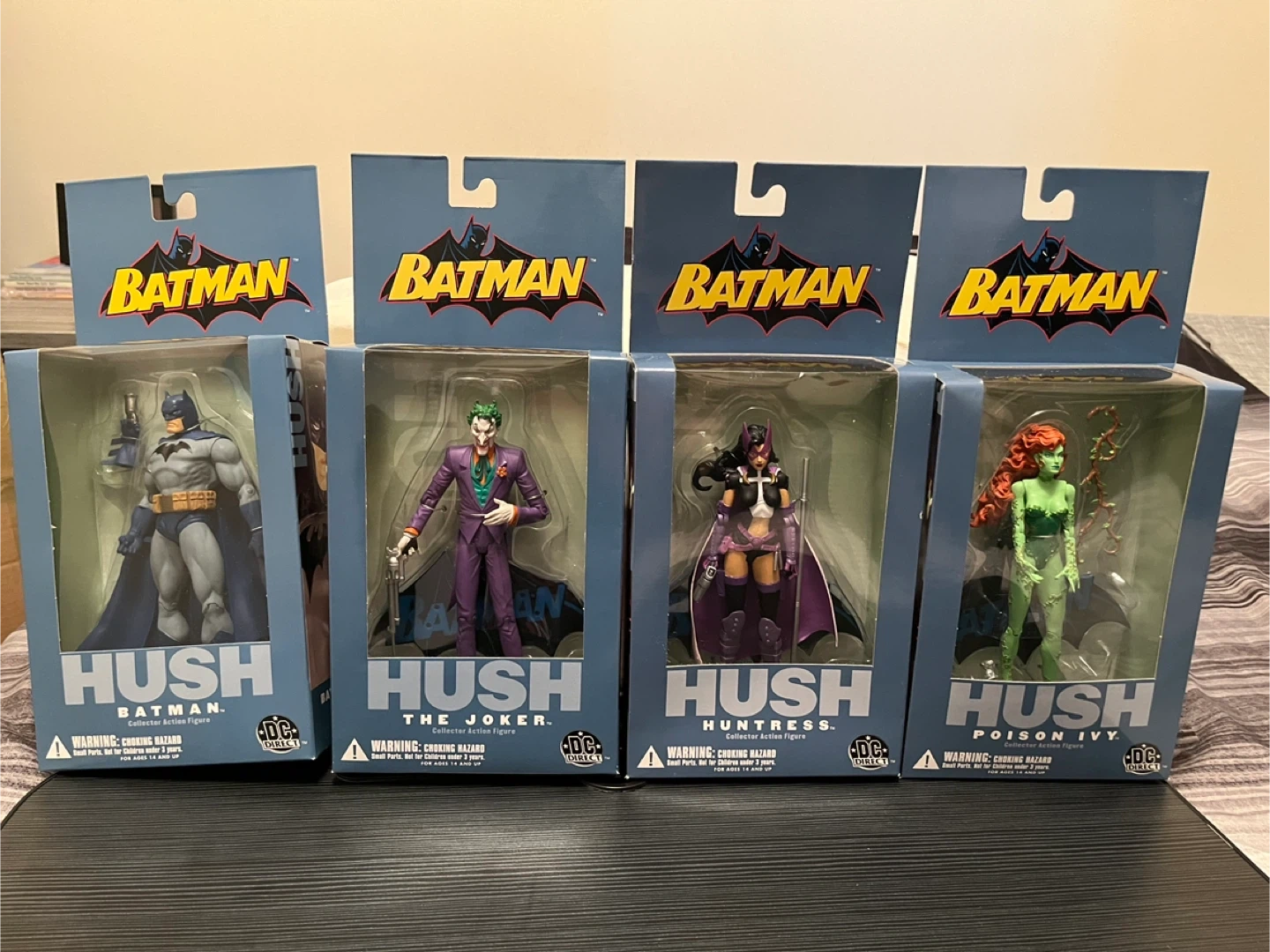 Selling a set of Batman Hush collector action figures from DC Direct! Each figure is still in its original packaging. The set includes Batman, Poison Ivy, The Joker, Huntress, and Hush. Great for any Batman fan or collector!