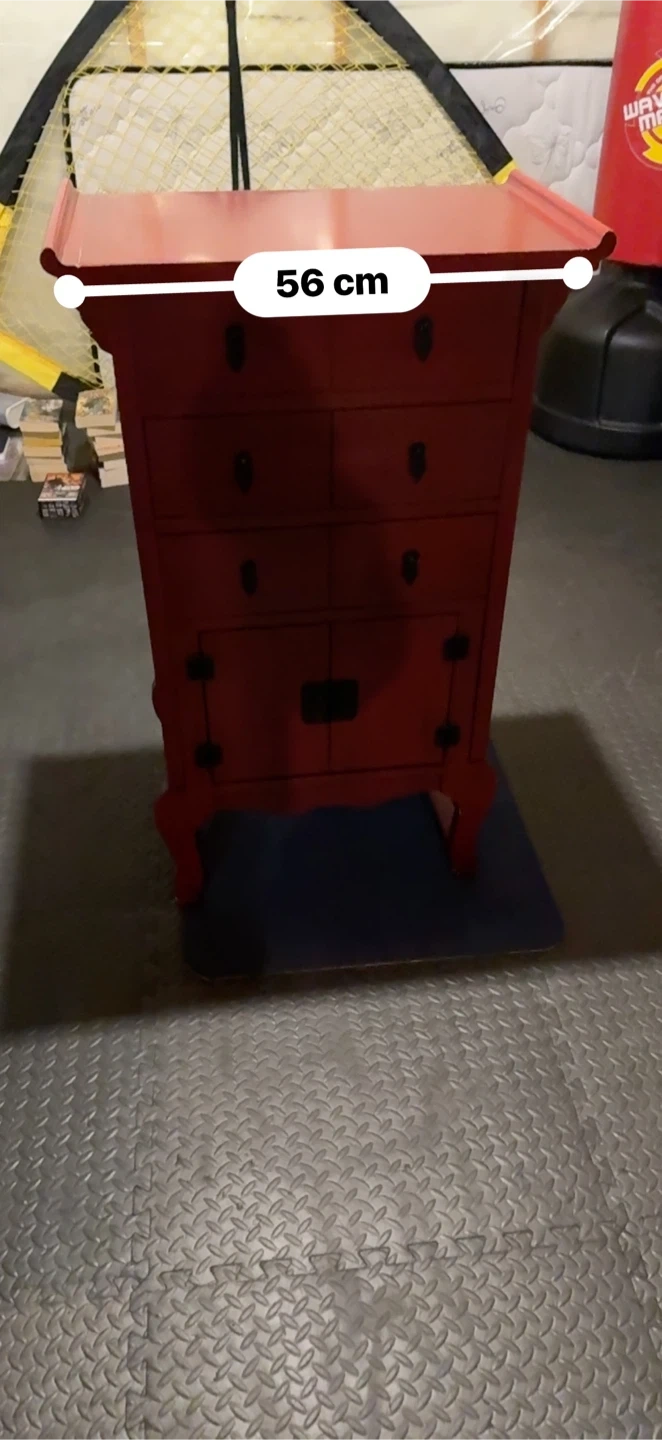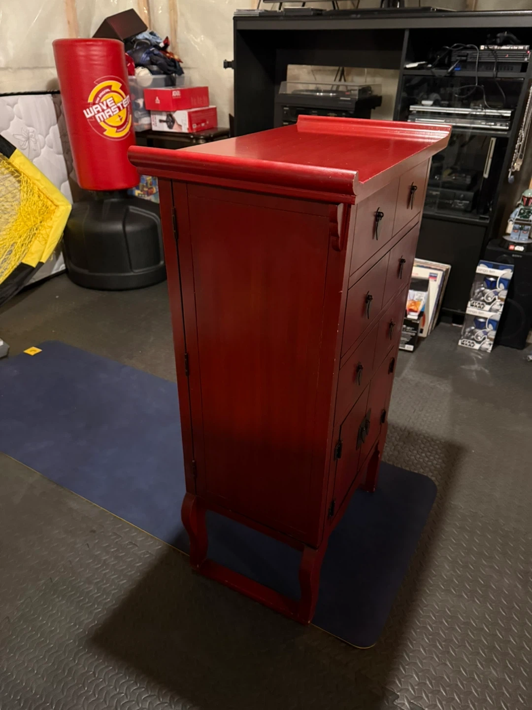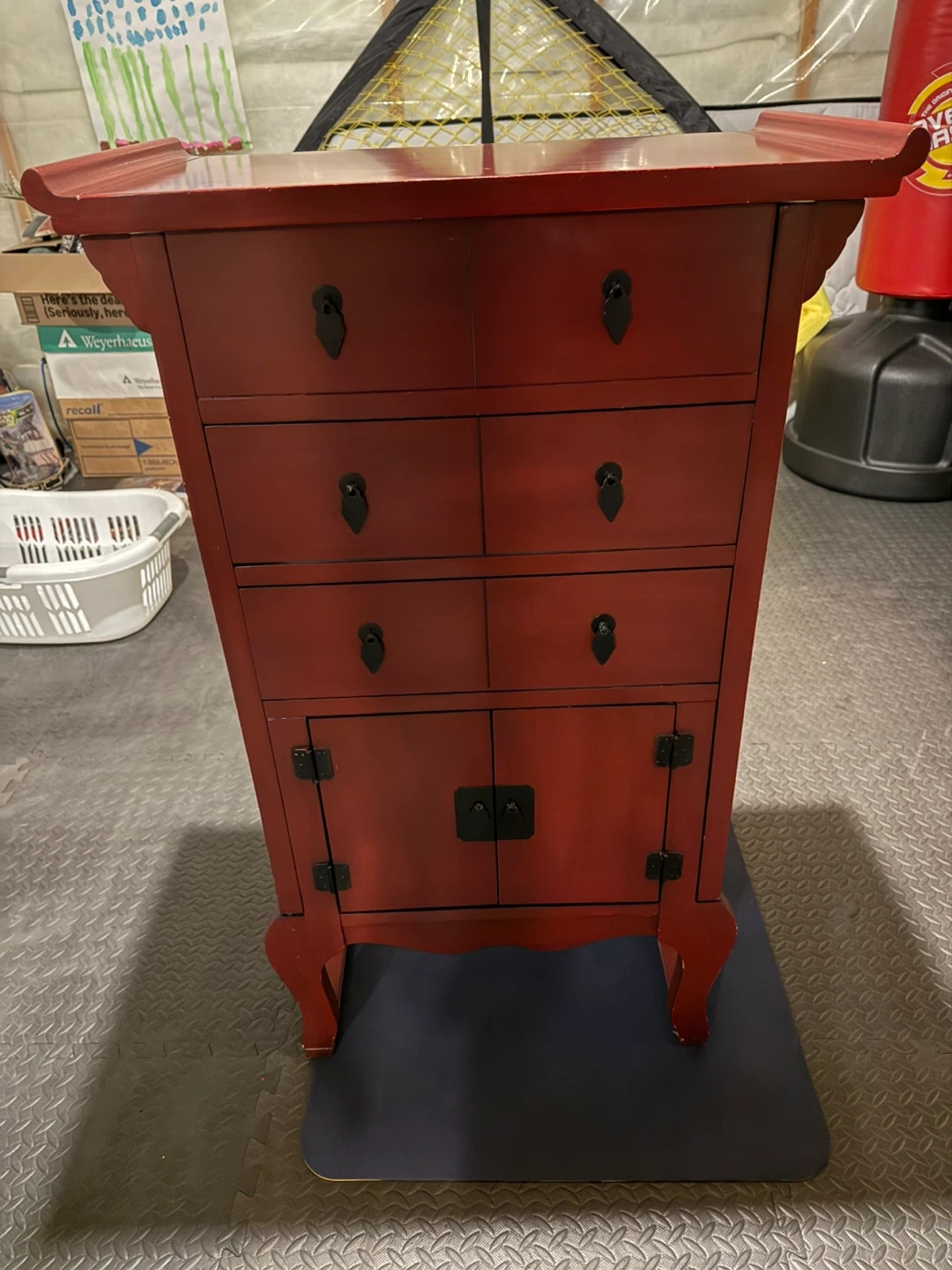 Selling a red jewelry armoire cabinet. It features multiple drawers and compartments, including side doors with hooks for necklaces and a top compartment with a mirror. The interior is lined with a soft, dark fabric, perfect for keeping your jewelry organized and protected