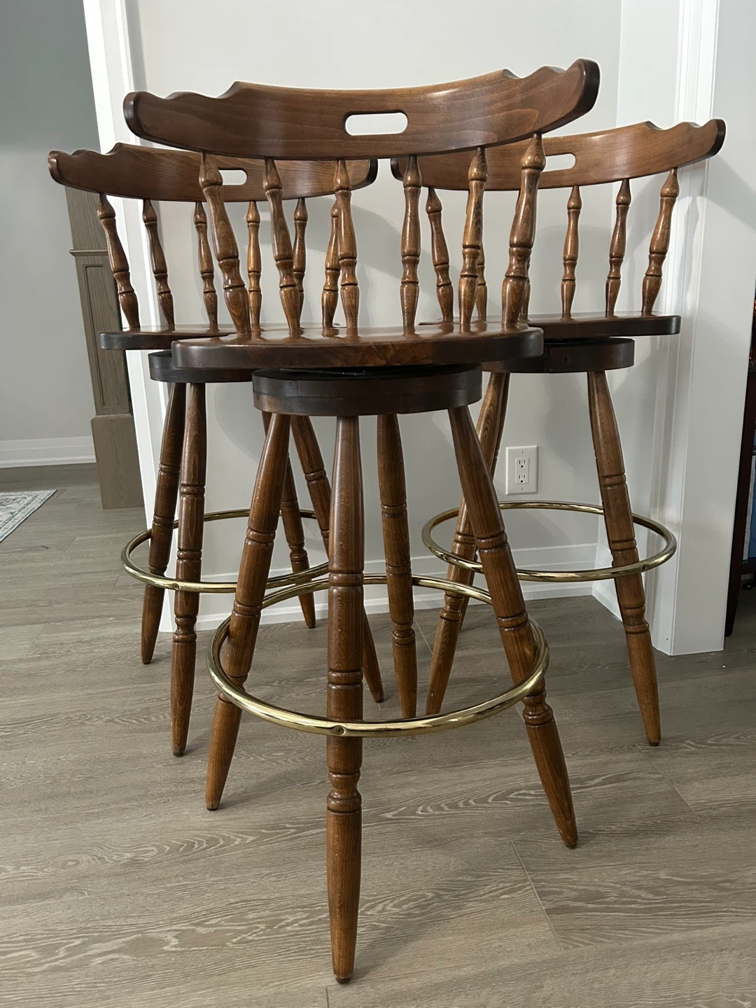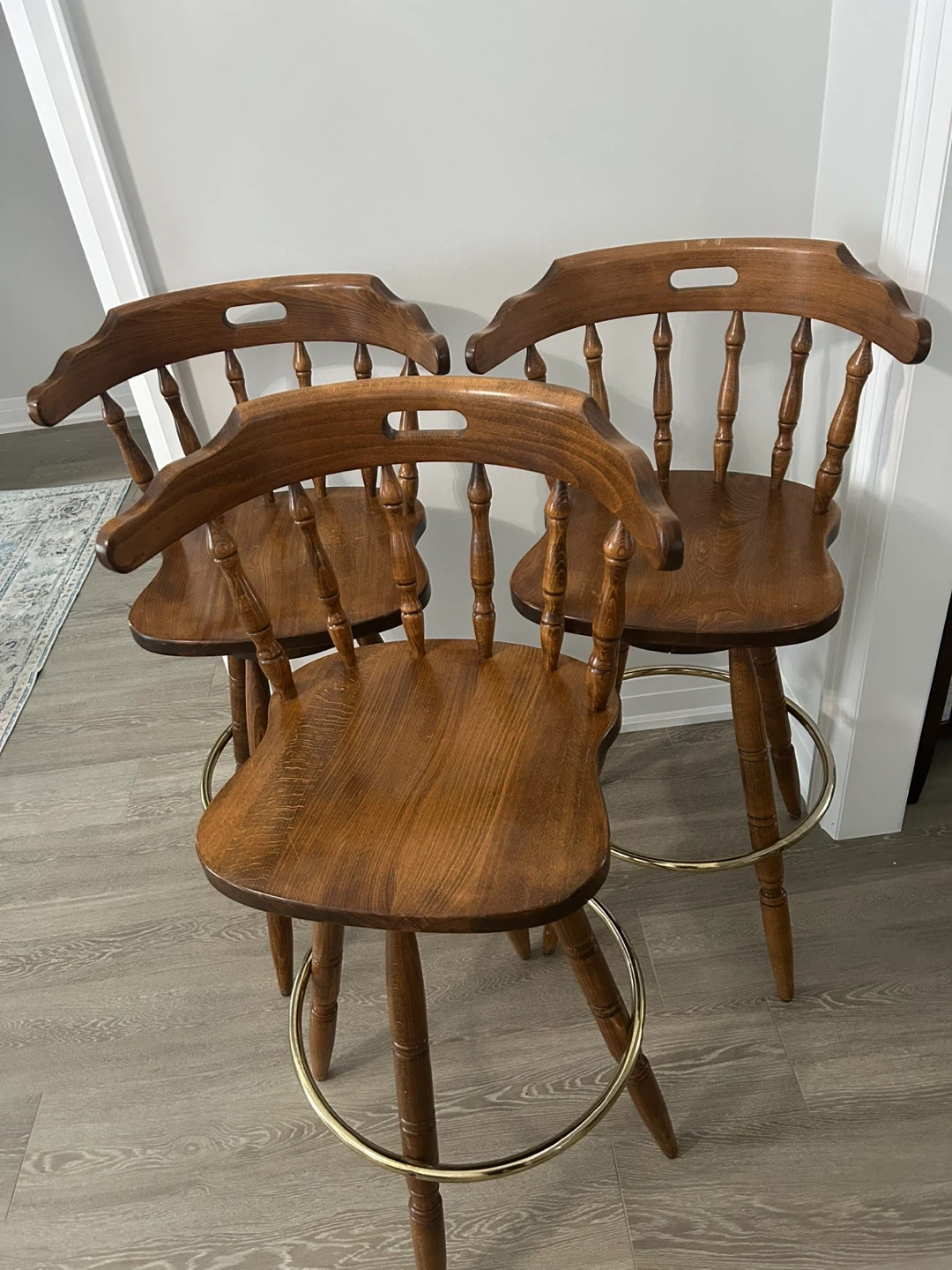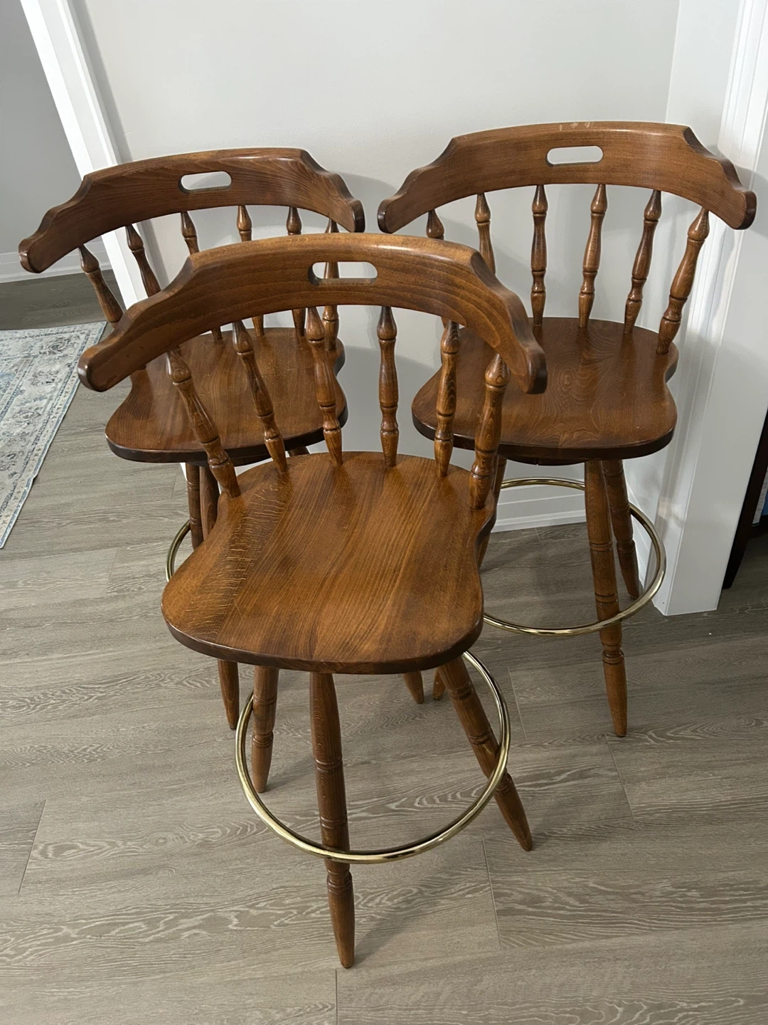 Selling a set of three beautiful wooden bar stools. They're in great shape and would look lovely in any kitchen or bar area!