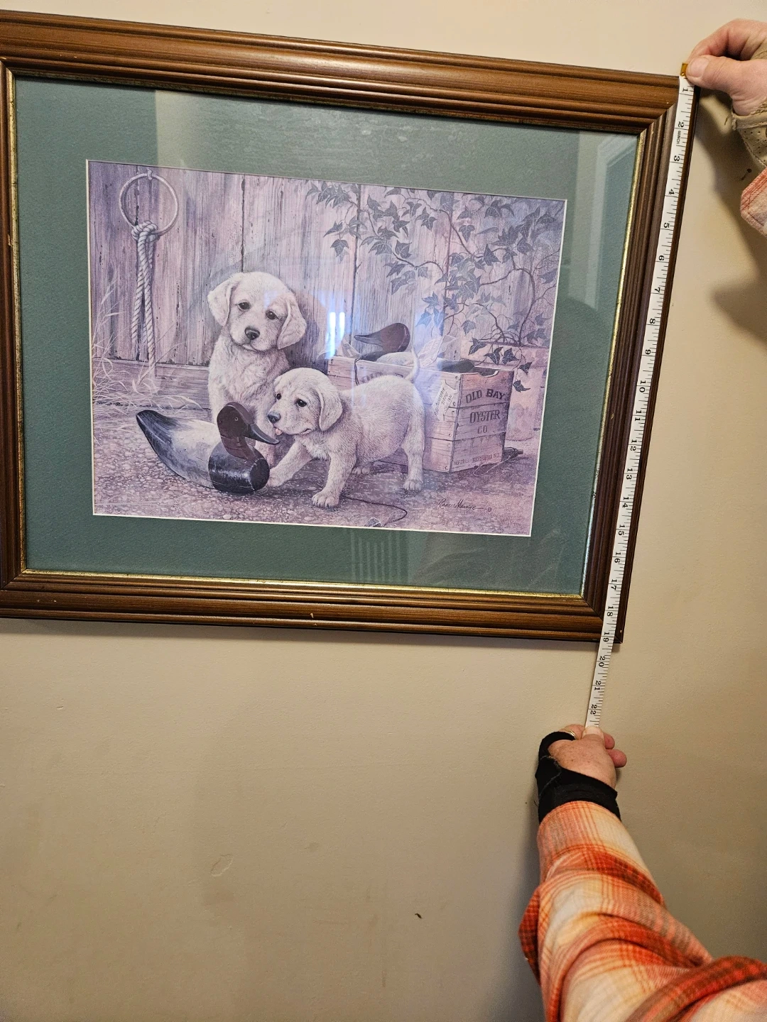 Framed print featuring adorable puppies with a duck. The frame measures approximately 22 inches in height and 24 inches in width. It's a charming piece to add to any room!