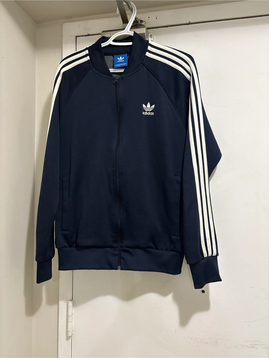 Classic Adidas track jacket in a sleek navy colour with iconic white stripes down the sleeves! It's in great condition and ready for a new owner. Perfect for workouts or casual wear. Price is firm