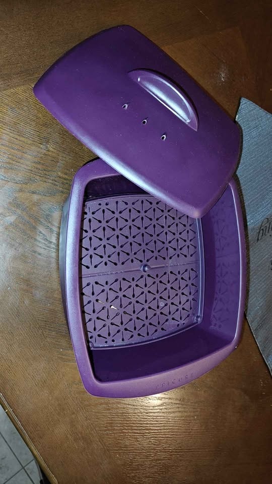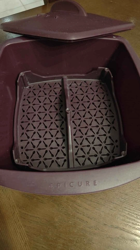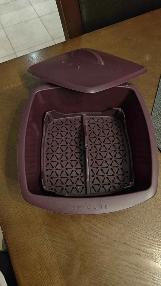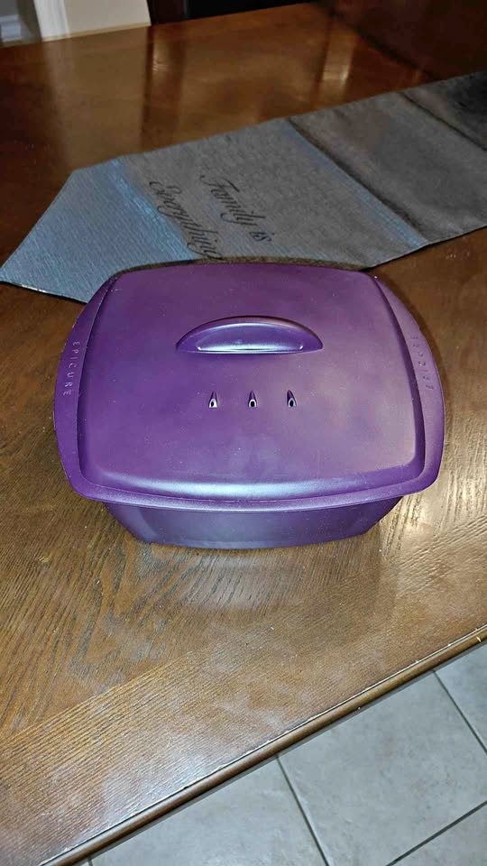 Great Epicure steamer! Purple with a lid and steamer insert. Has holes for steaming and a handle on the lid. Epicure branding on the front.