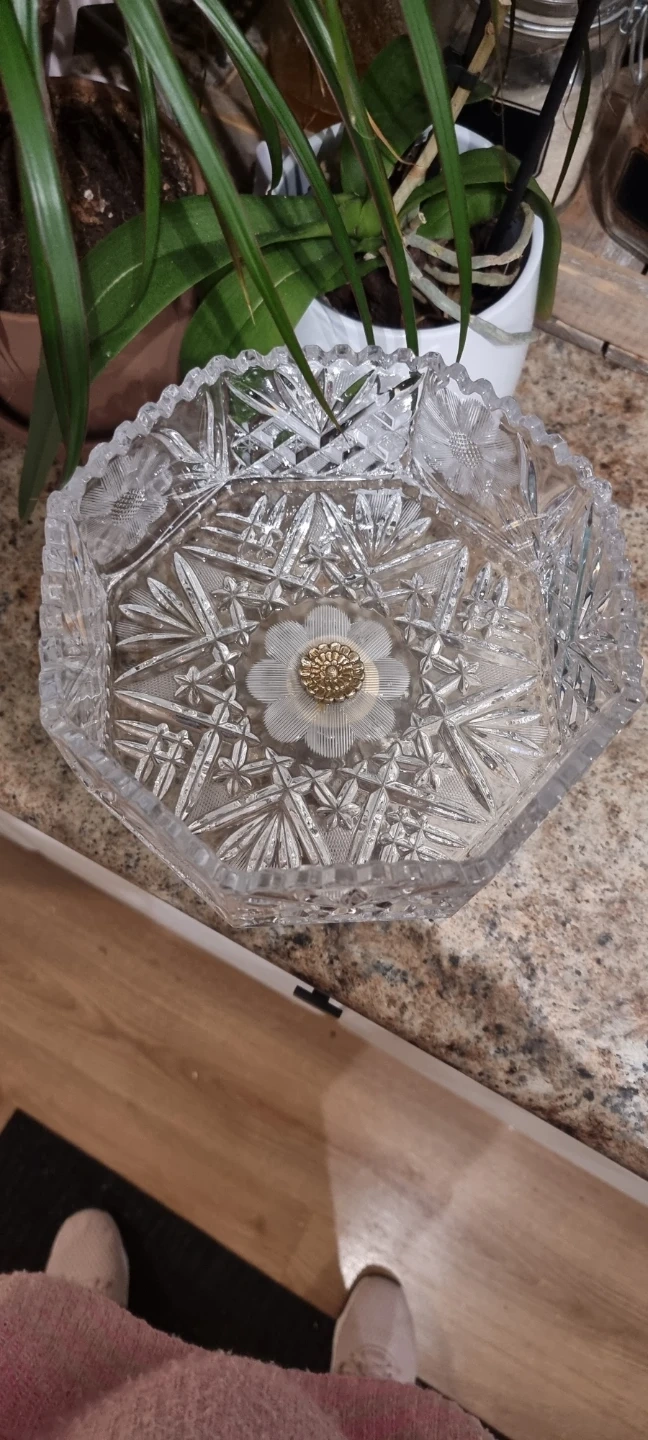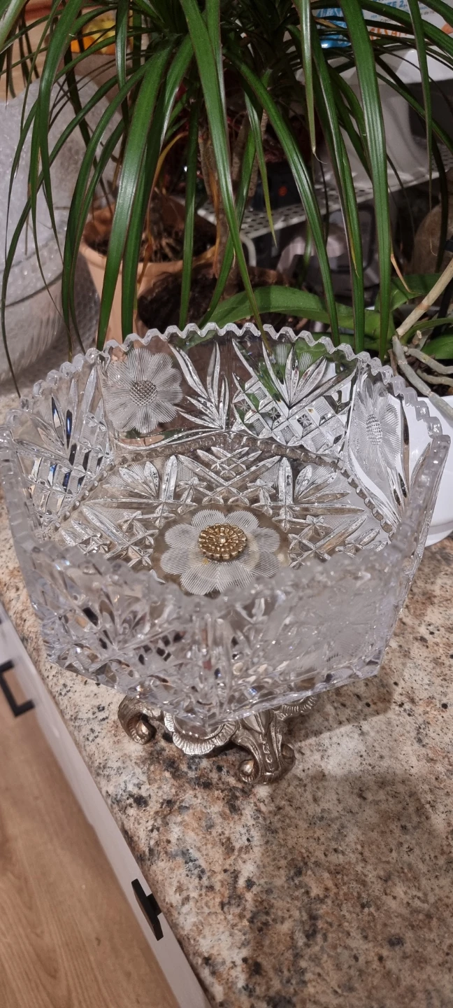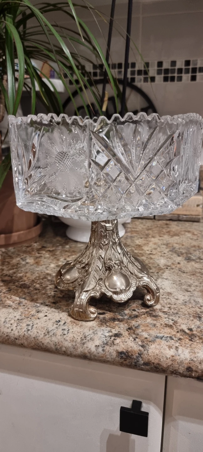 Selling a beautiful crystal glass bowl with a silver stand. It's in great condition and would make a lovely addition to any home. The intricate design and sturdy stand make it both functional and decorative
