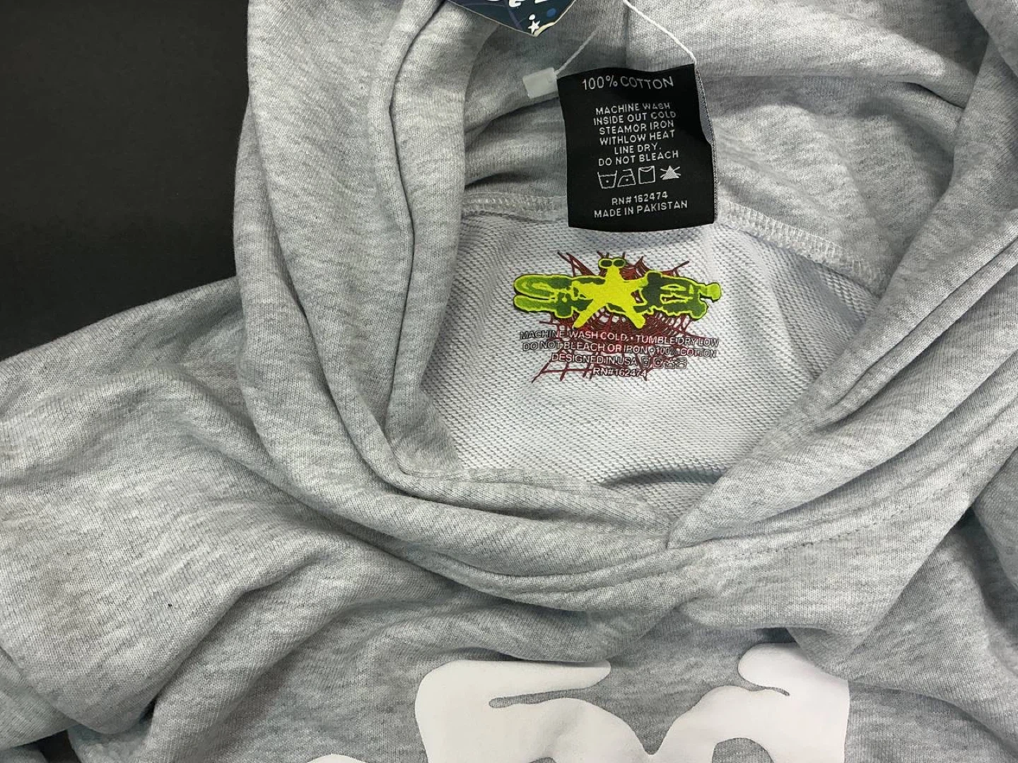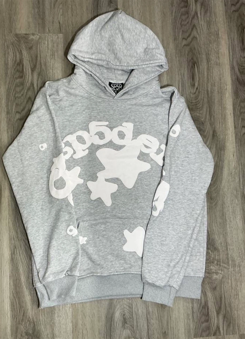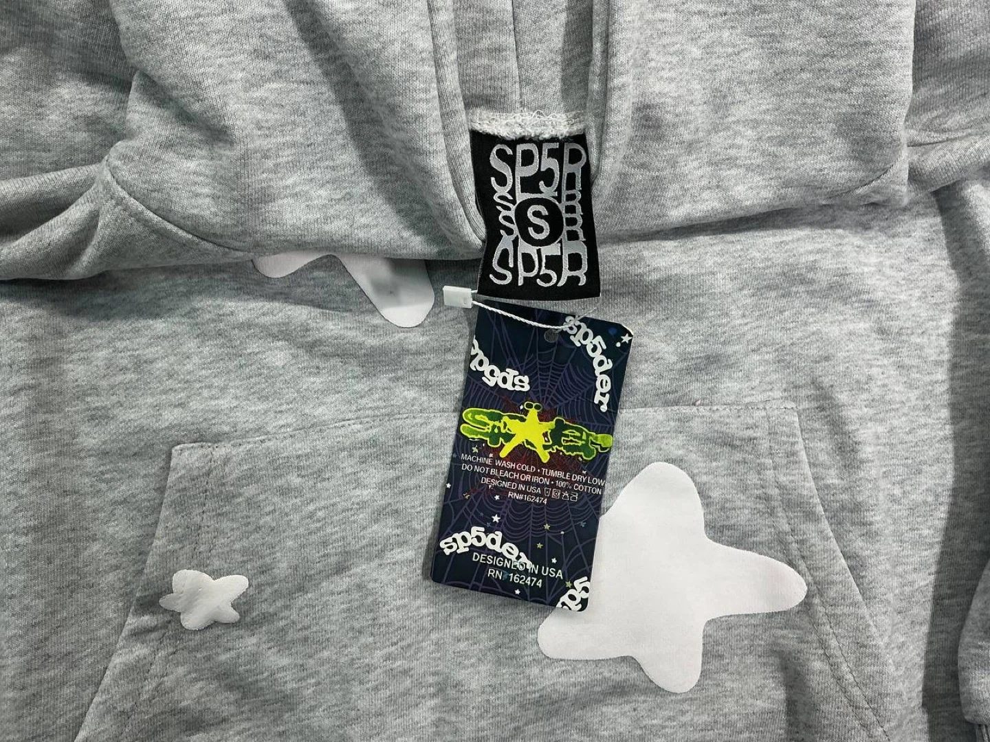 This is a brand new Sp5der hoodie in grey. It is made of 100% cotton. The hoodie features a unique design with white stars and the Sp5der logo. Perfect for staying cozy and stylish!