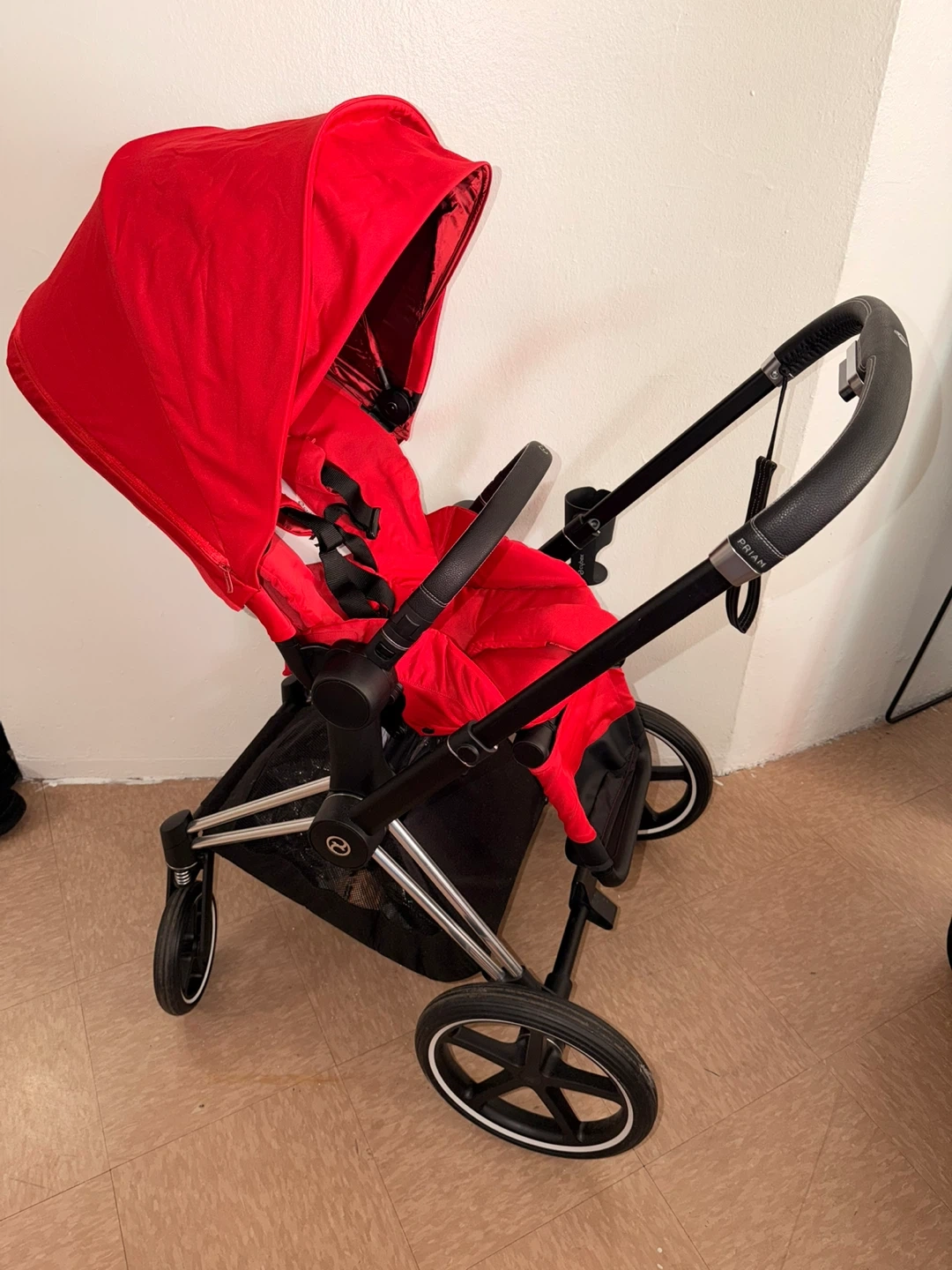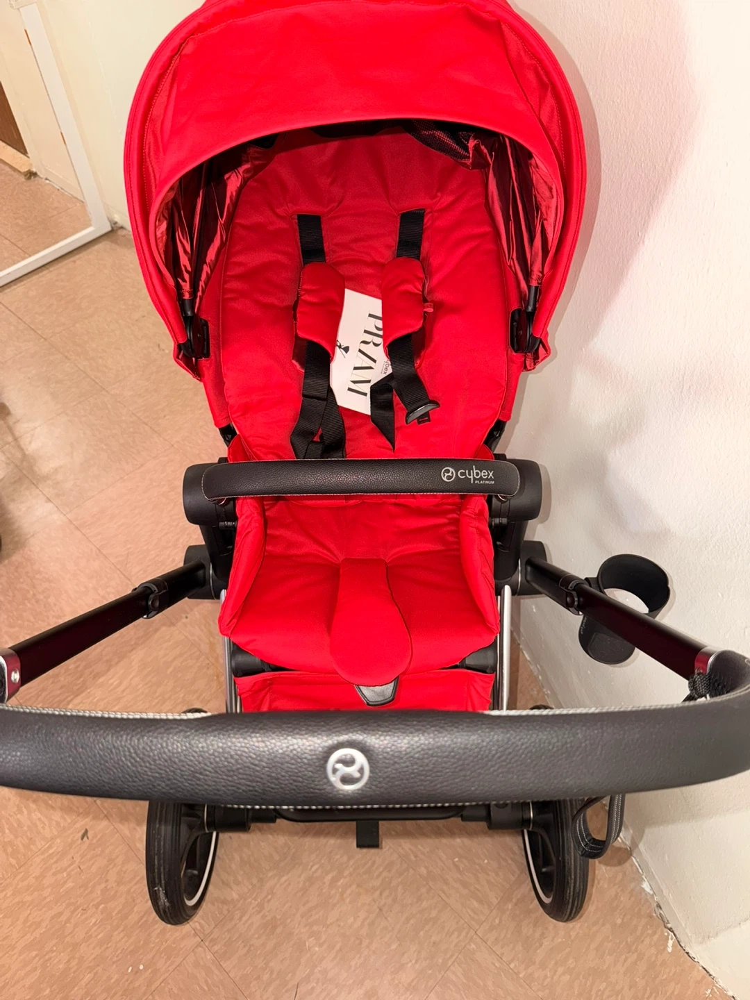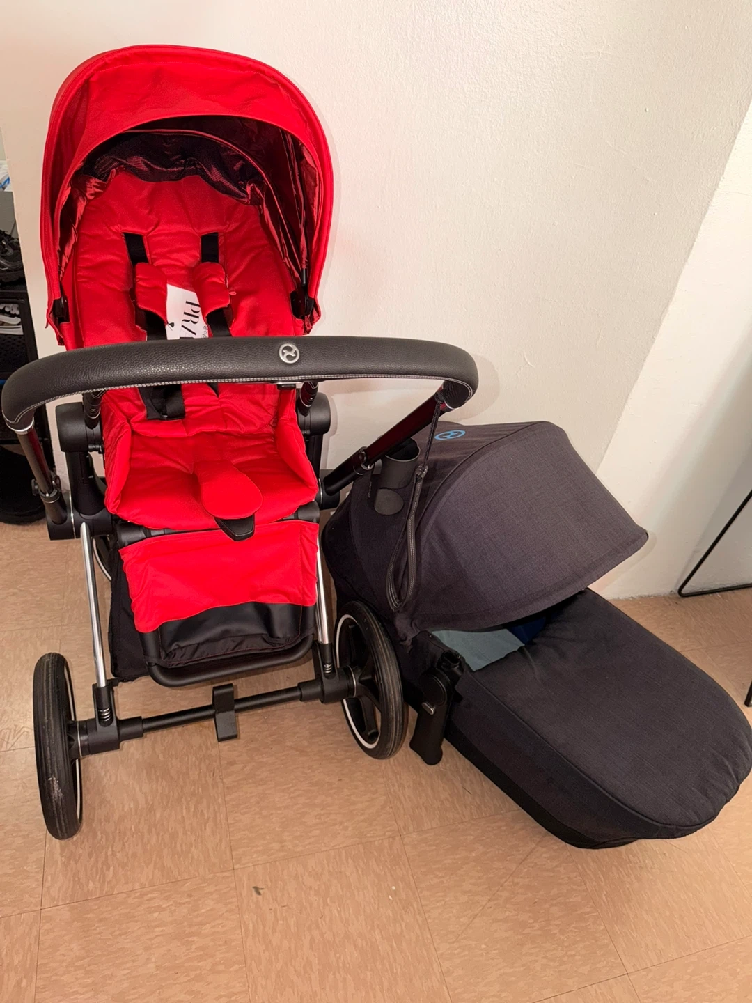 Selling a Cybex Priam stroller with the bassinet attachment. The stroller is red and the bassinet is black. It's in great condition and ready for a new family! stroller with a brand new red seat, still with tags, and a stroller frame that's only been used twice. It also comes with a brand new rain cover and a bassinet with its own rain cover. selling this stroller set, which is in great condition and has barely been used. The bassinet tag is pealing