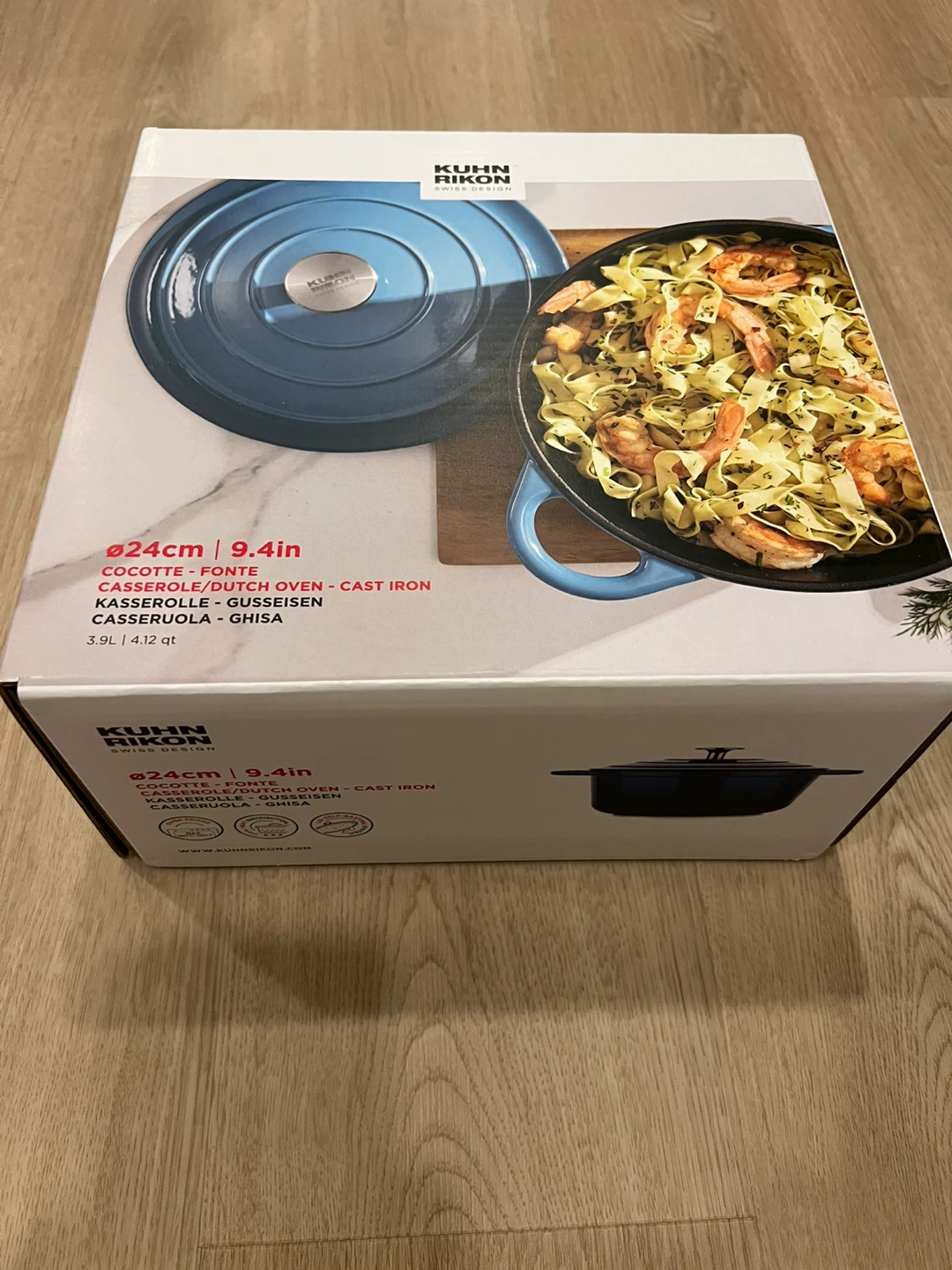 Selling a Kuhn Rikon Dutch oven, brand new in the box! This cocotte is made of cast iron and is 24cm (9.4in) in diameter. It has a 3.9L (4.12 qt) capacity, perfect for making casseroles or stews
