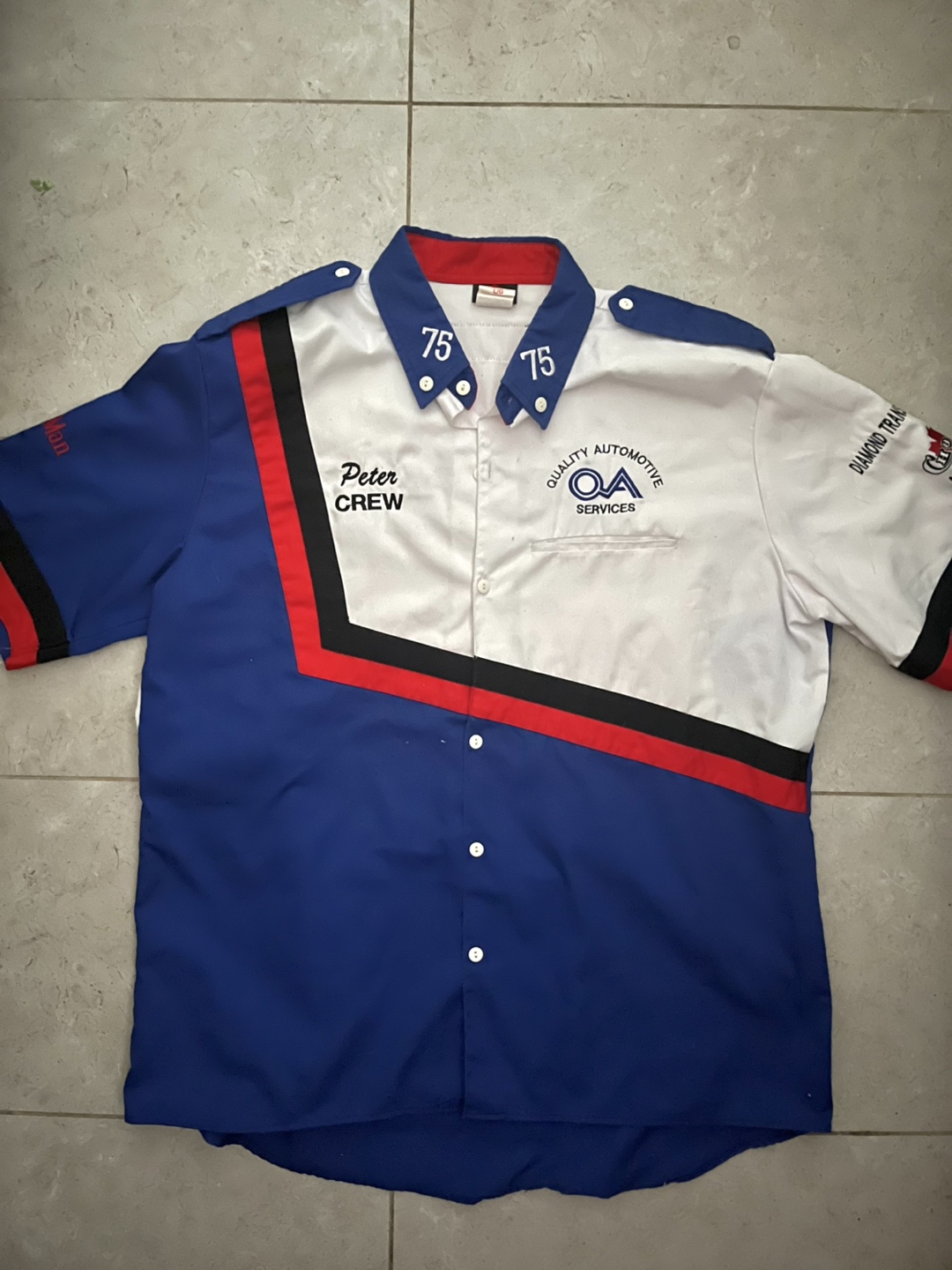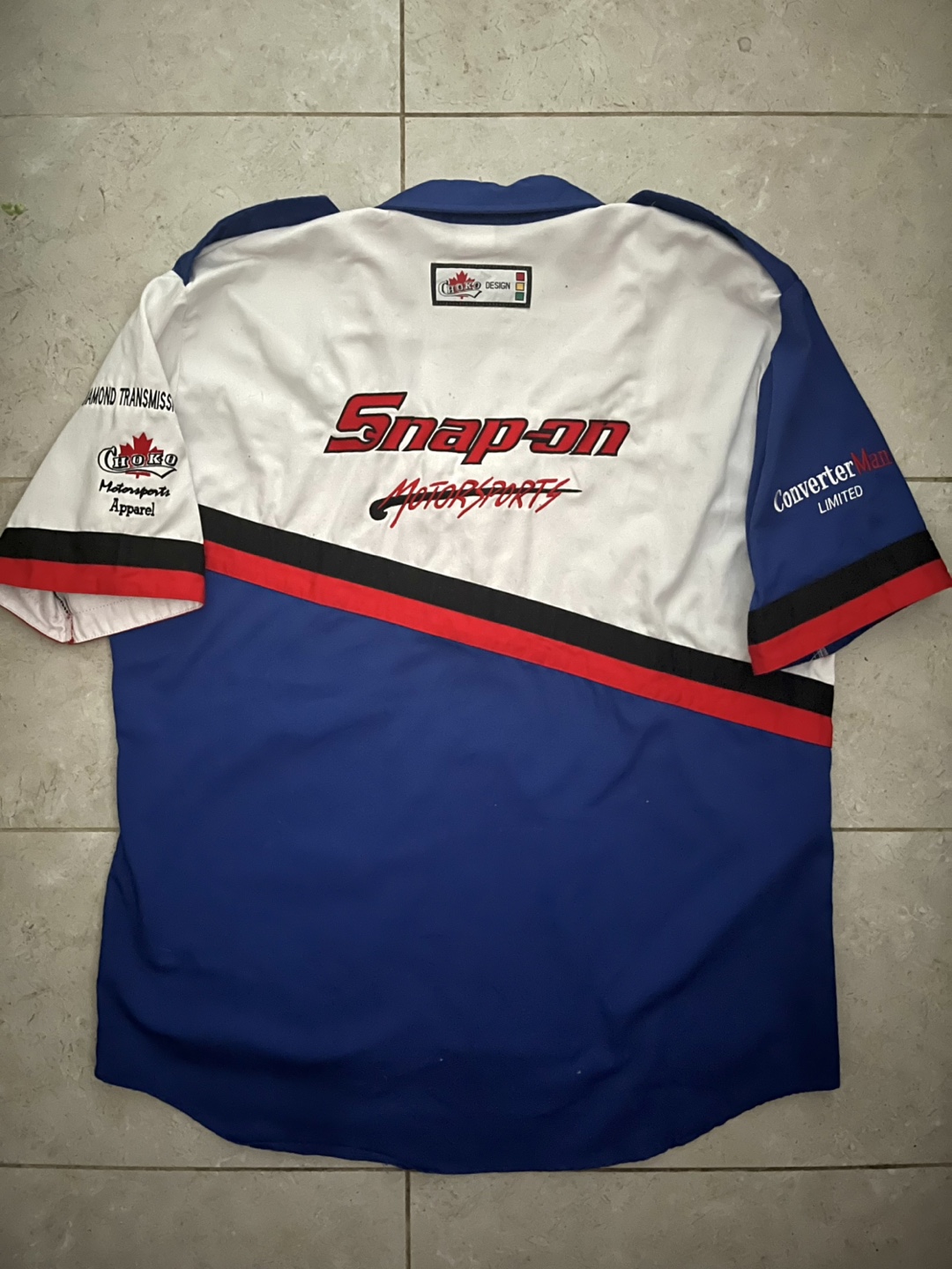 Selling a Snap-on Motorsports racing shirt. It's a short-sleeved shirt with a white and blue colour scheme, featuring the Snap-on logo and other automotive-related designs. Great for any racing fan!