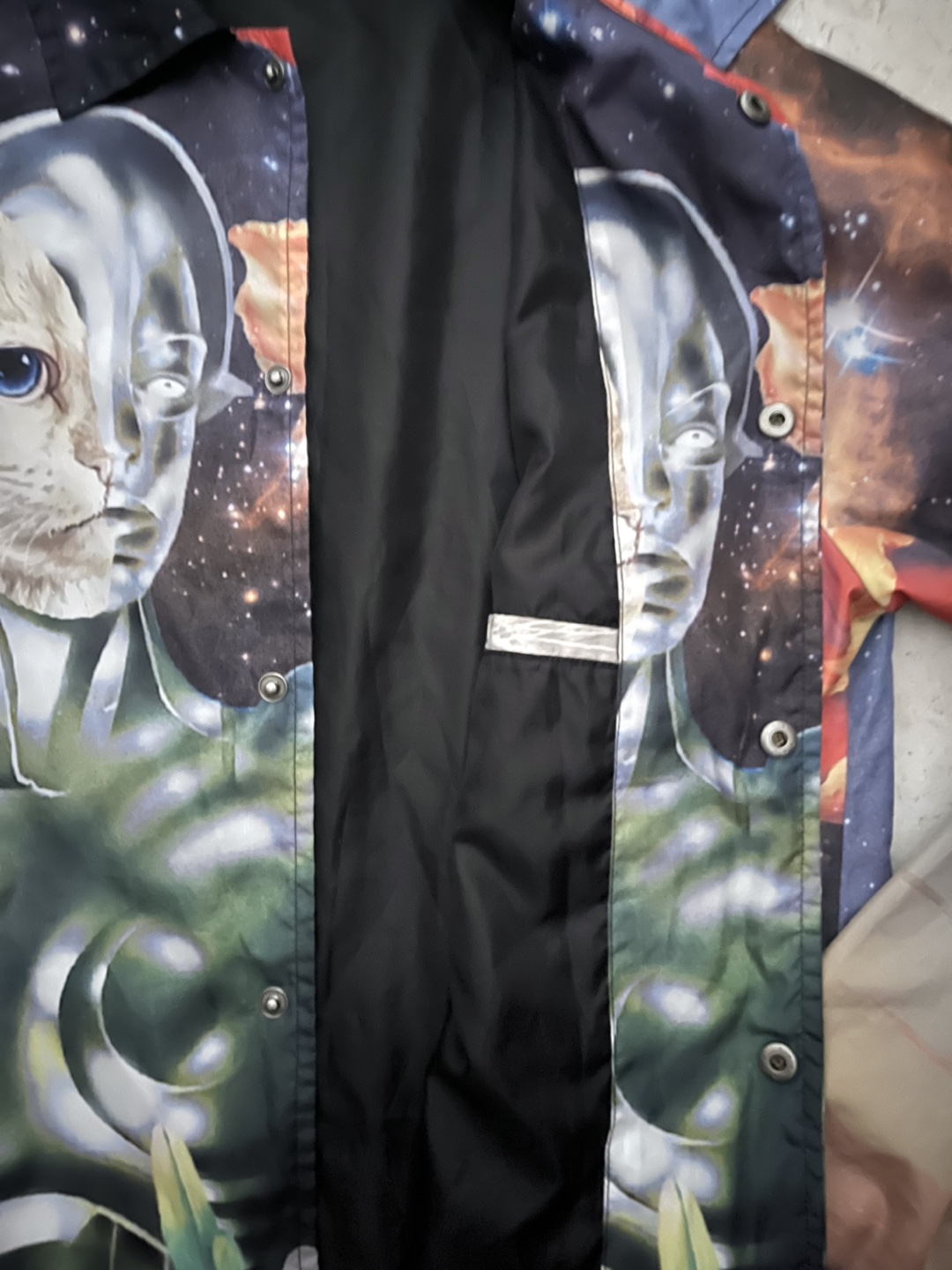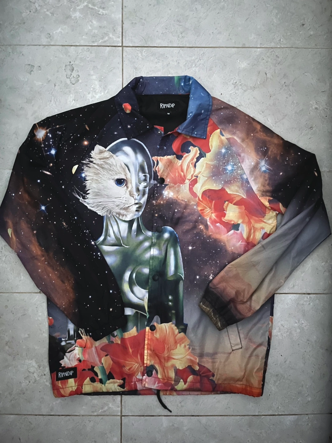 Selling a Ripndip jacket in size M. It features a unique design with a cat-robot graphic and space background. Great for adding a bit of flair to your wardrobe!