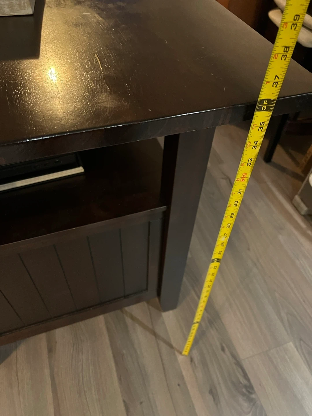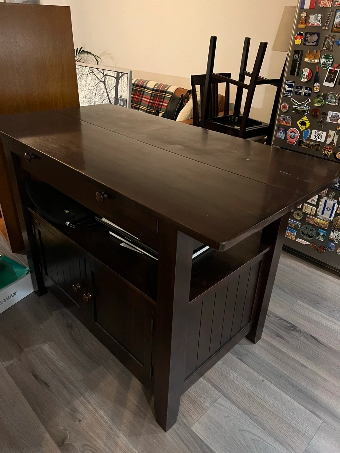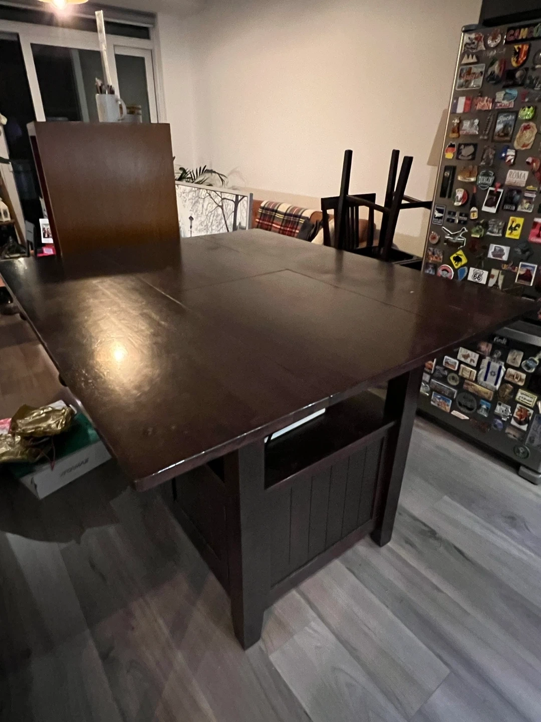 Selling a solid dark brown wood dining table. It's in good condition and has a nice, sturdy feel. The table measures approximately 54 inches in length and 30 inches in width. It also features a convenient storage cabinet underneath for extra space. No chairs.