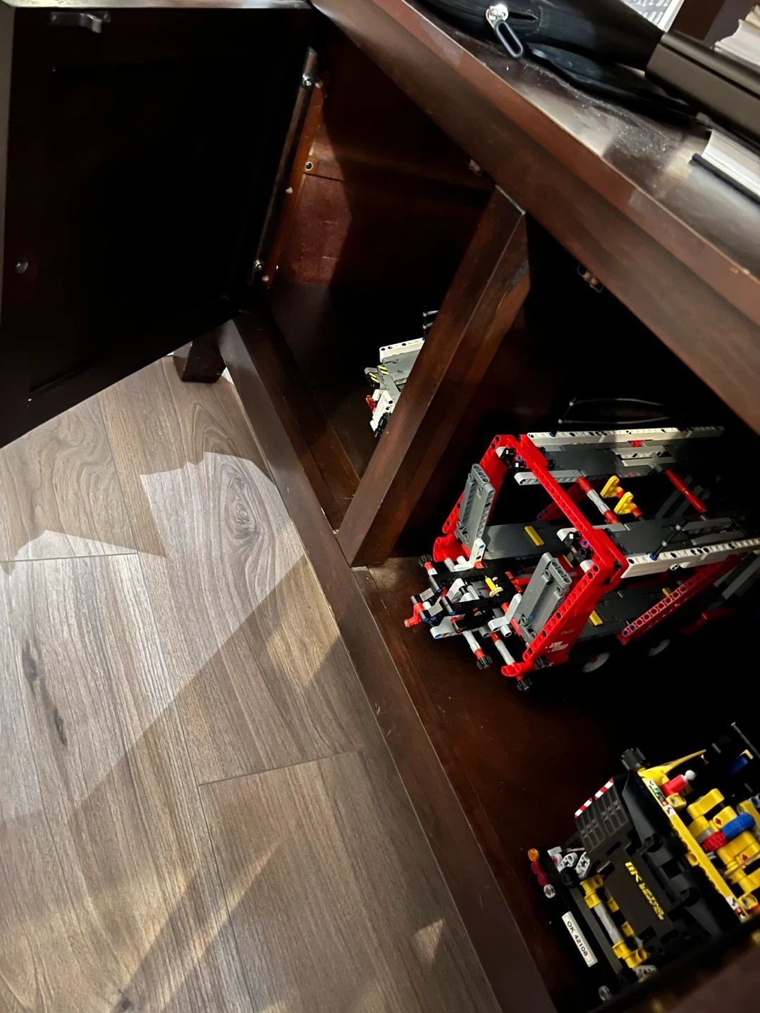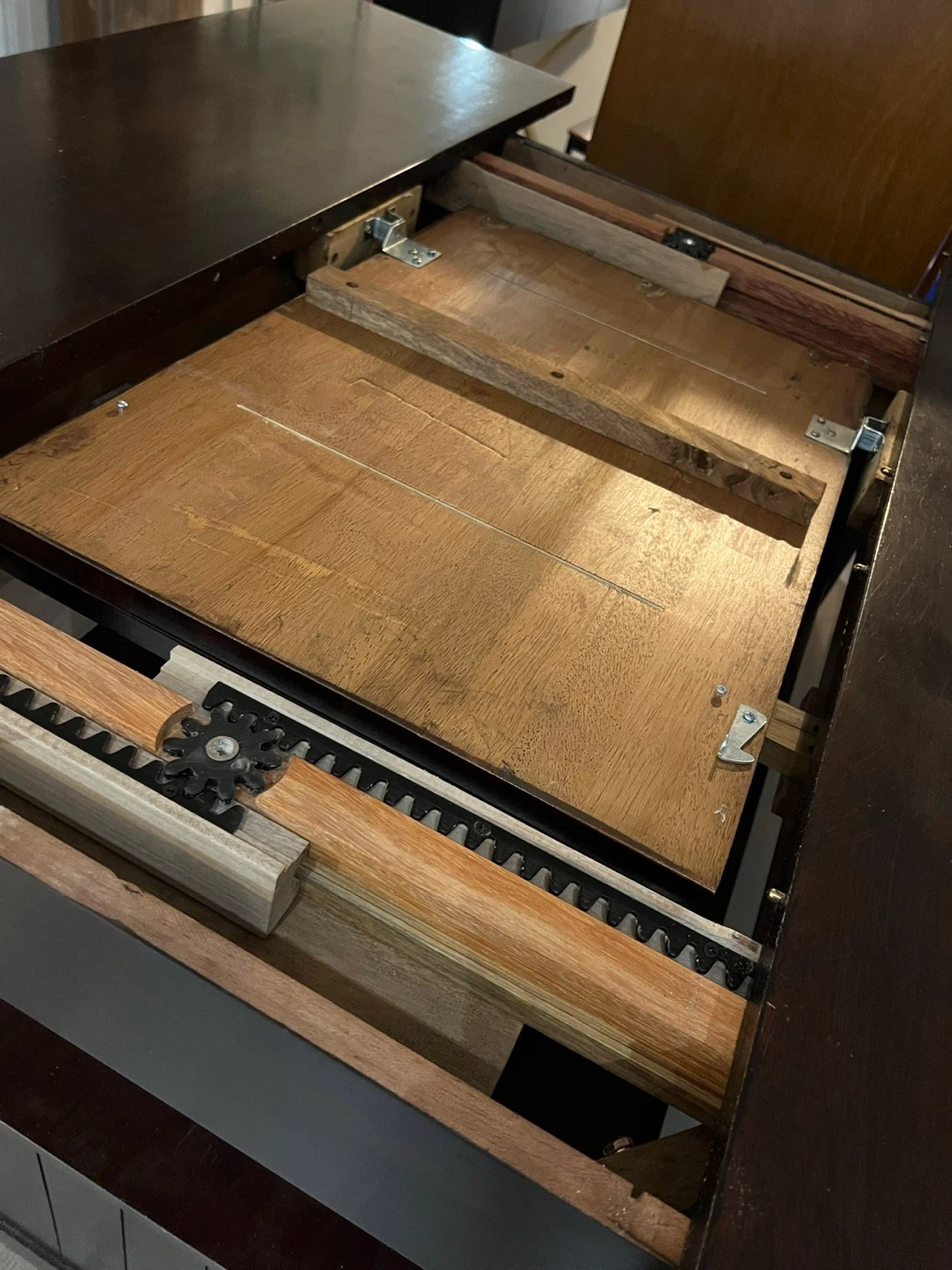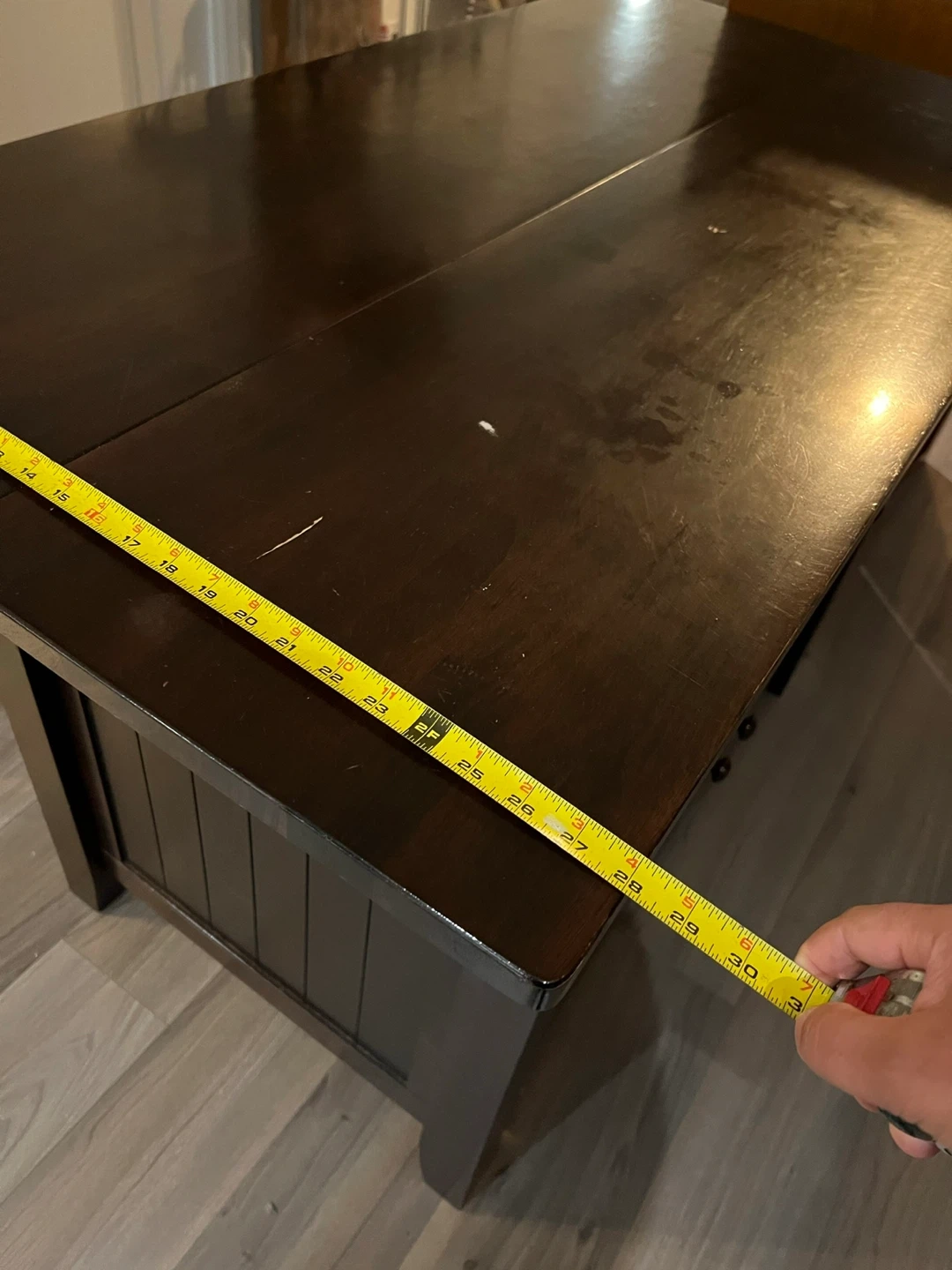 Selling a solid dark brown wood dining table. It's in good condition and has a nice, sturdy feel. The table measures approximately 54 inches in length and 30 inches in width. It also features a convenient storage cabinet underneath for extra space. No chairs.