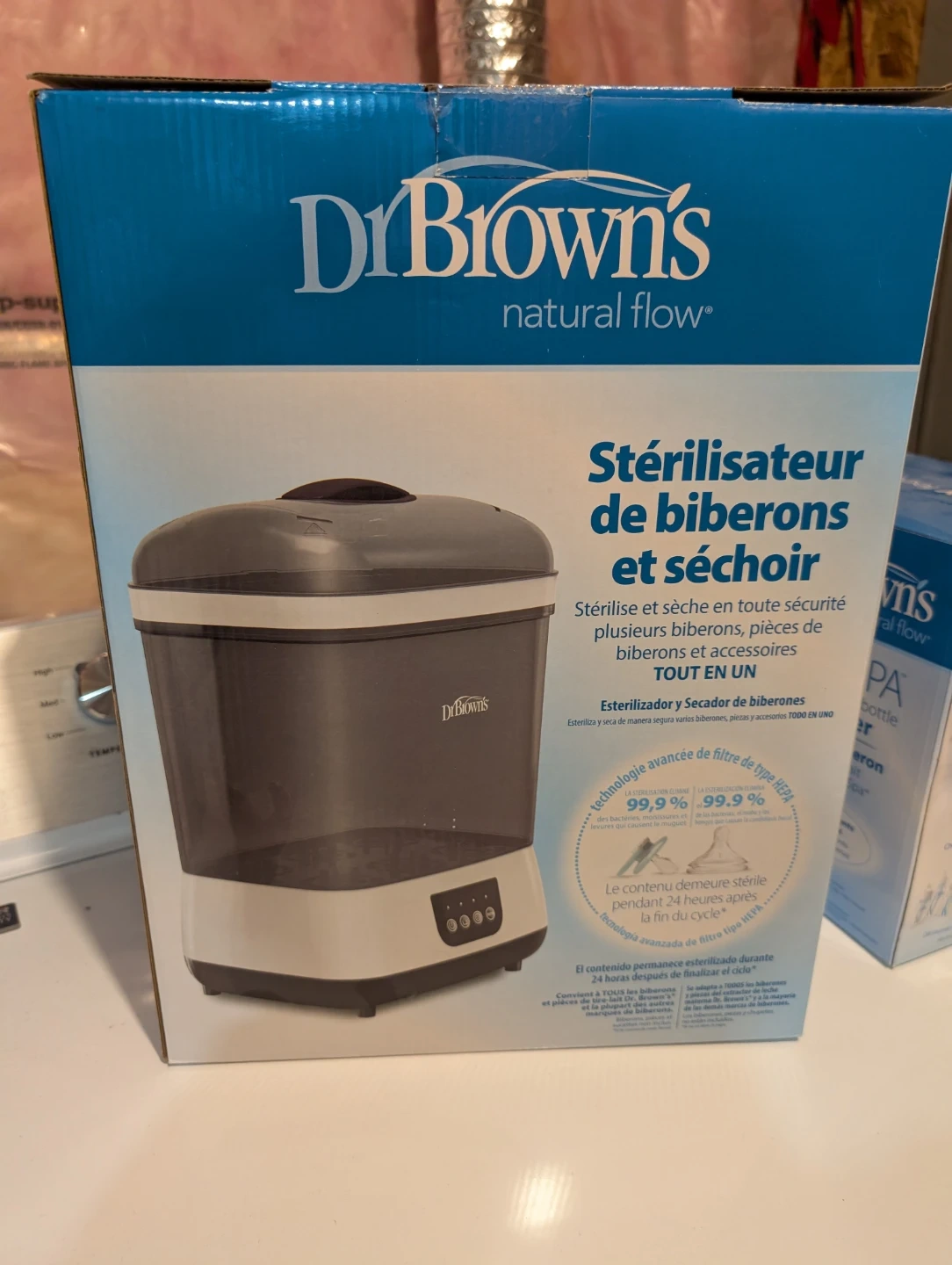 Selling a Dr. Brown's Natural Flow bottle sterilizer and dryer. It sterilizes and dries multiple bottles, bottle parts, and accessories safely and all in one unit