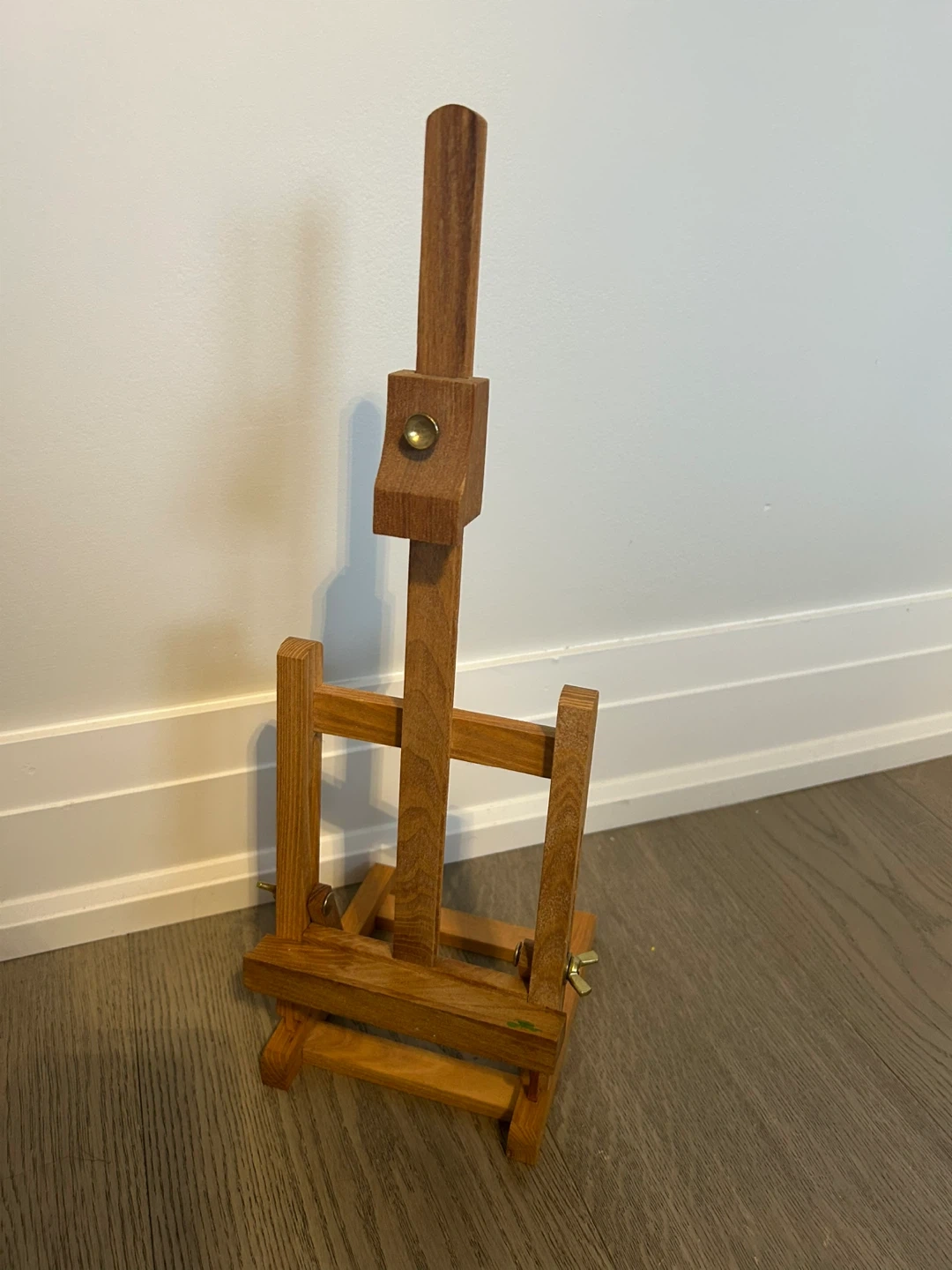 Here's a small wooden tabletop easel, perfect for displaying art or holding a canvas while you work on your next masterpiece! It's in great condition and ready for a new home.